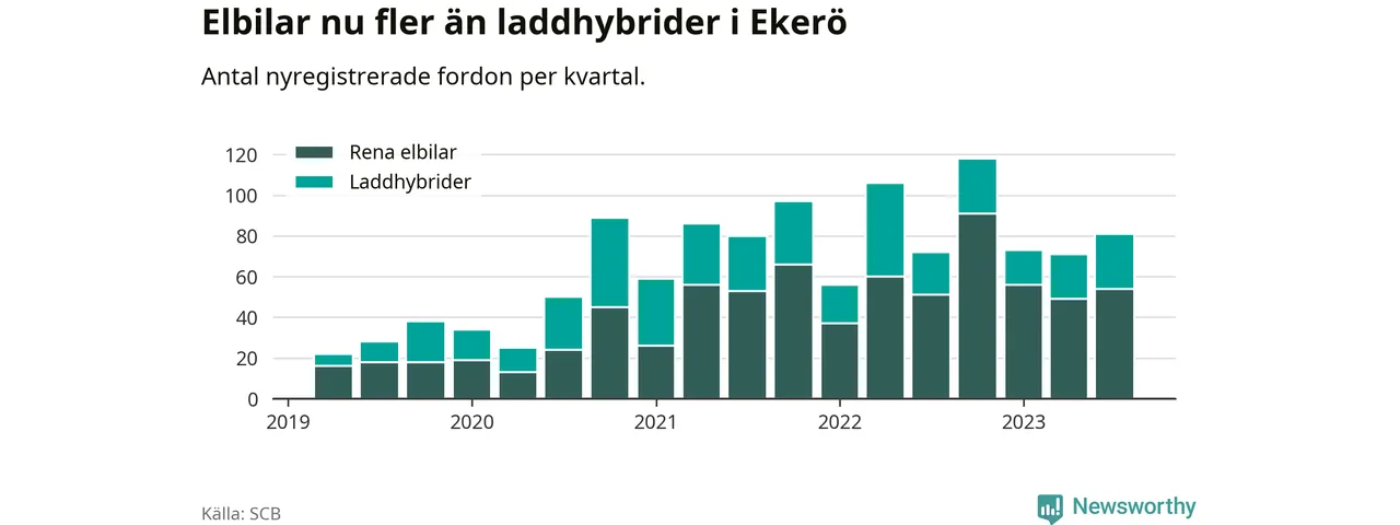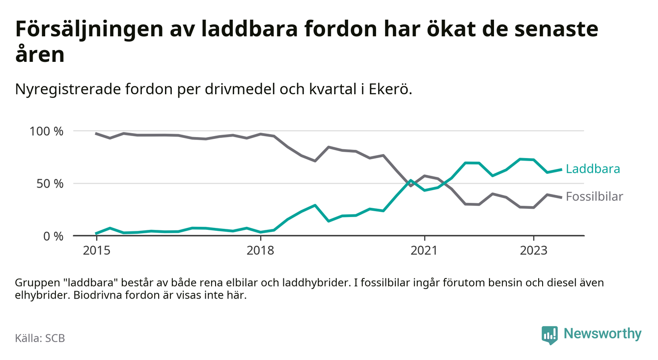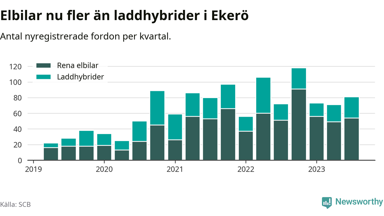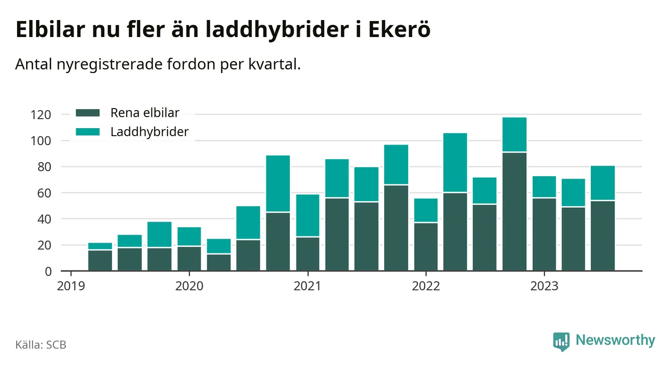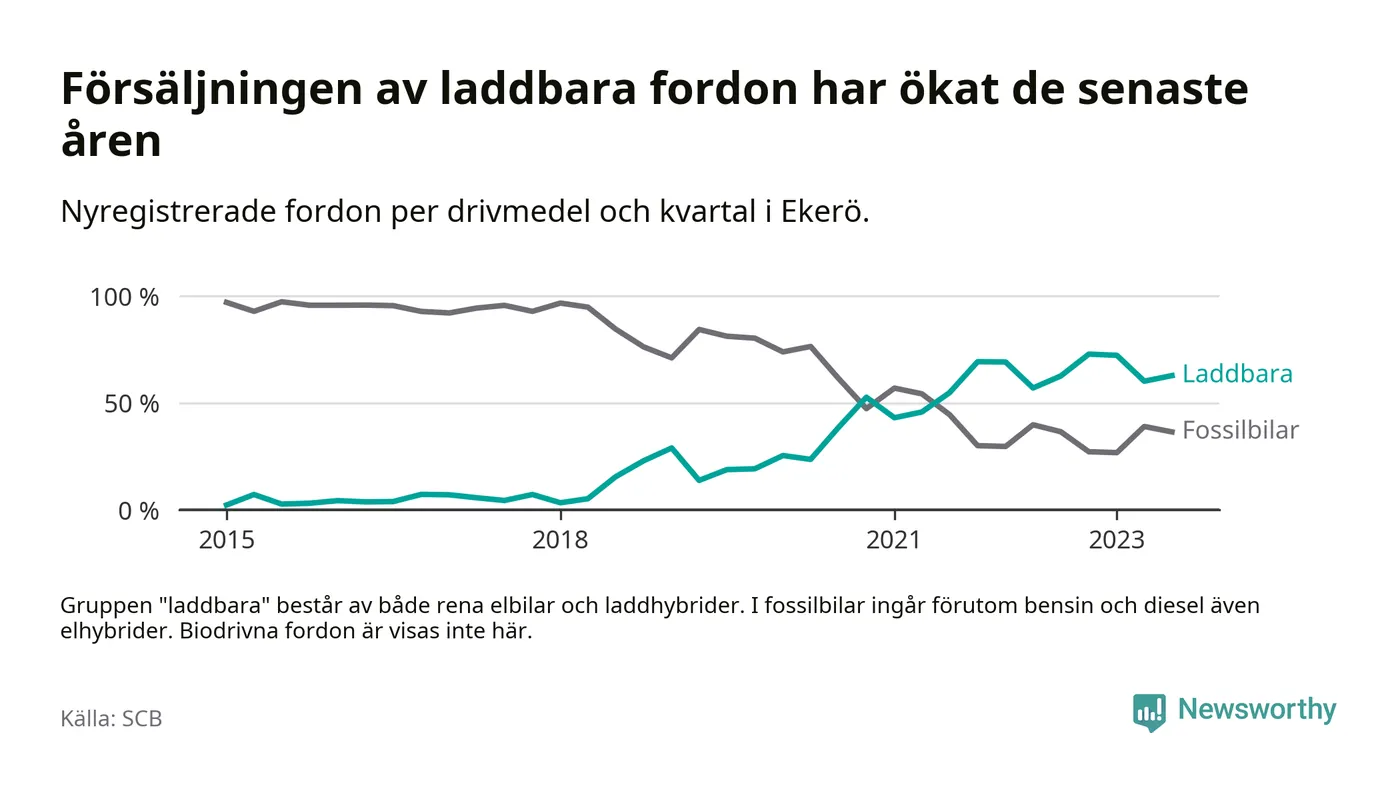 Under tredje kvartalet 2023 var 63 procent av alla nyregistrerade personbilar i Ekerö laddbara (sammanlagt registrerades 129 nya bilar). Merparten av de laddbara bilarna var rena elbilar (42 procent av alla).