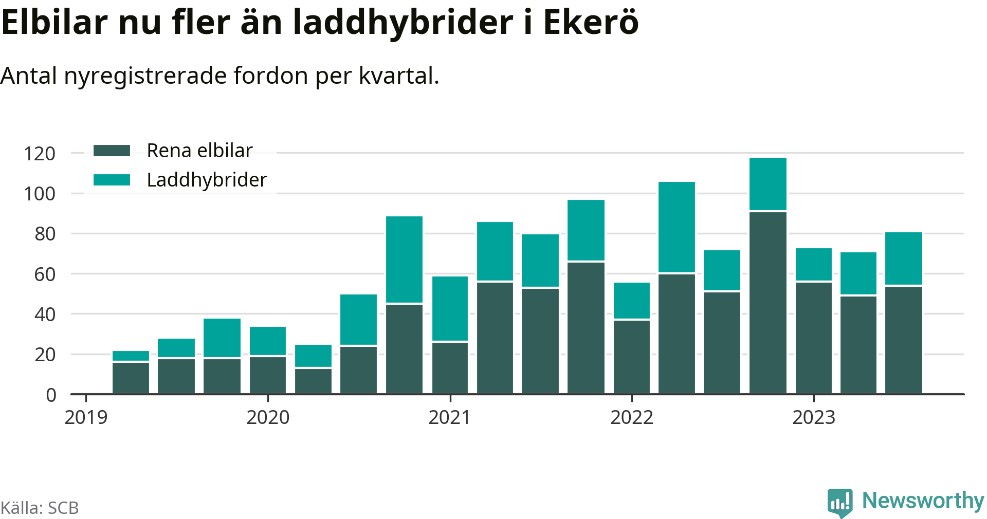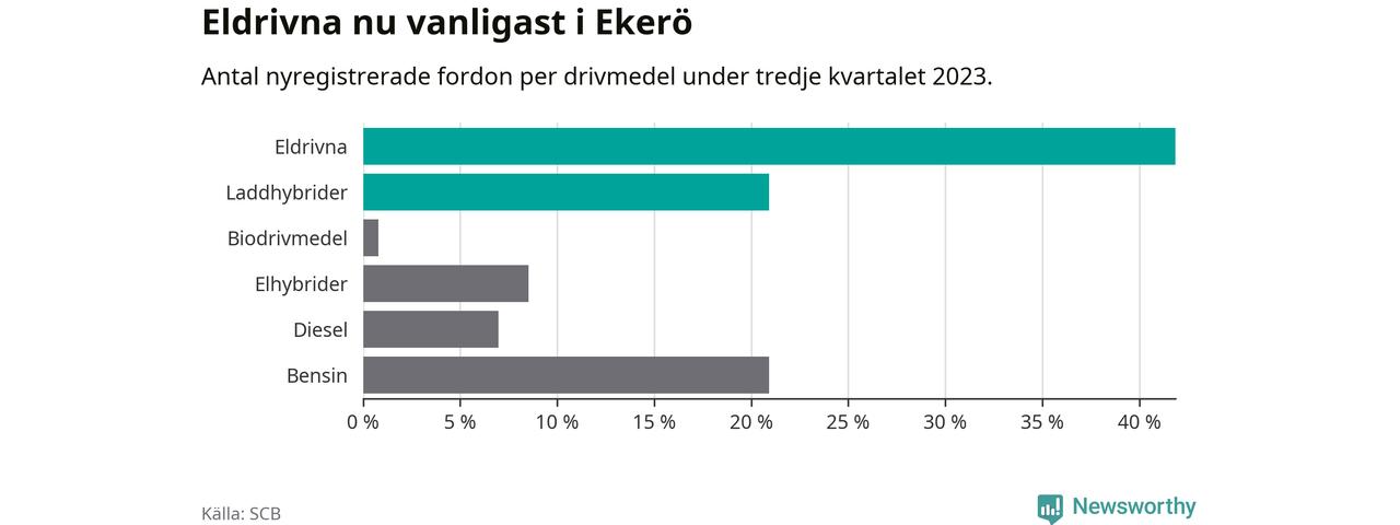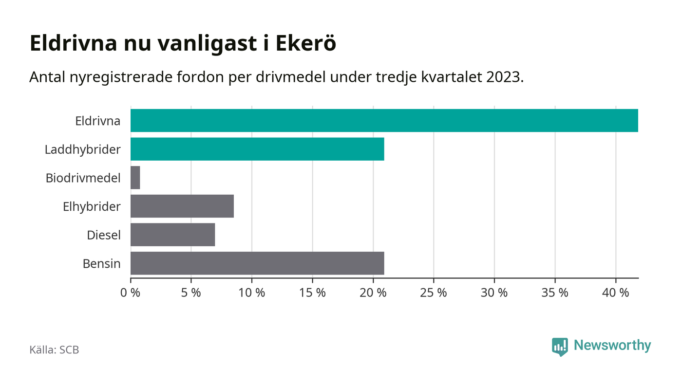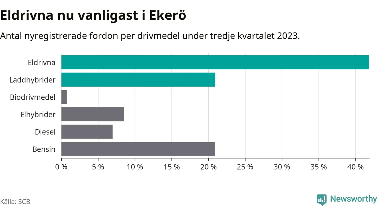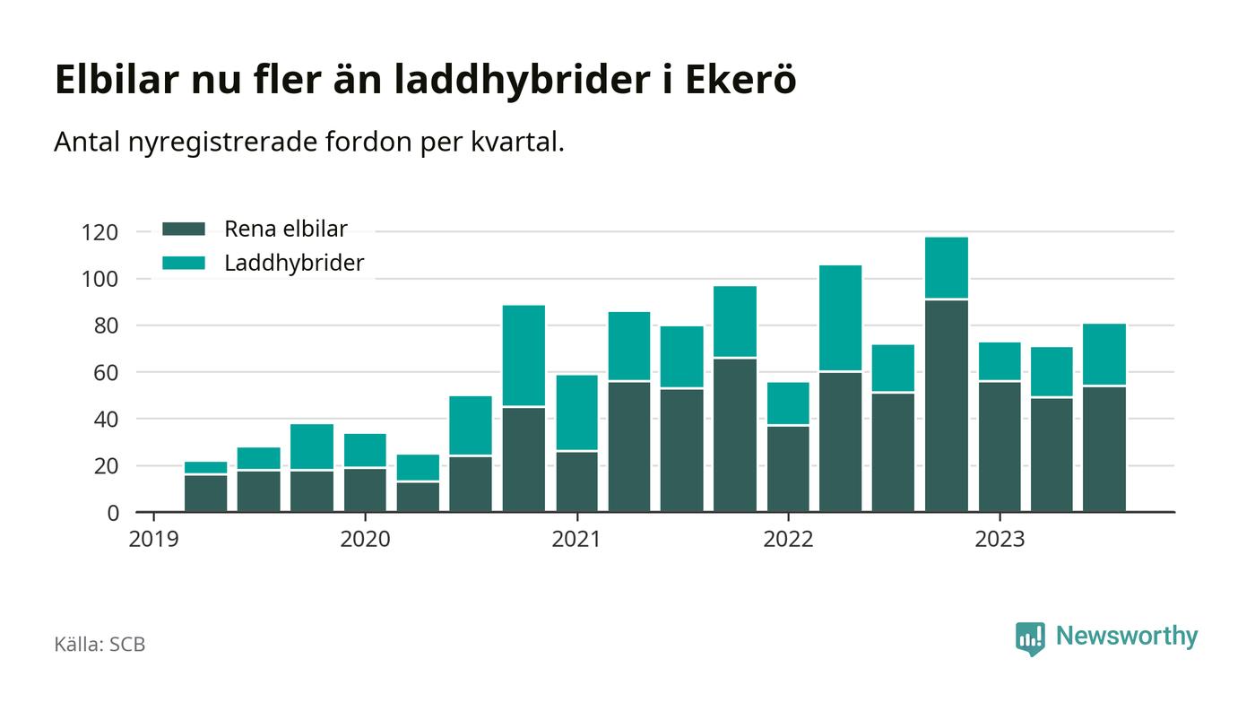 Under tredje kvartalet 2023 var 63 procent av alla nyregistrerade personbilar i Ekerö laddbara (sammanlagt registrerades 129 nya bilar). Merparten av de laddbara bilarna var rena elbilar (42 procent av alla).