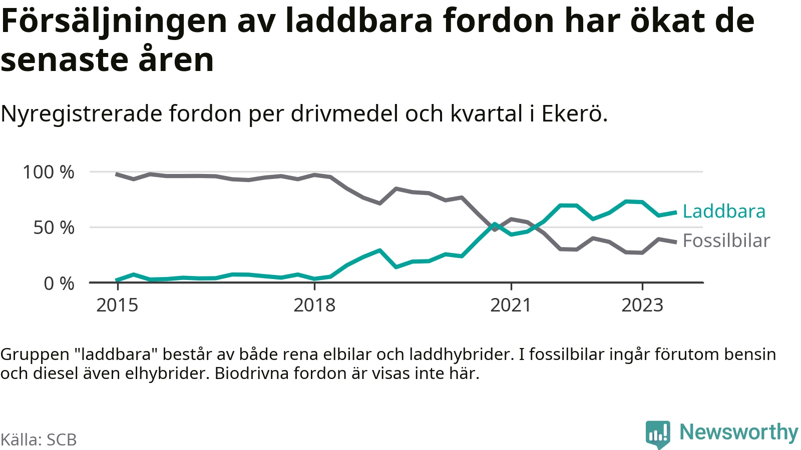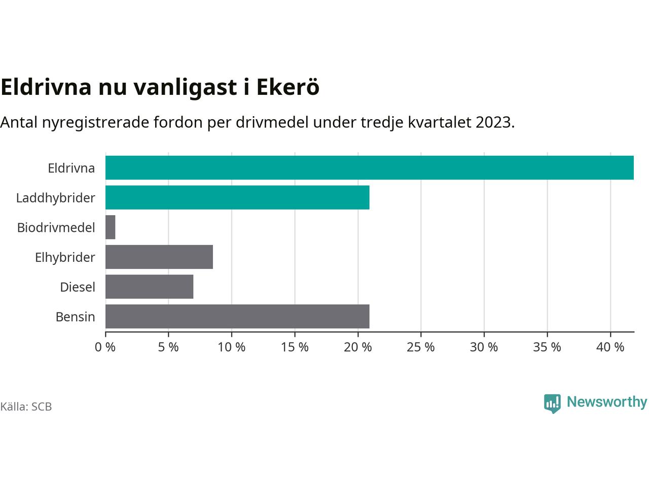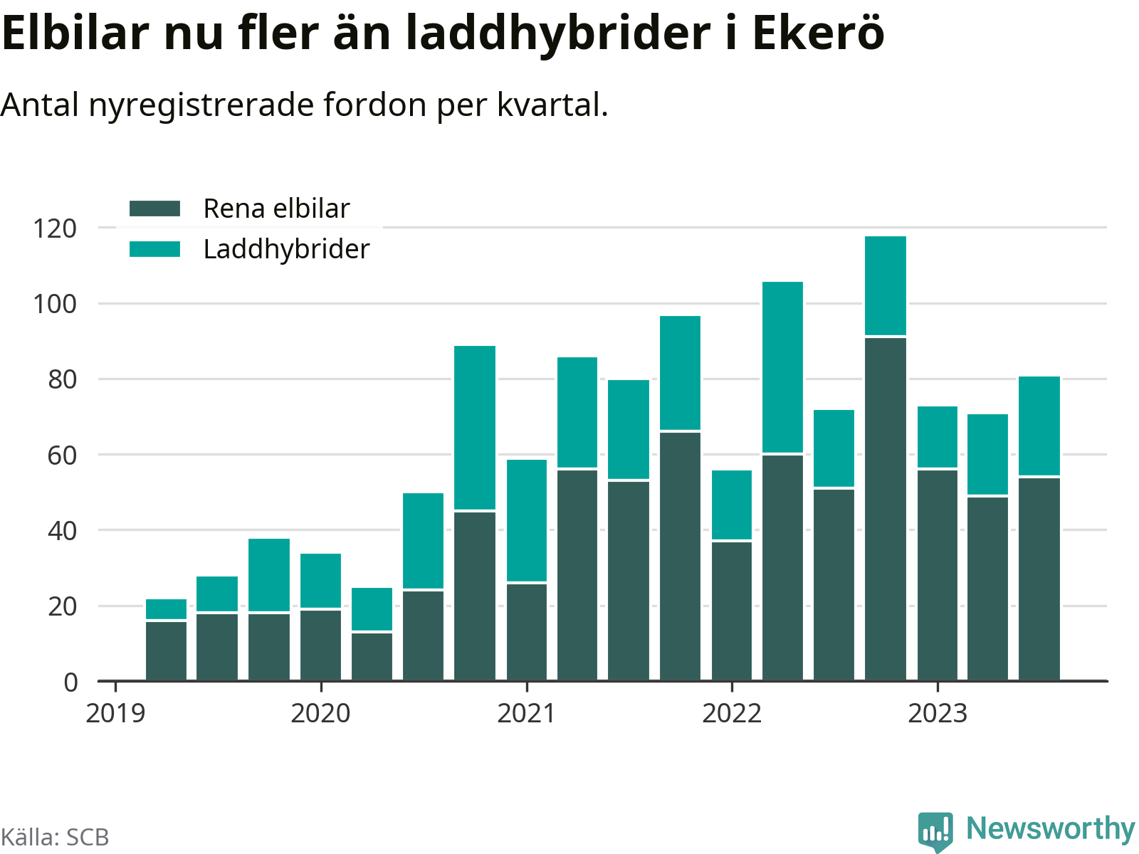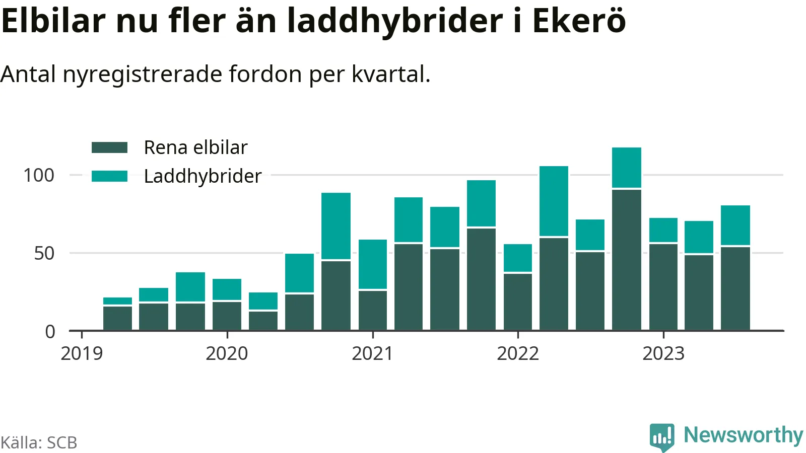 Under tredje kvartalet 2023 var 63 procent av alla nyregistrerade personbilar i Ekerö laddbara (sammanlagt registrerades 129 nya bilar). Merparten av de laddbara bilarna var rena elbilar (42 procent av alla).