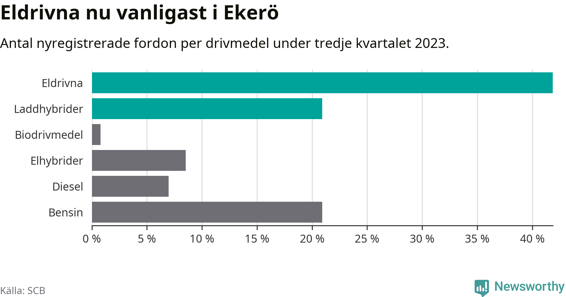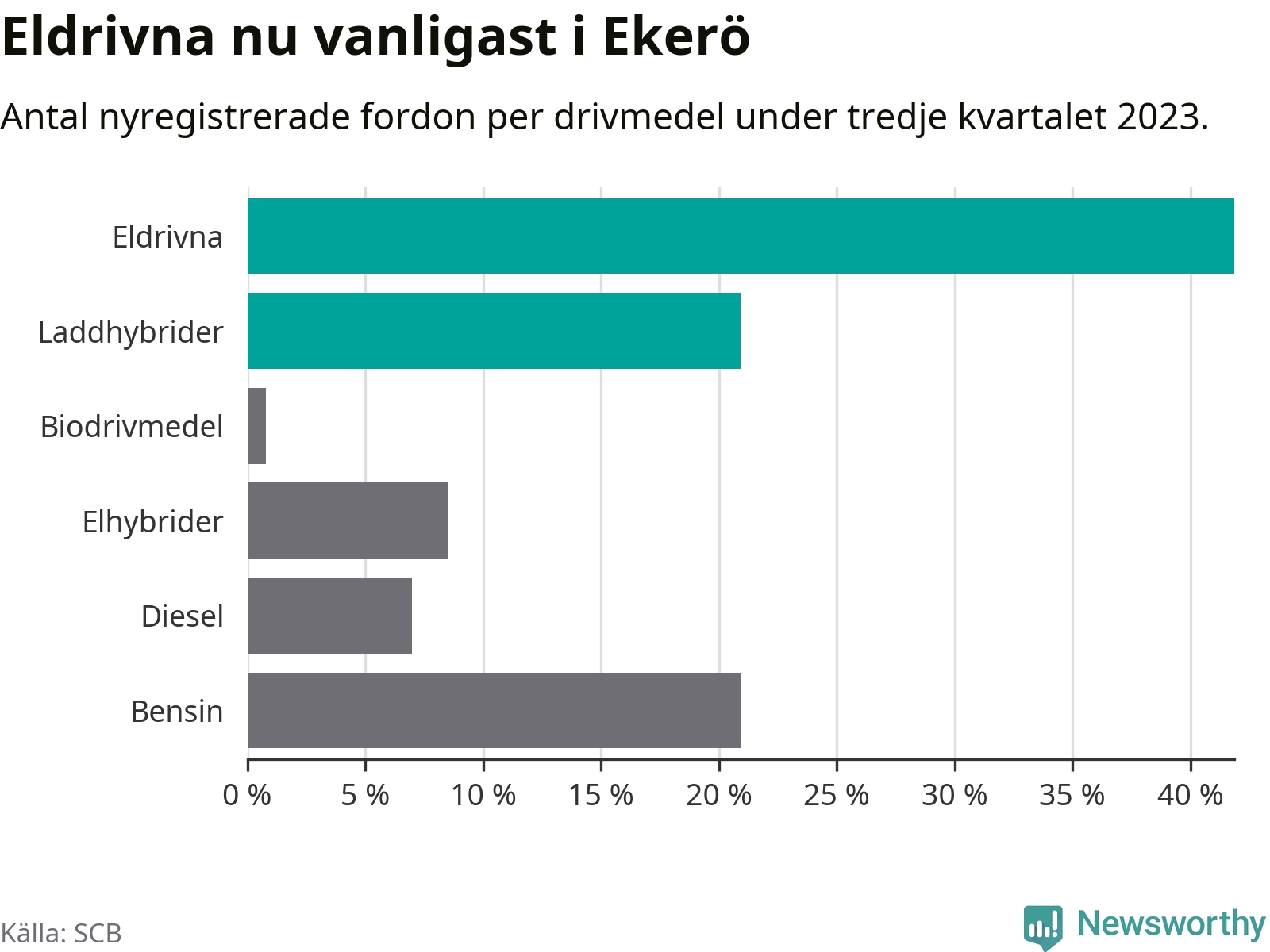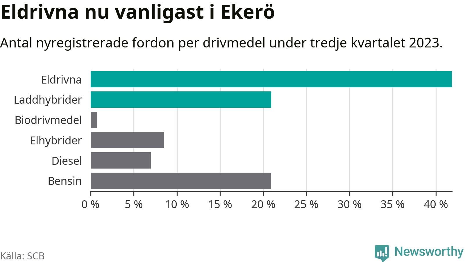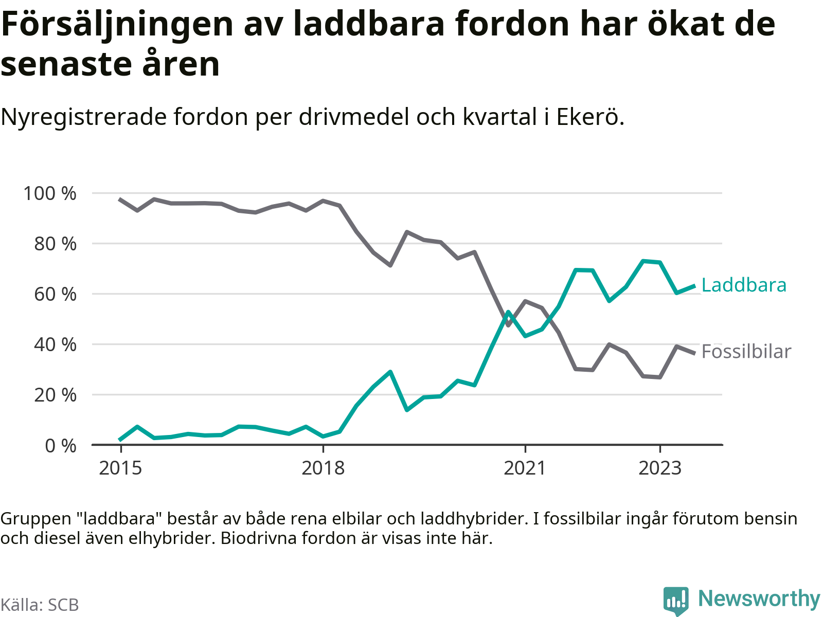 Under tredje kvartalet 2023 var 63 procent av alla nyregistrerade personbilar i Ekerö laddbara (sammanlagt registrerades 129 nya bilar). Merparten av de laddbara bilarna var rena elbilar (42 procent av alla).