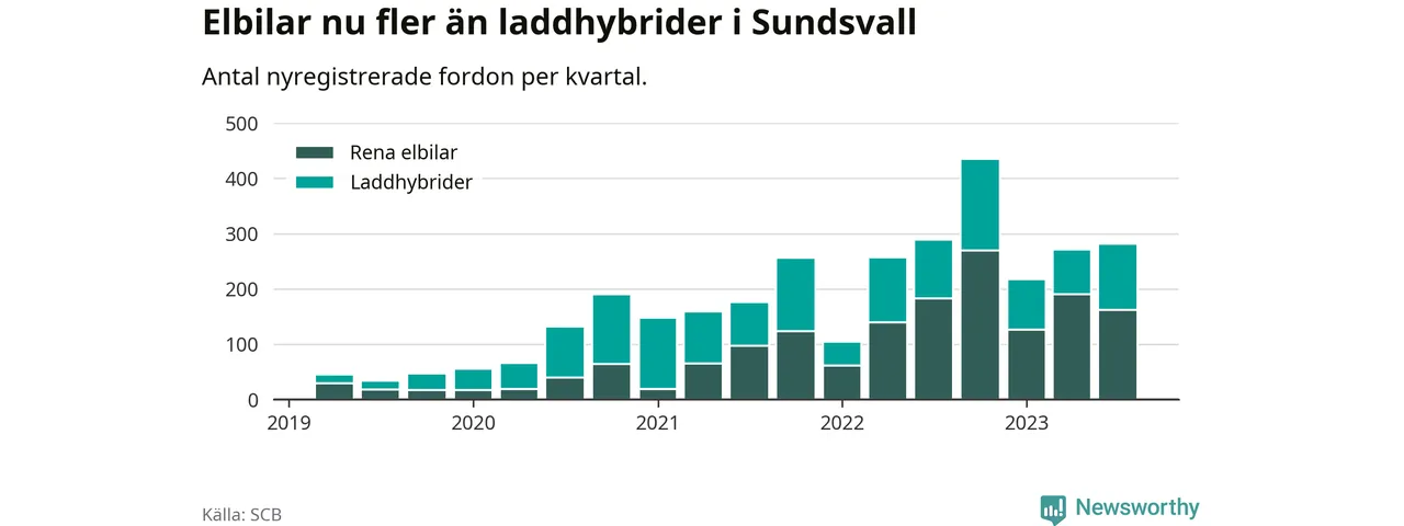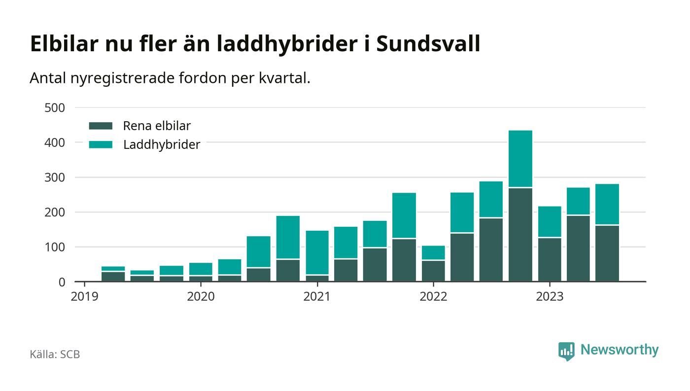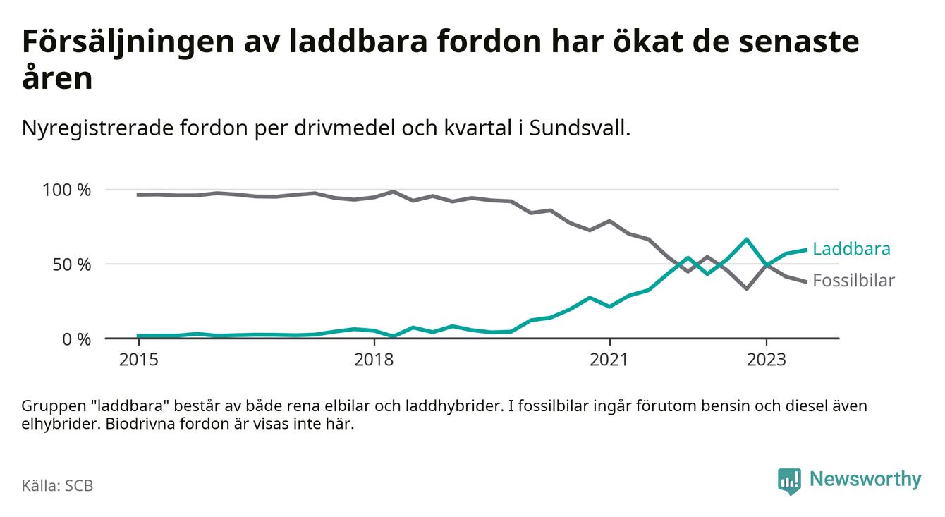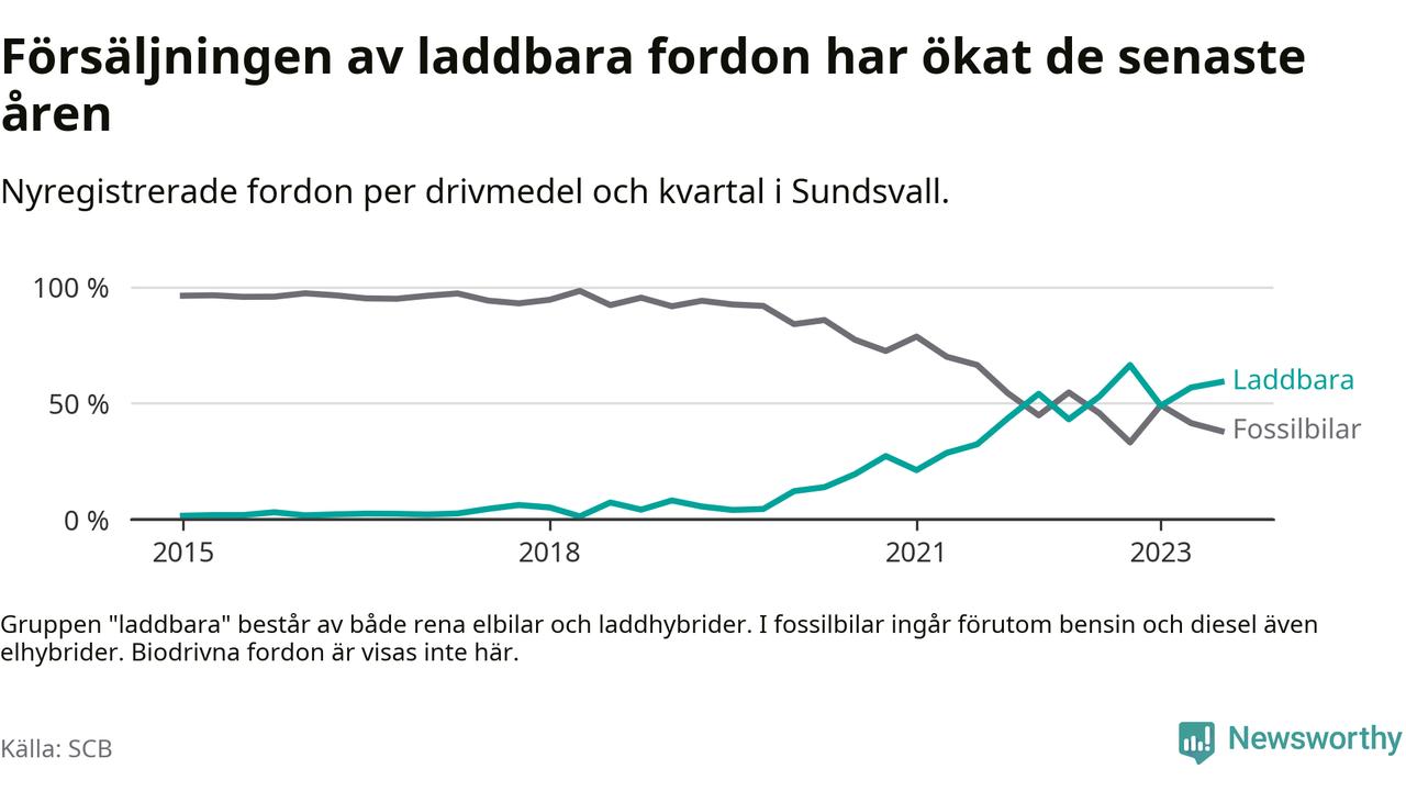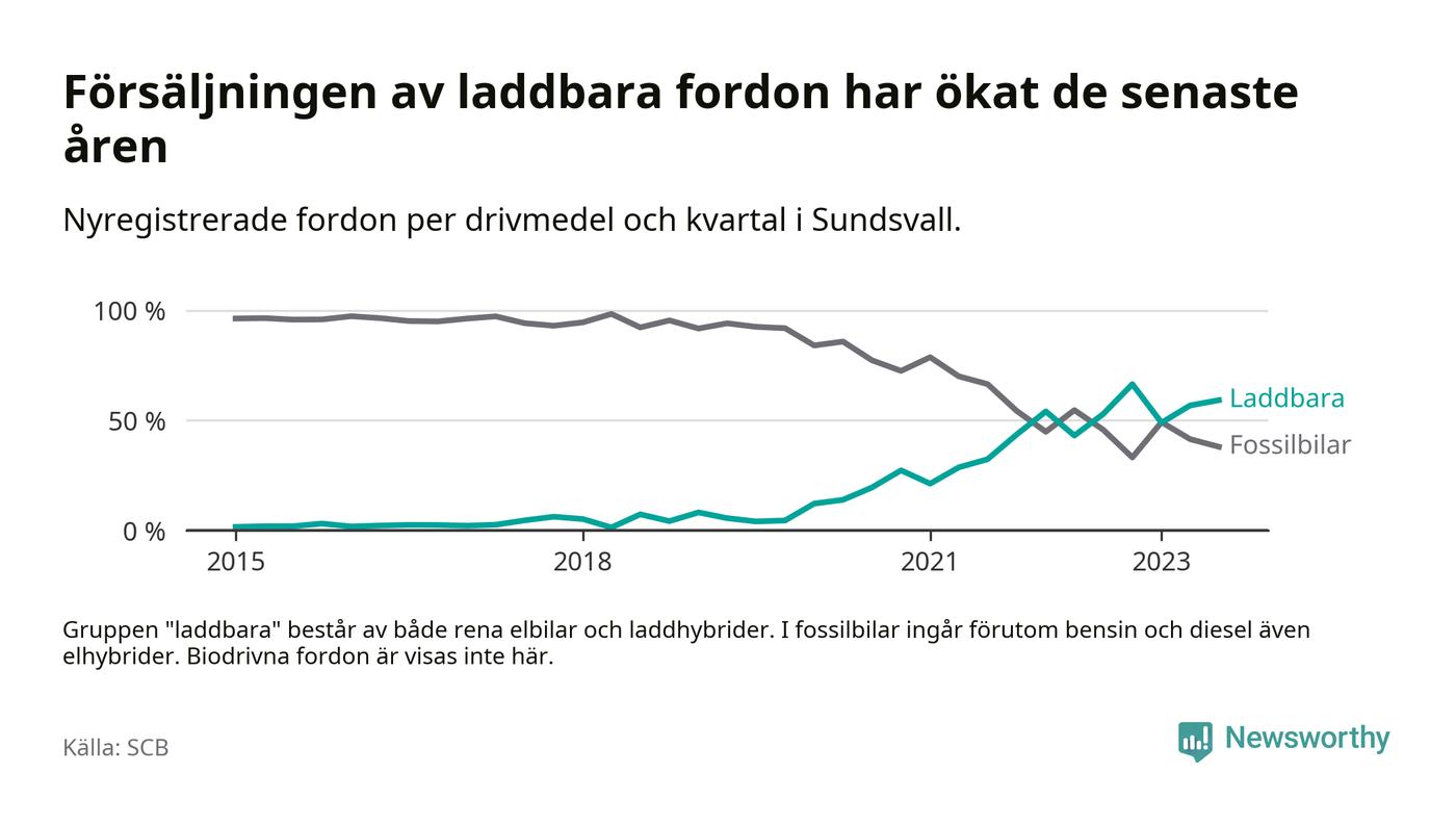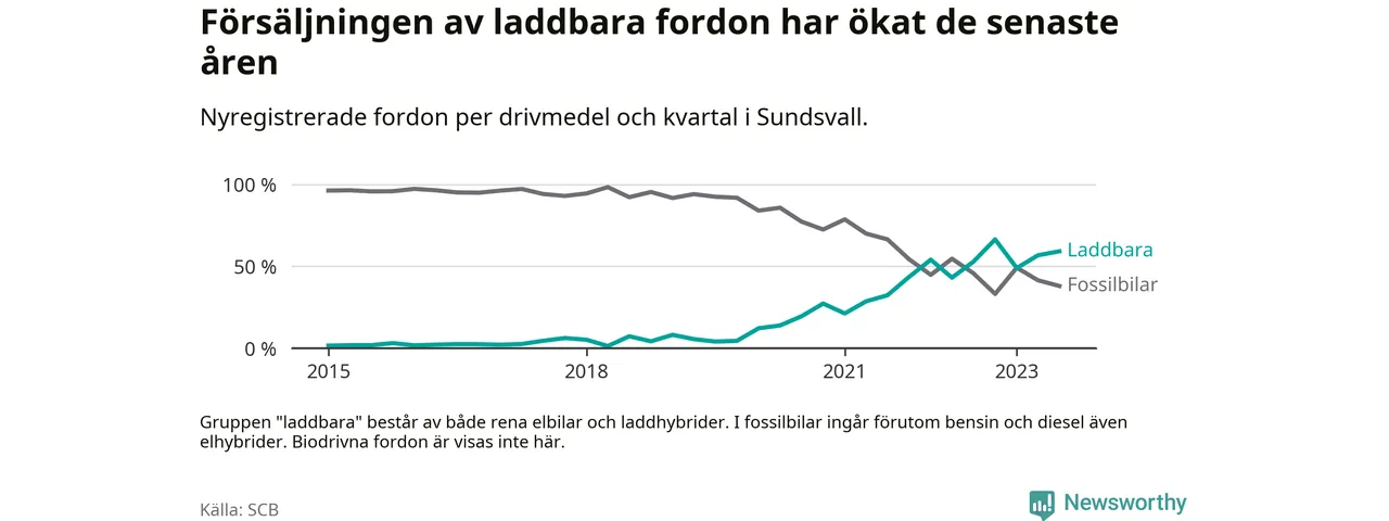 Under tredje kvartalet 2023 var 59 procent av alla nyregistrerade personbilar i Sundsvall laddbara (sammanlagt registrerades 476 nya bilar). Merparten av de laddbara bilarna var rena elbilar (34 procent av alla).