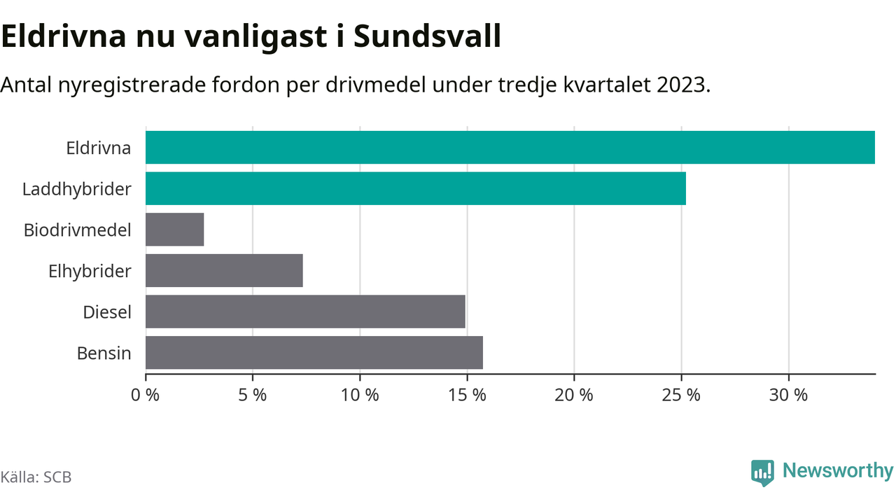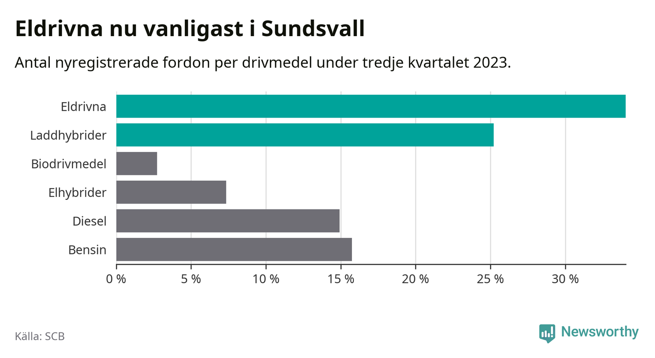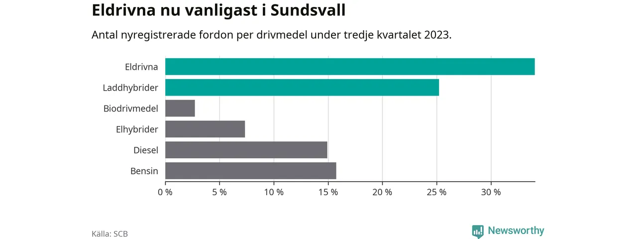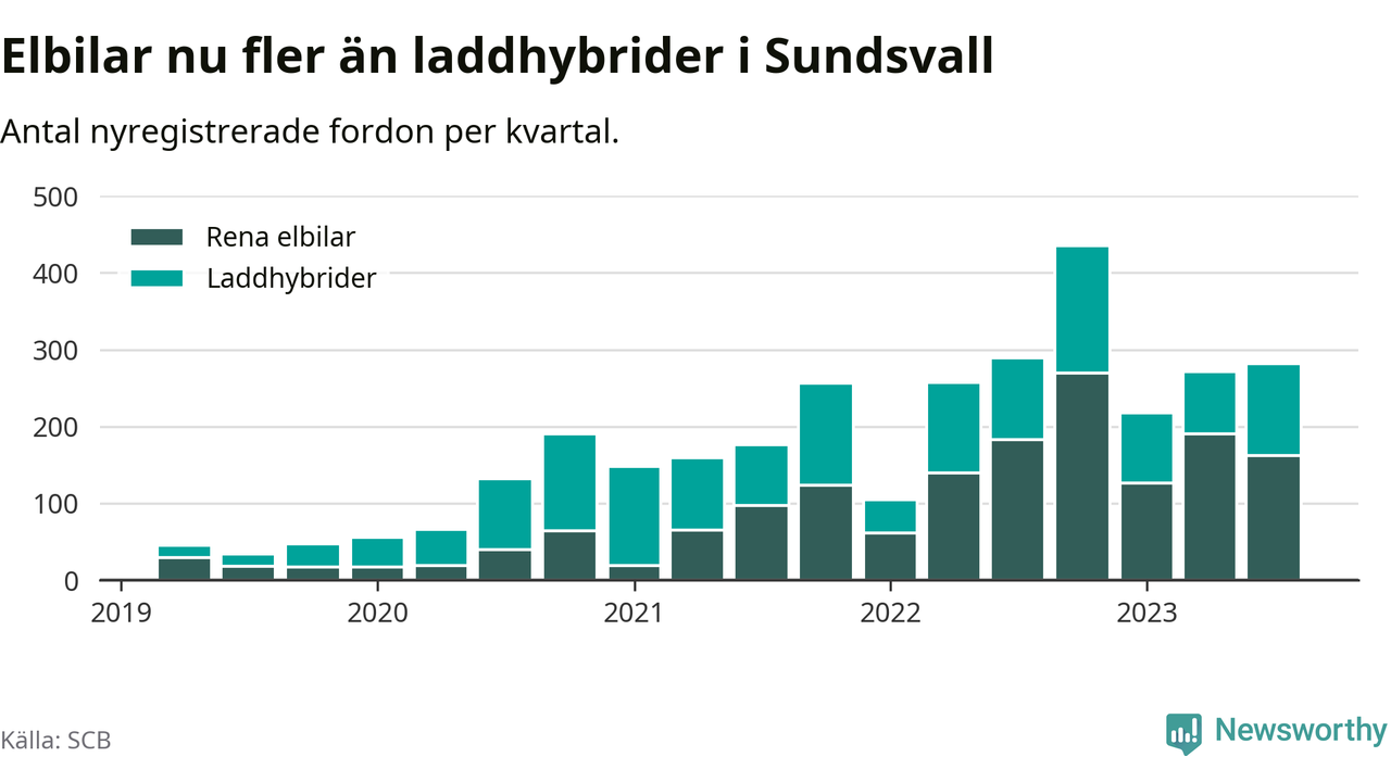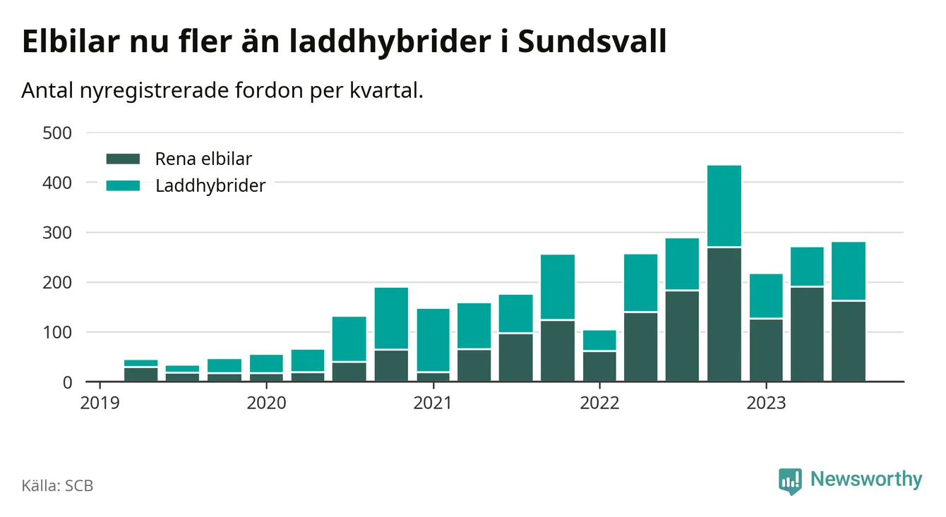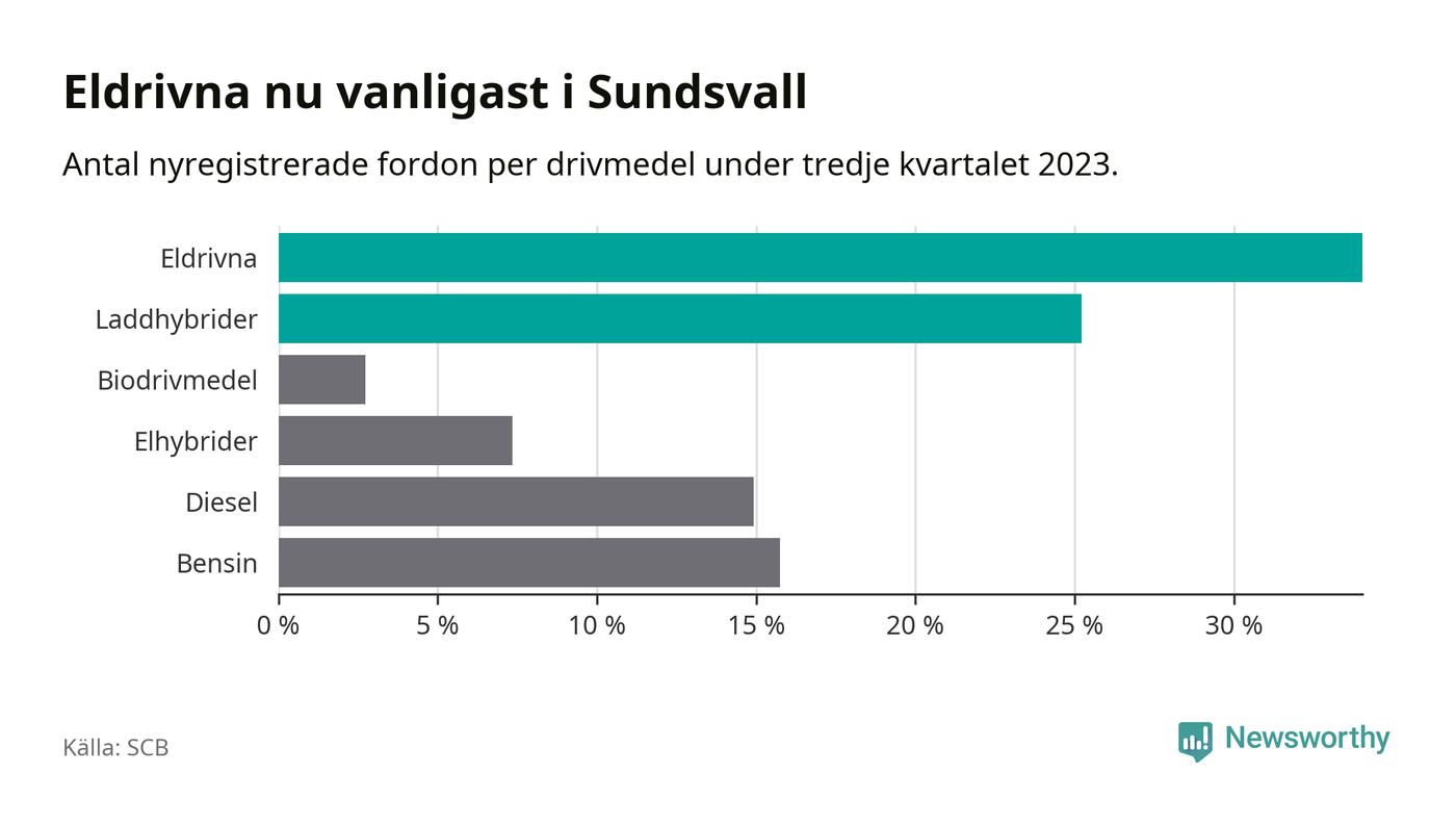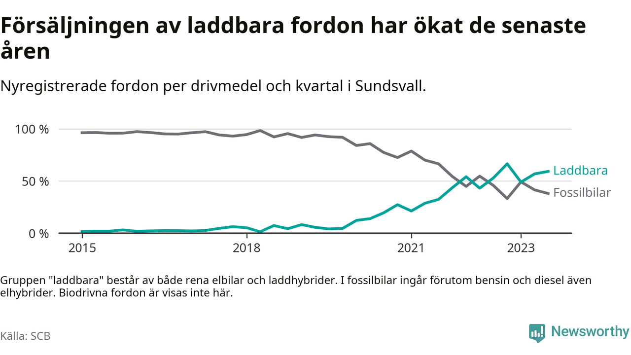 Under tredje kvartalet 2023 var 59 procent av alla nyregistrerade personbilar i Sundsvall laddbara (sammanlagt registrerades 476 nya bilar). Merparten av de laddbara bilarna var rena elbilar (34 procent av alla).