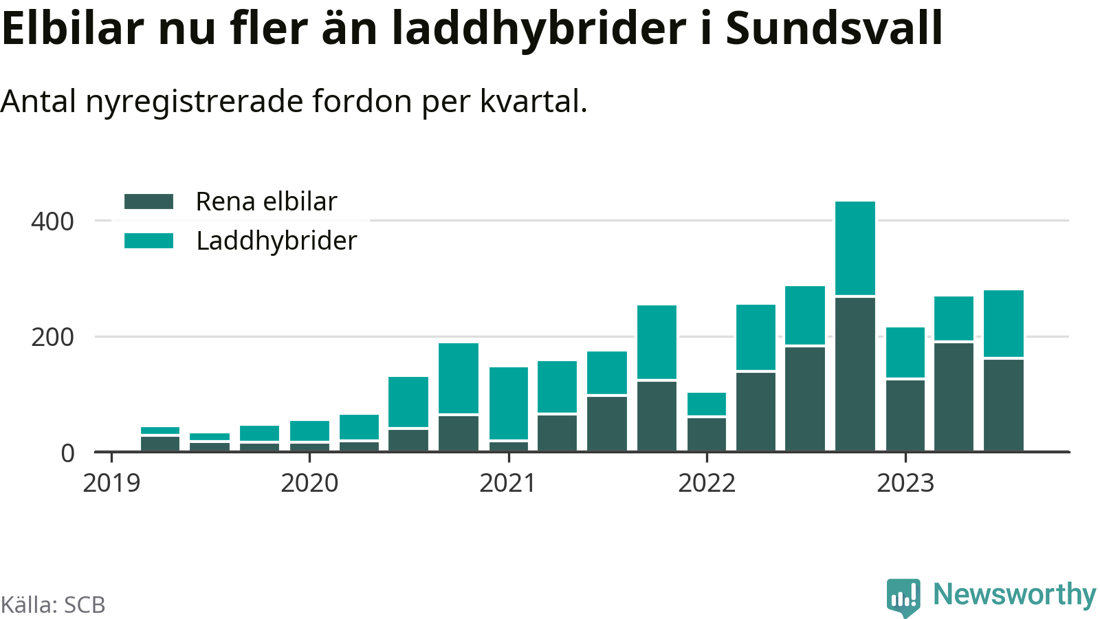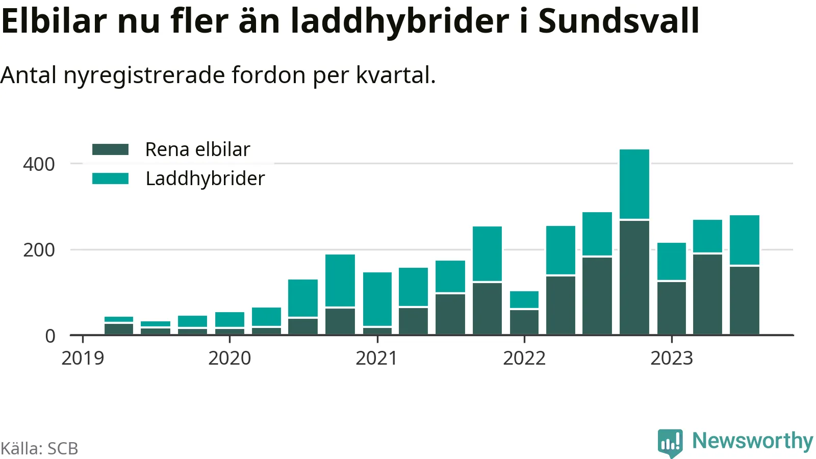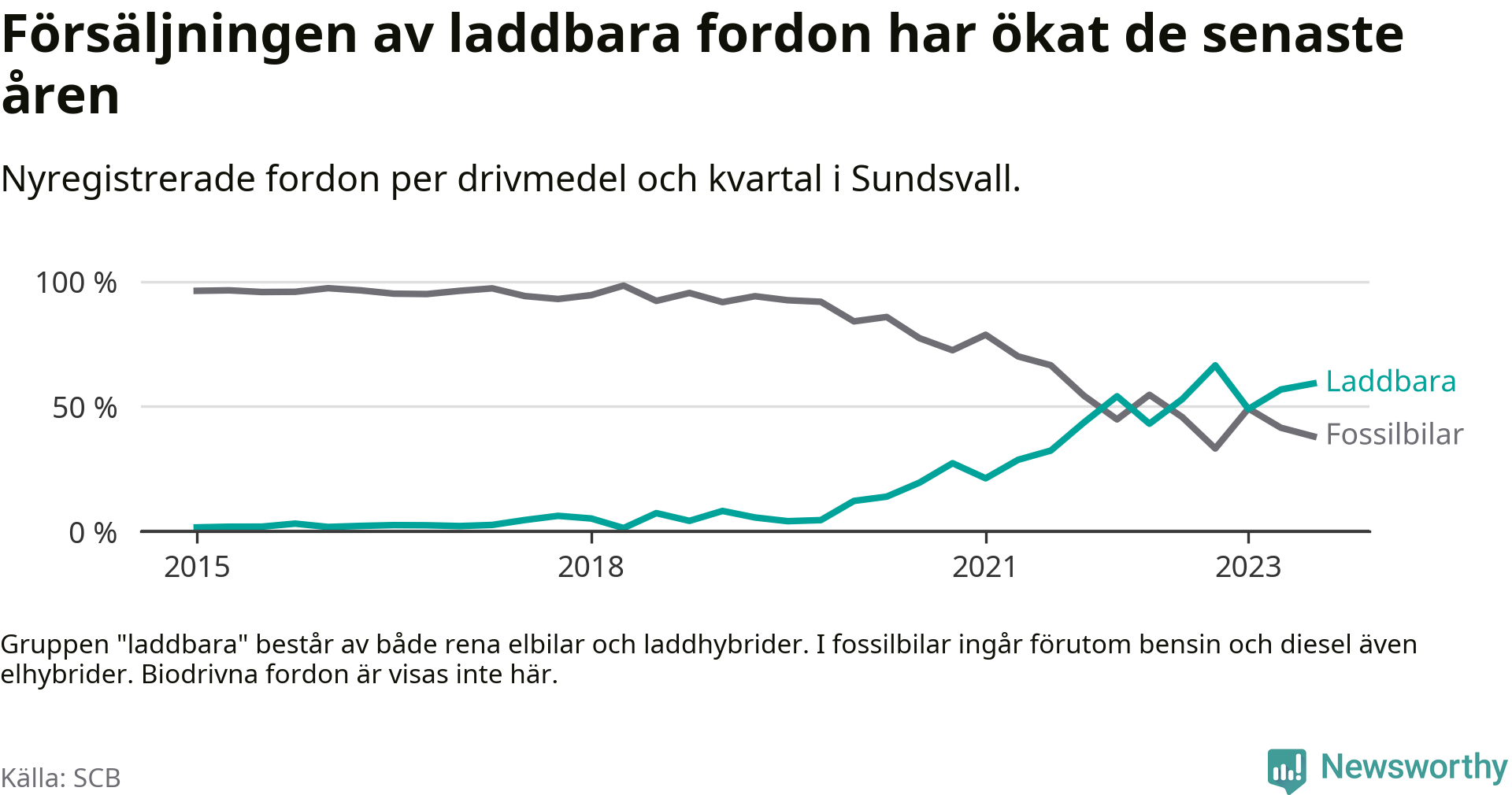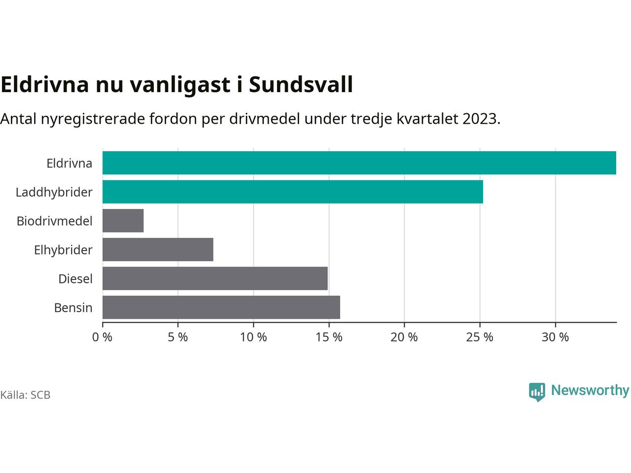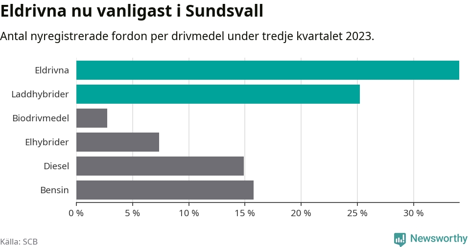 Under tredje kvartalet 2023 var 59 procent av alla nyregistrerade personbilar i Sundsvall laddbara (sammanlagt registrerades 476 nya bilar). Merparten av de laddbara bilarna var rena elbilar (34 procent av alla).