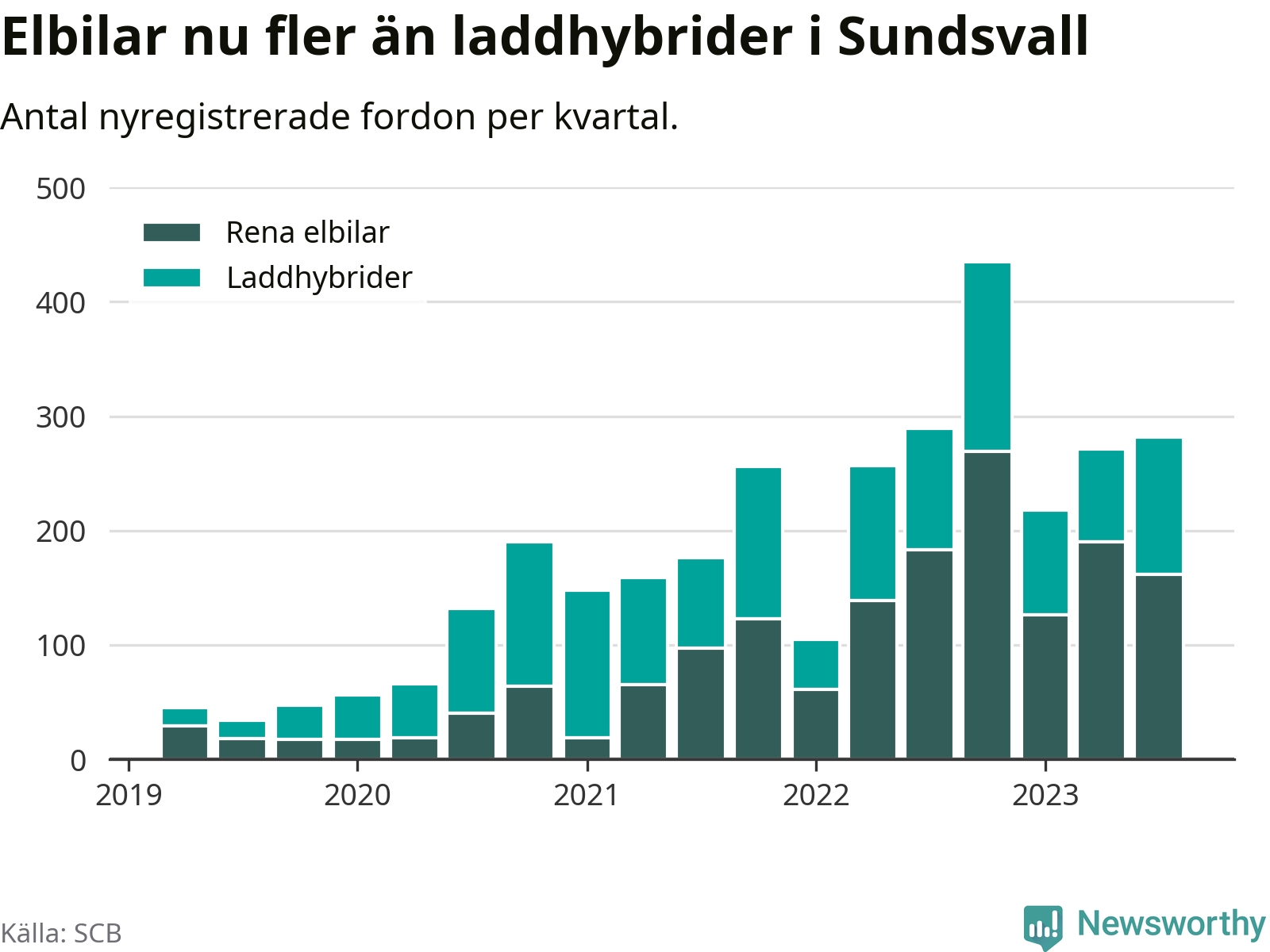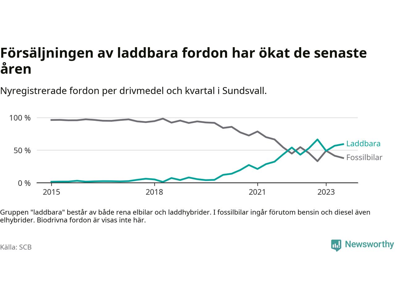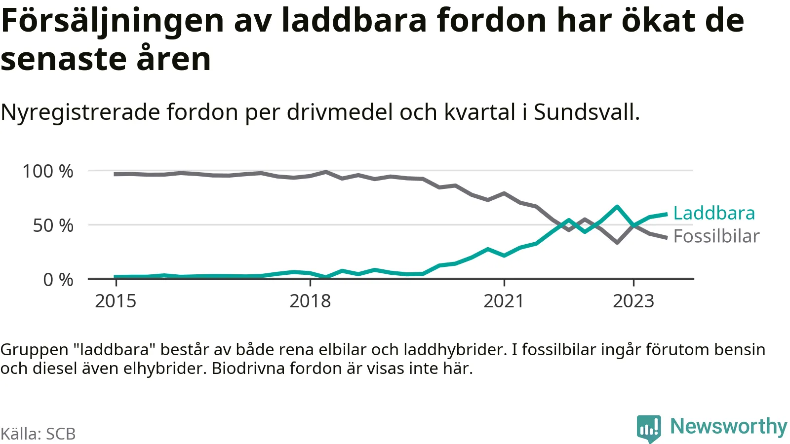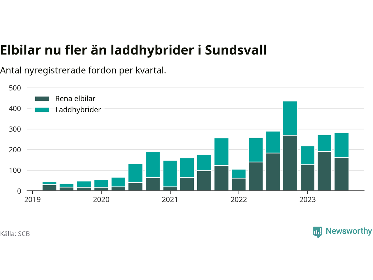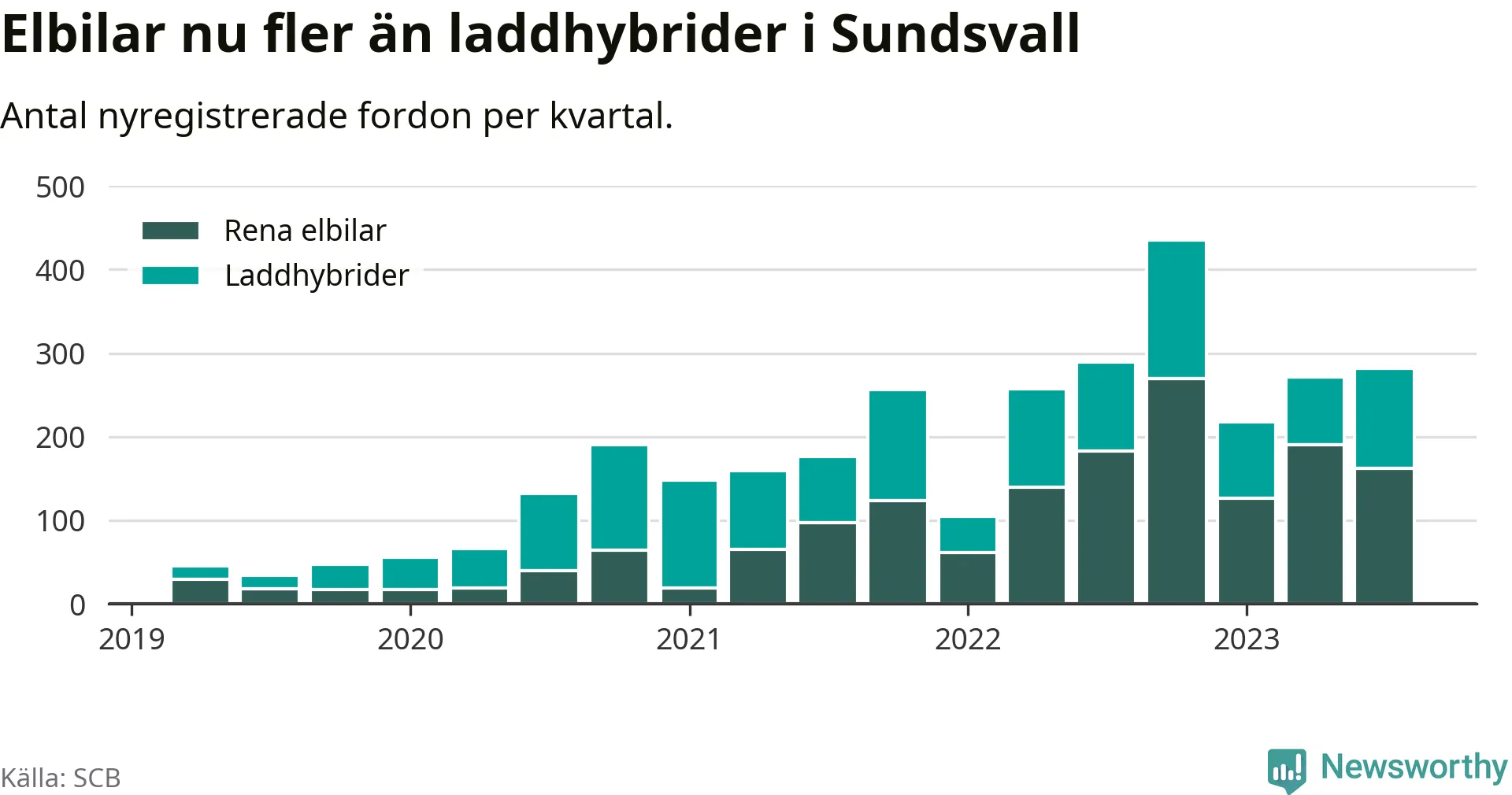 Under tredje kvartalet 2023 var 59 procent av alla nyregistrerade personbilar i Sundsvall laddbara (sammanlagt registrerades 476 nya bilar). Merparten av de laddbara bilarna var rena elbilar (34 procent av alla).