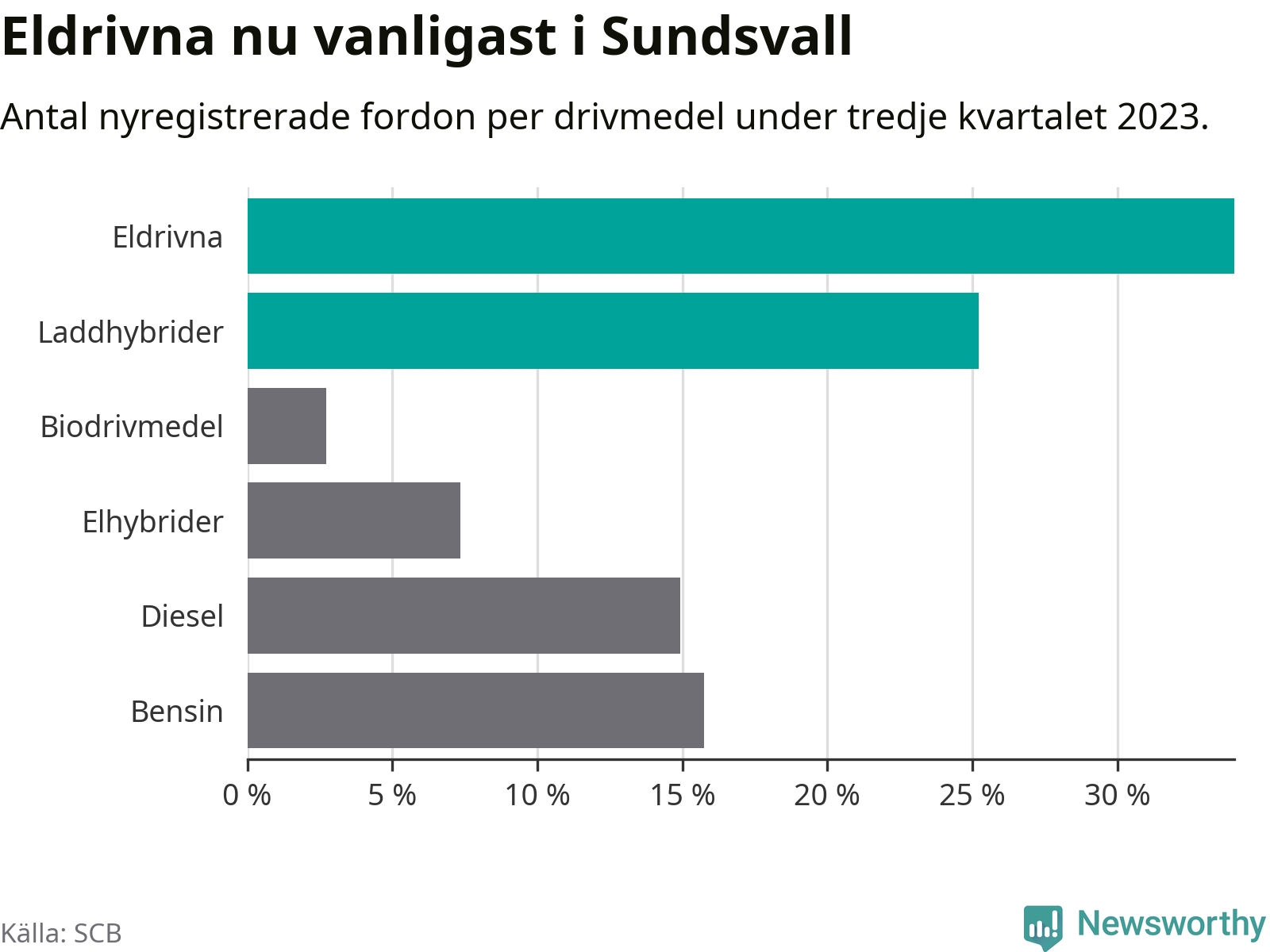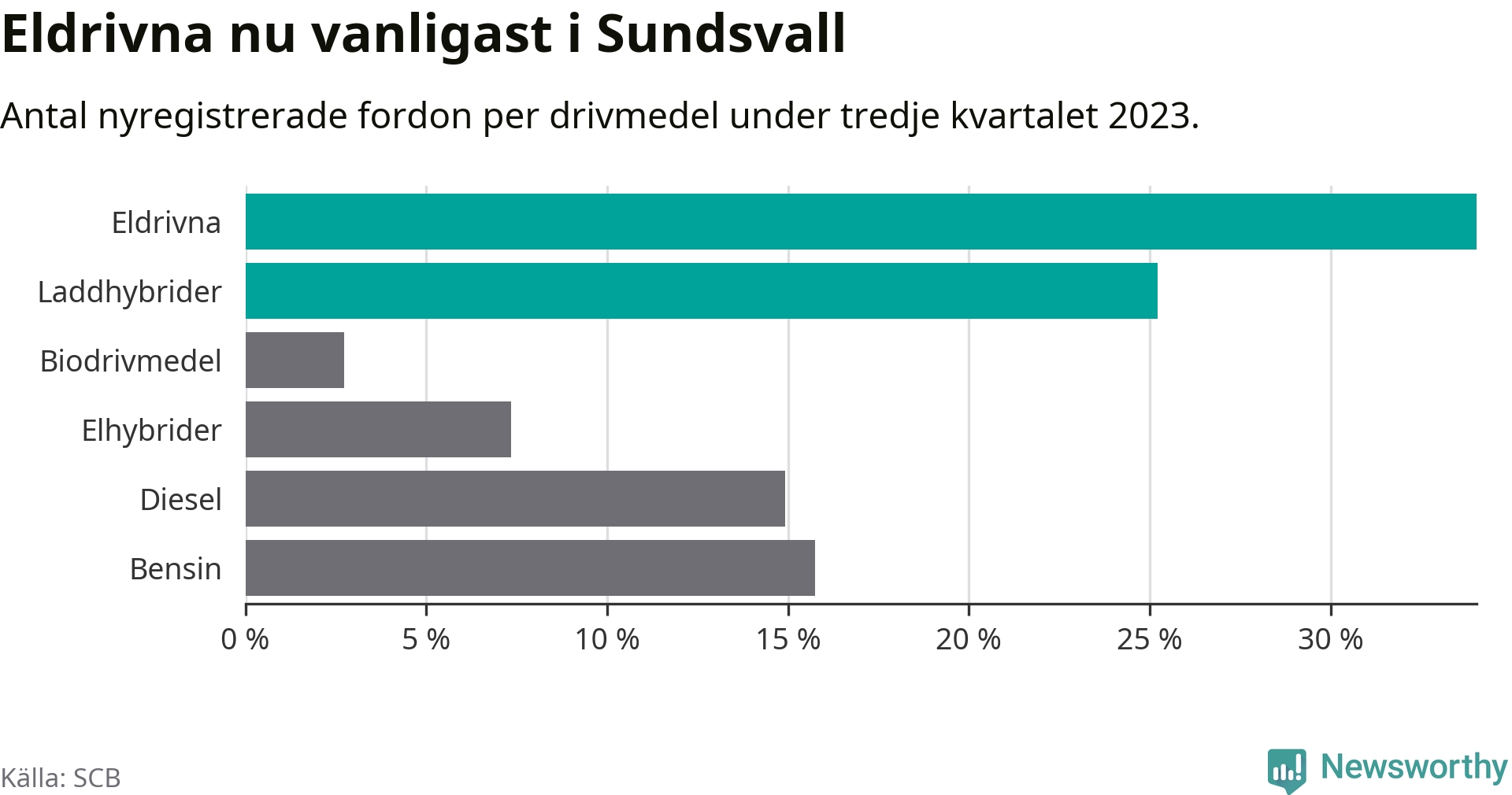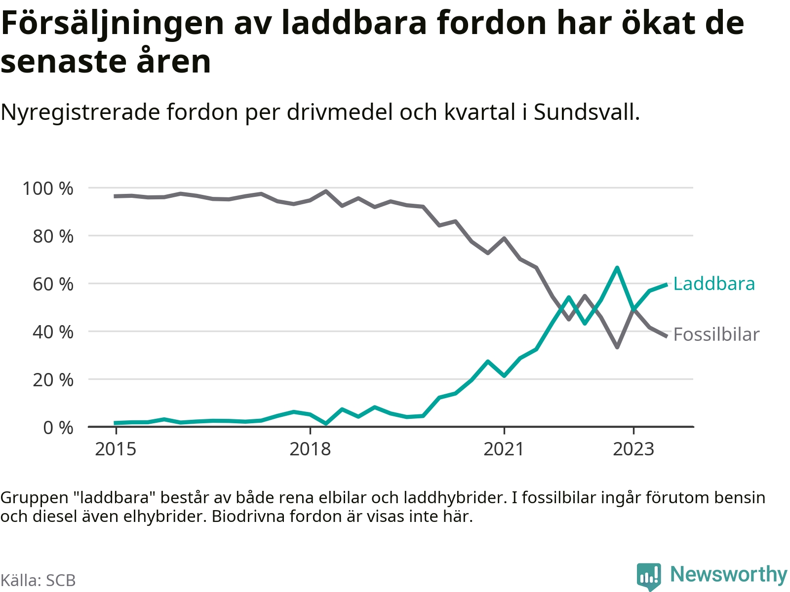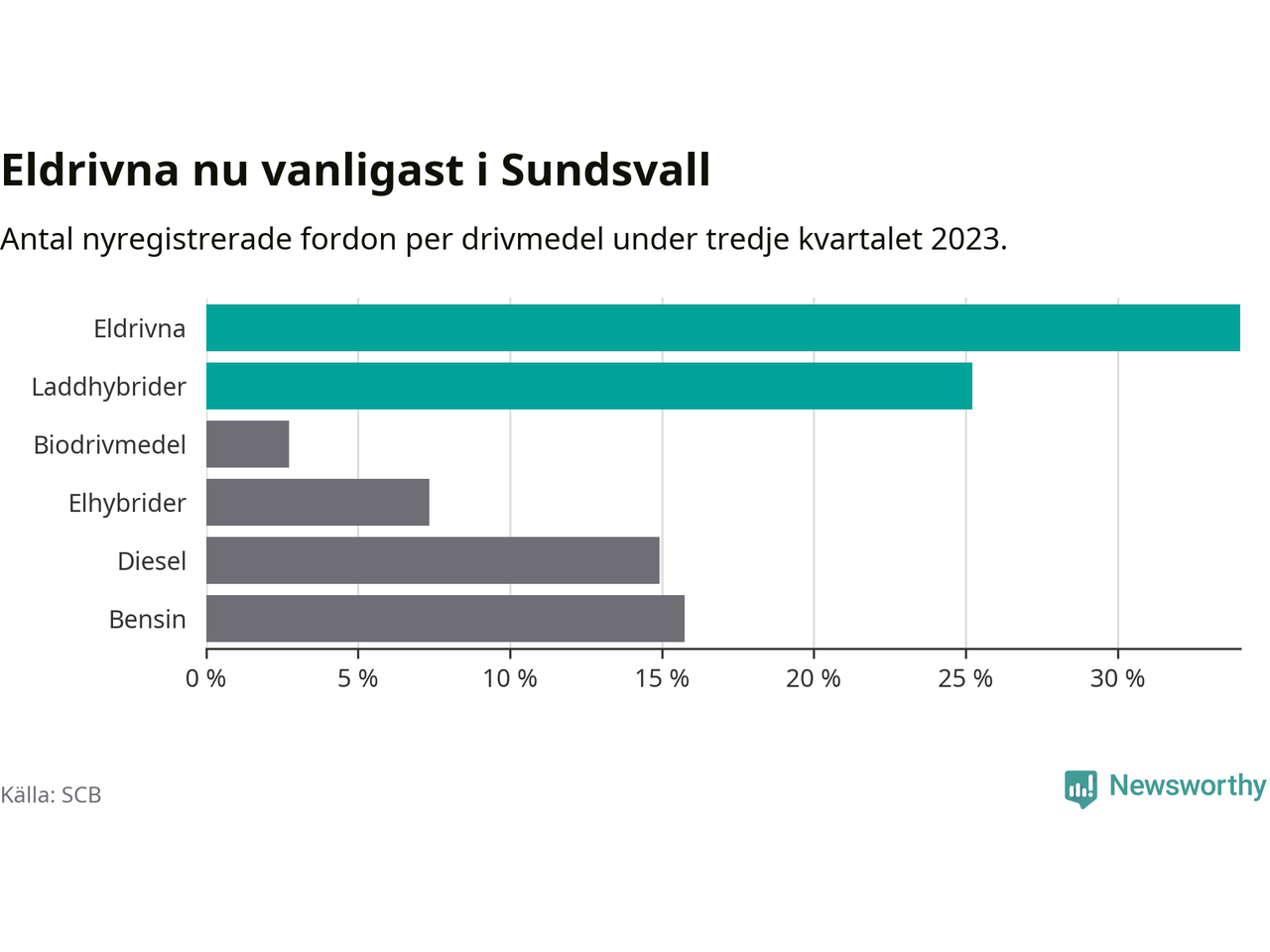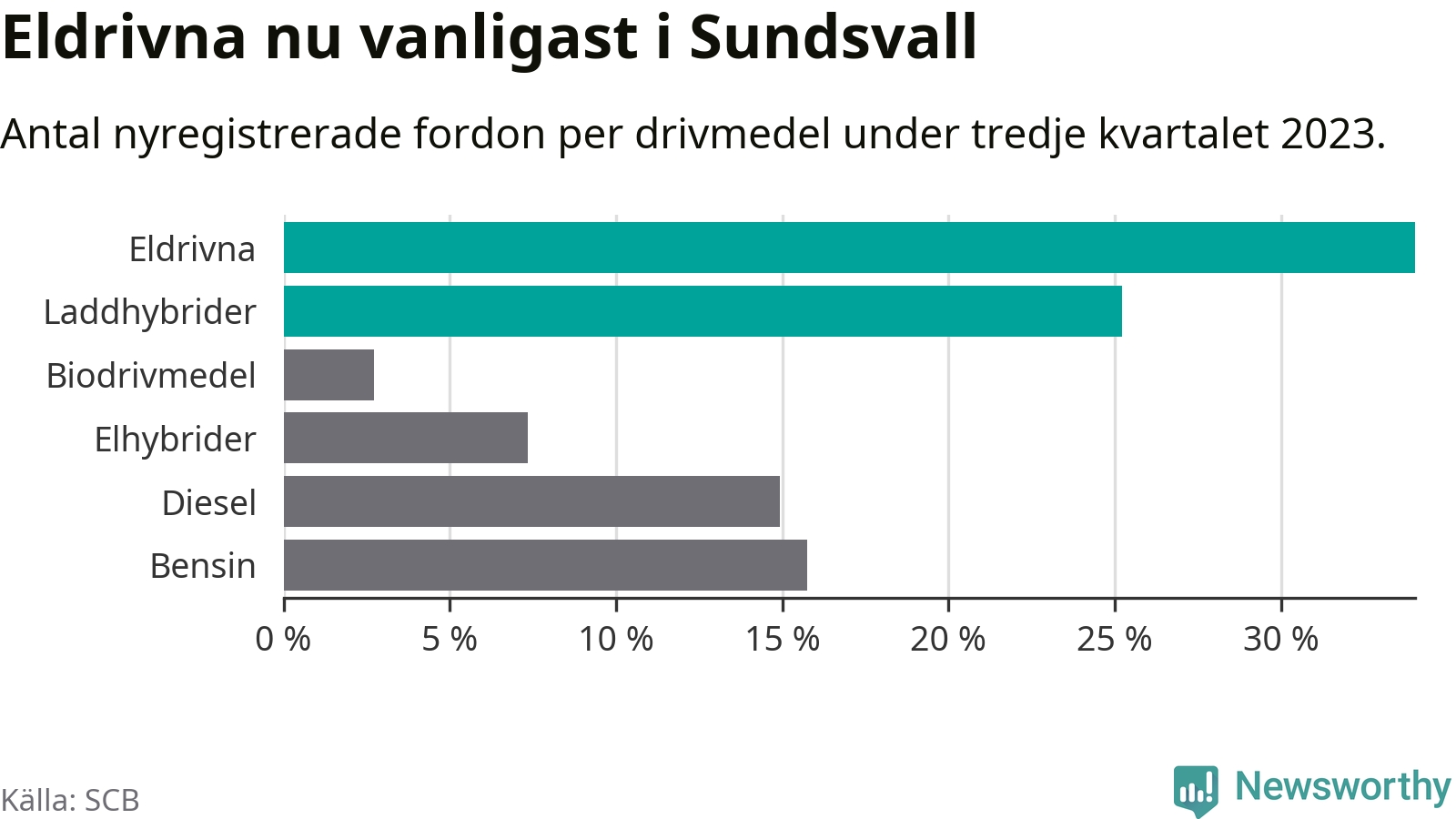 Under tredje kvartalet 2023 var 59 procent av alla nyregistrerade personbilar i Sundsvall laddbara (sammanlagt registrerades 476 nya bilar). Merparten av de laddbara bilarna var rena elbilar (34 procent av alla).