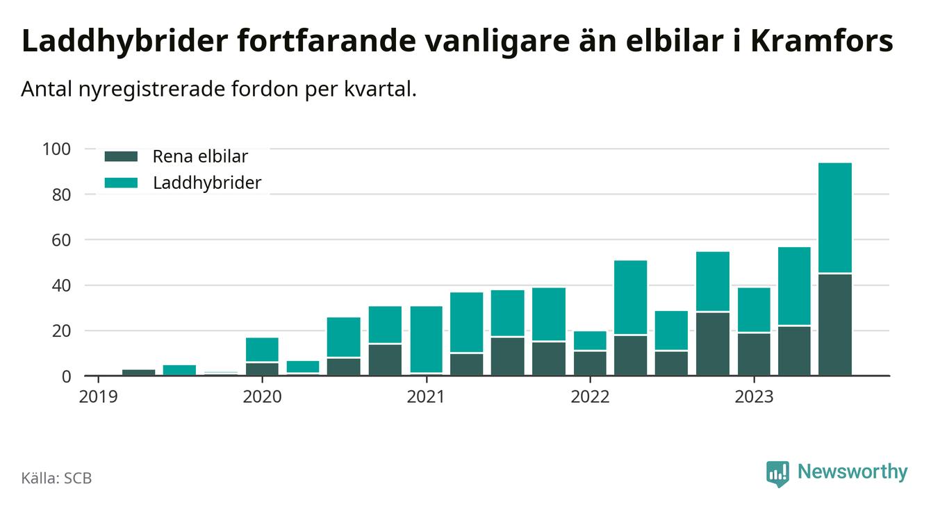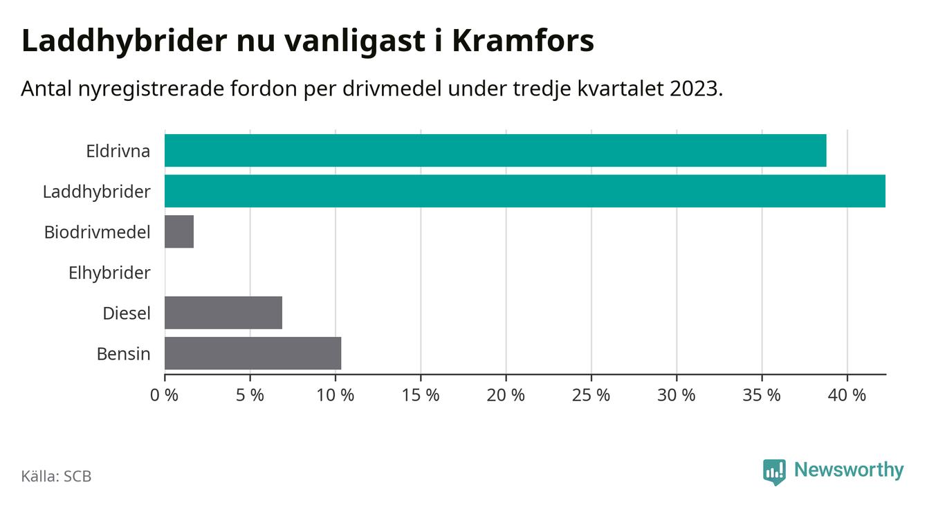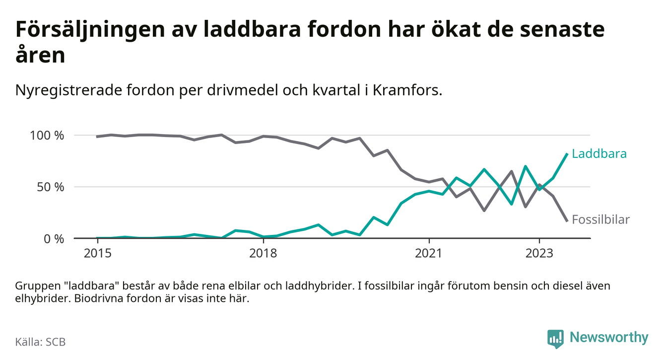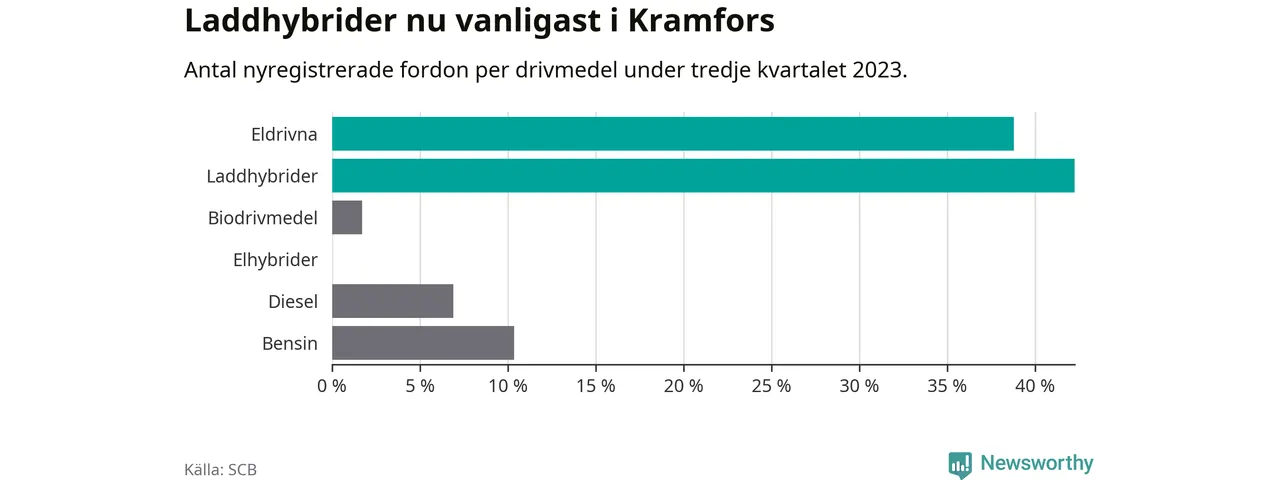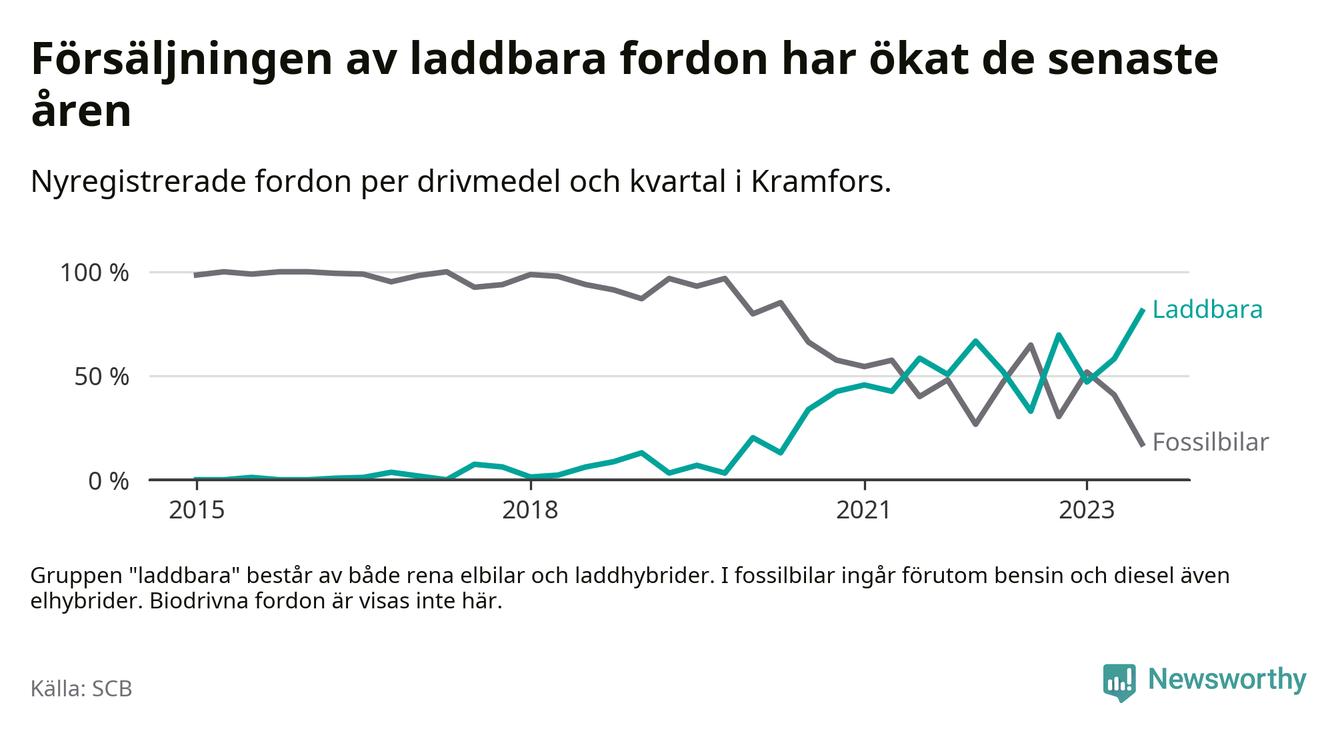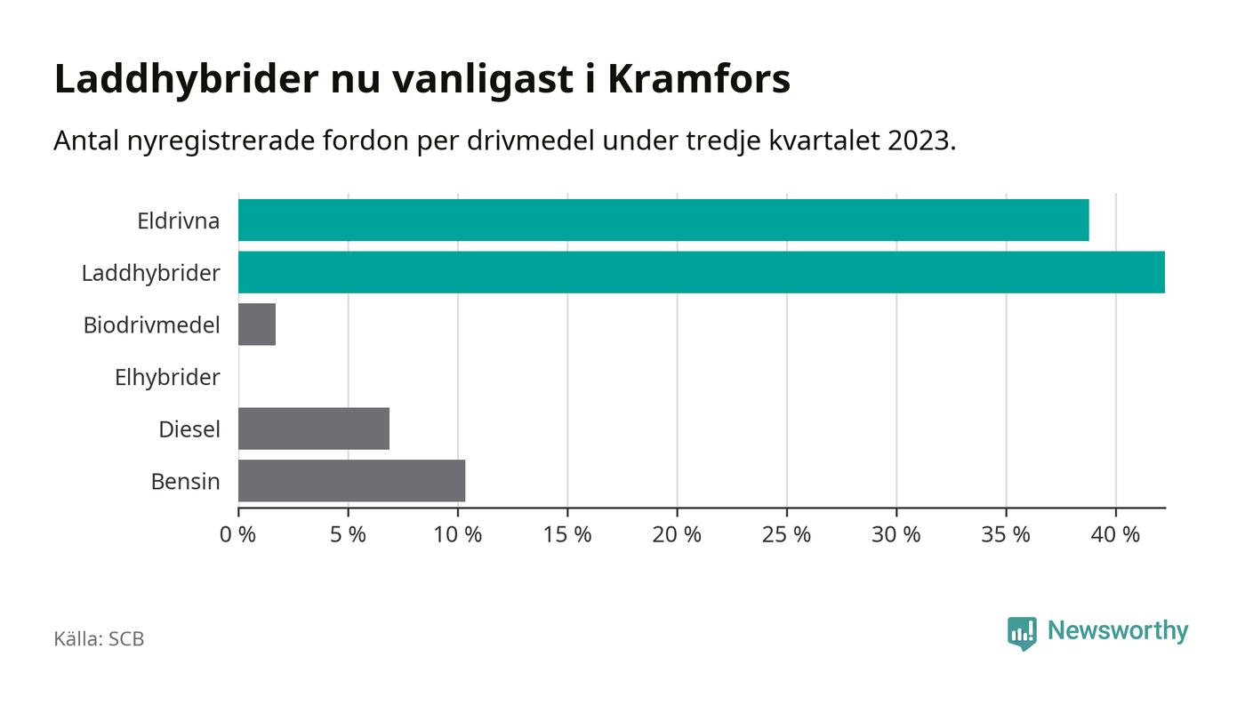 Under tredje kvartalet 2023 var 81 procent av alla nyregistrerade personbilar i Kramfors laddbara (sammanlagt registrerades 116 nya bilar). Merparten av de laddbara bilarna var så kallade laddhybrider, det vill säga fordon som går att ladda och köra på el, men som även har en förbränningsmotor. 39 procent av alla nya bilar var rena elbilar.