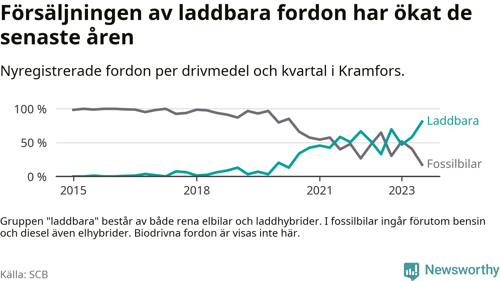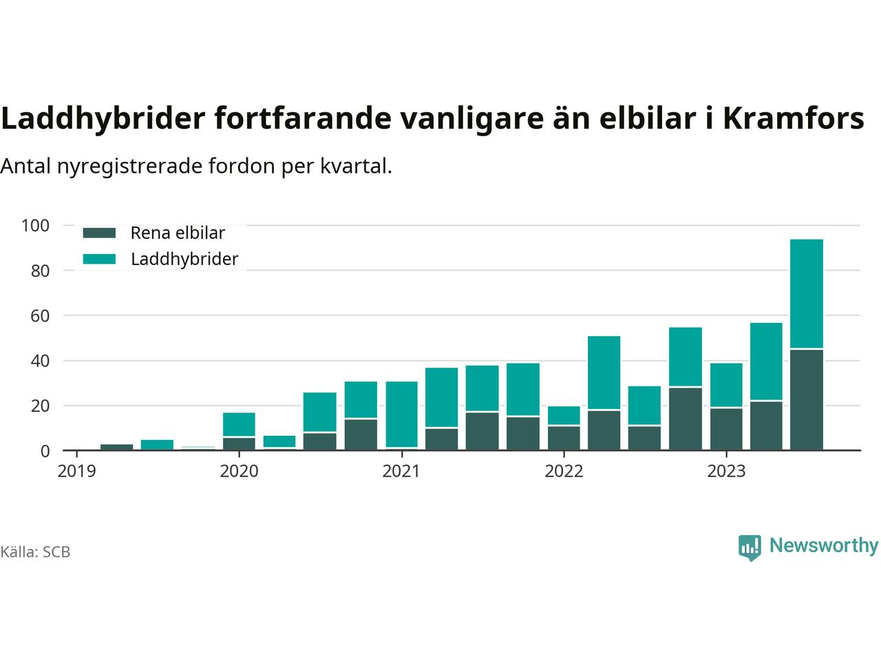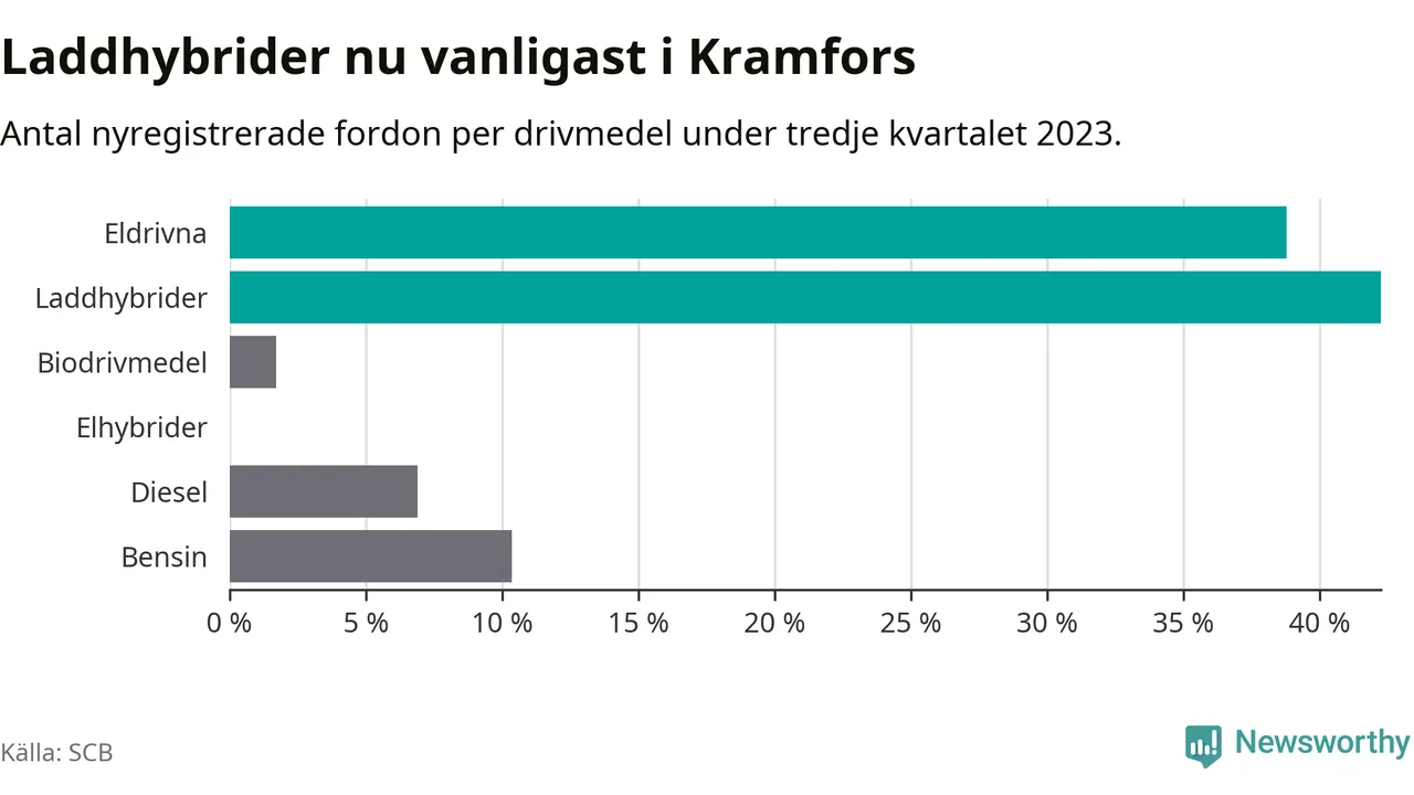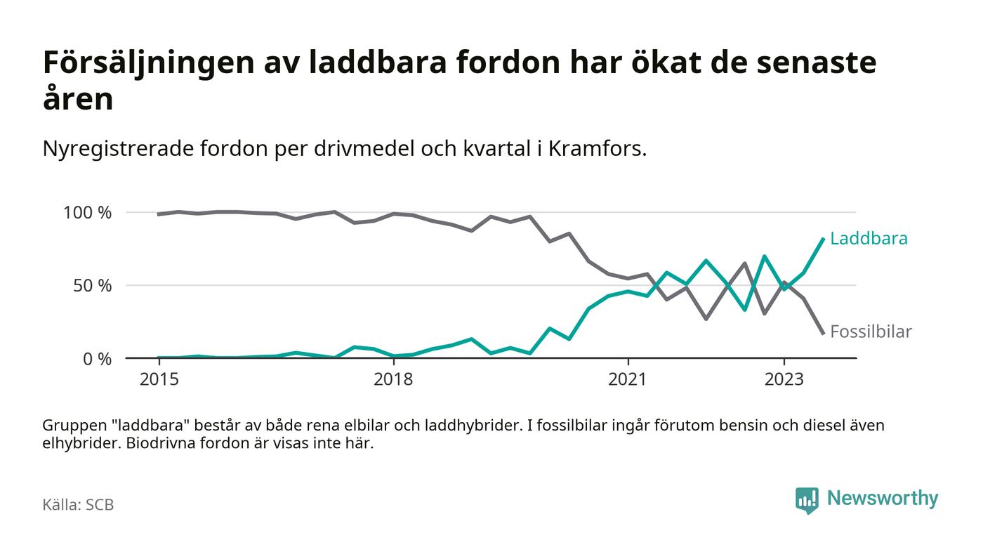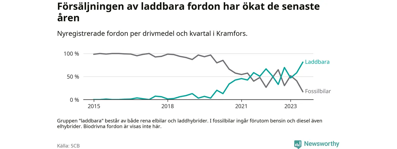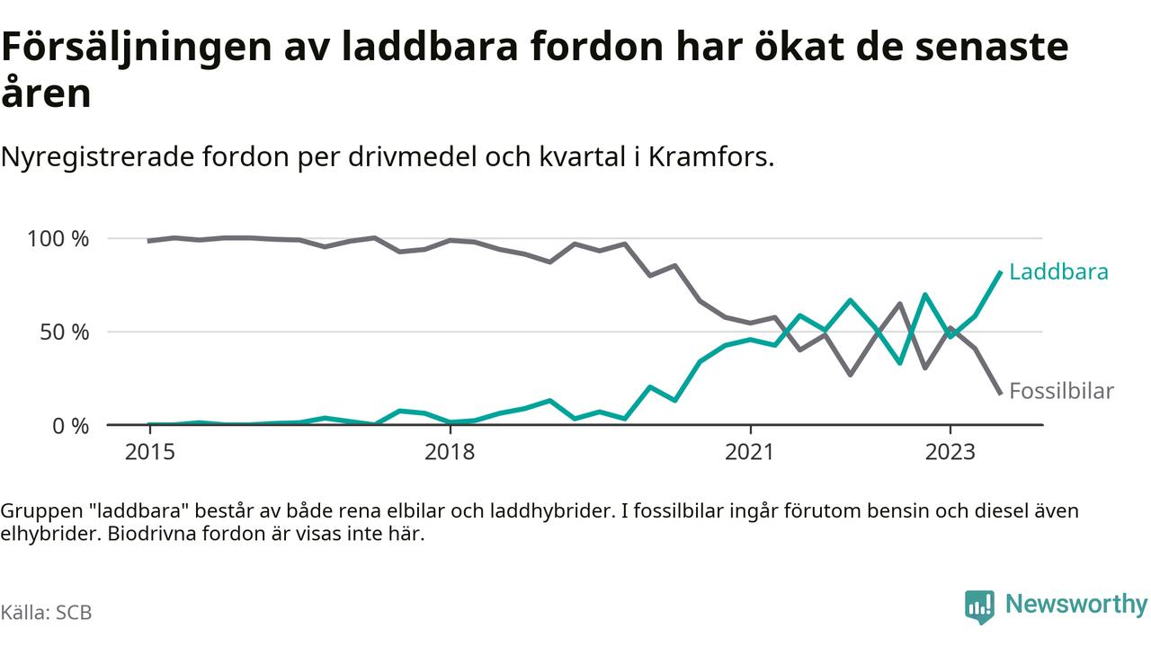Under tredje kvartalet 2023 var 81 procent av alla nyregistrerade personbilar i Kramfors laddbara (sammanlagt registrerades 116 nya bilar). Merparten av de laddbara bilarna var så kallade laddhybrider, det vill säga fordon som går att ladda och köra på el, men som även har en förbränningsmotor. 39 procent av alla nya bilar var rena elbilar.