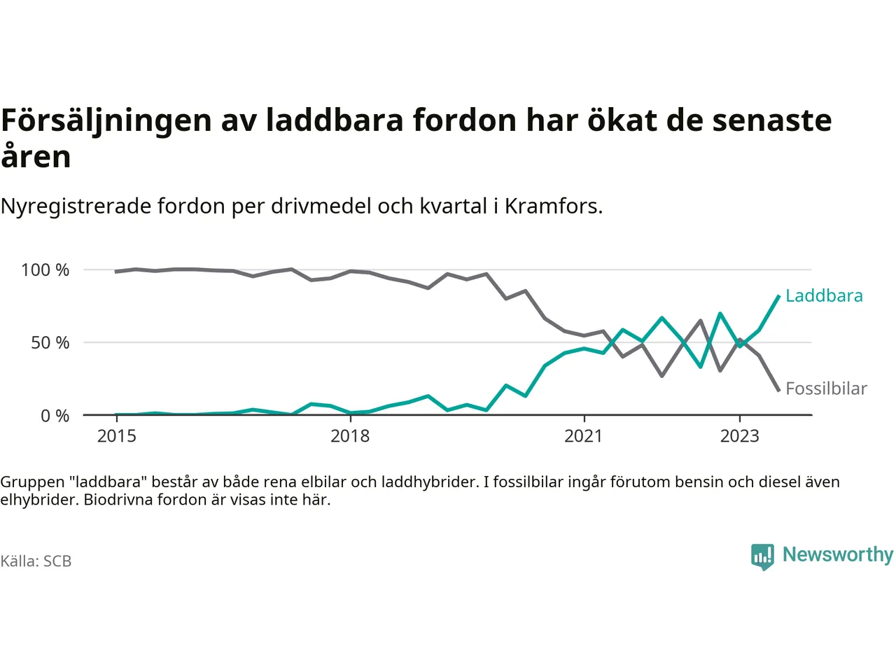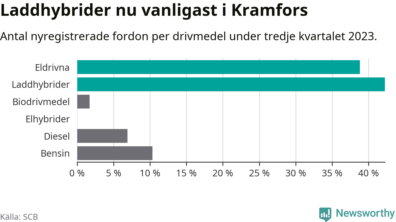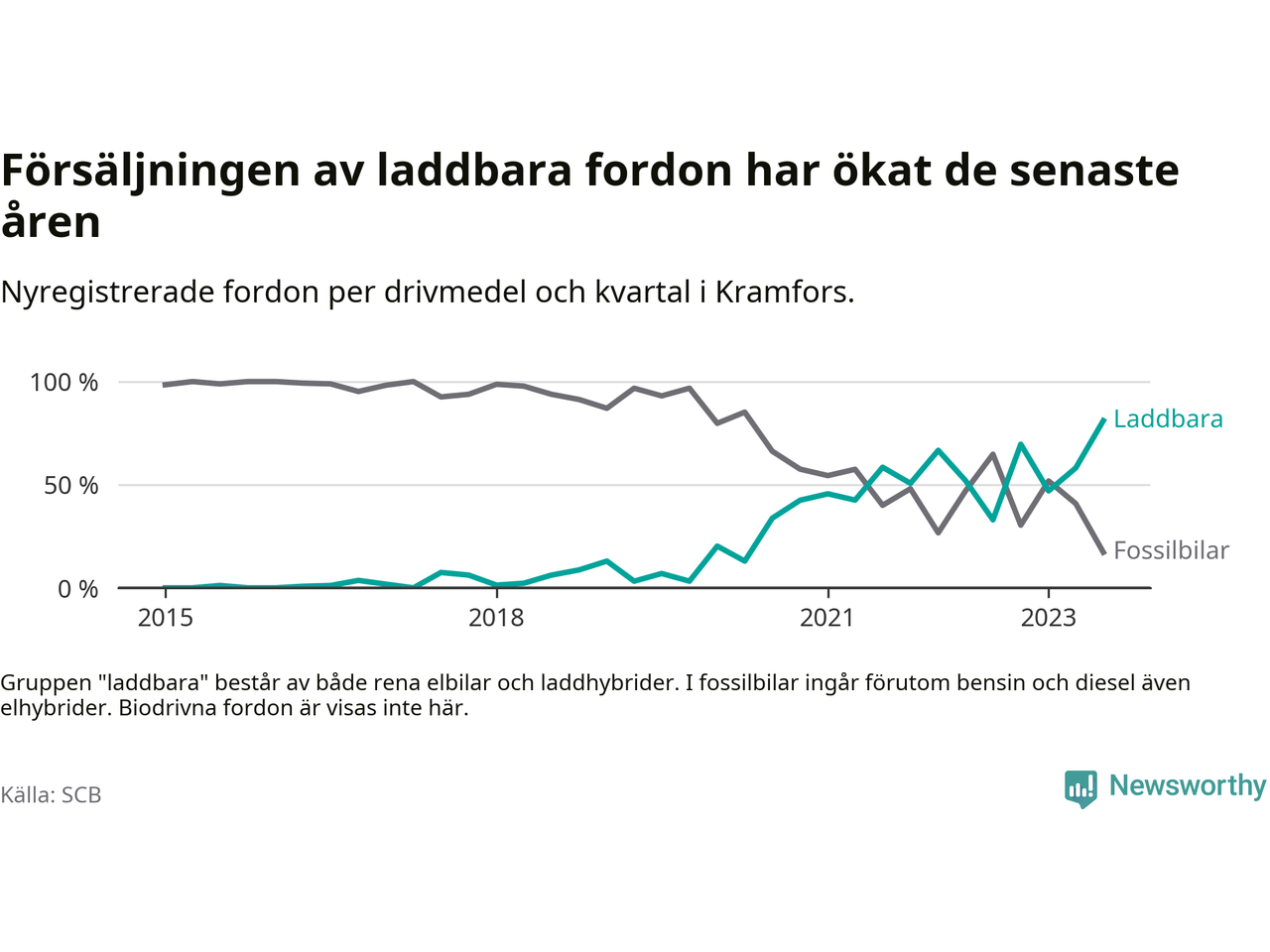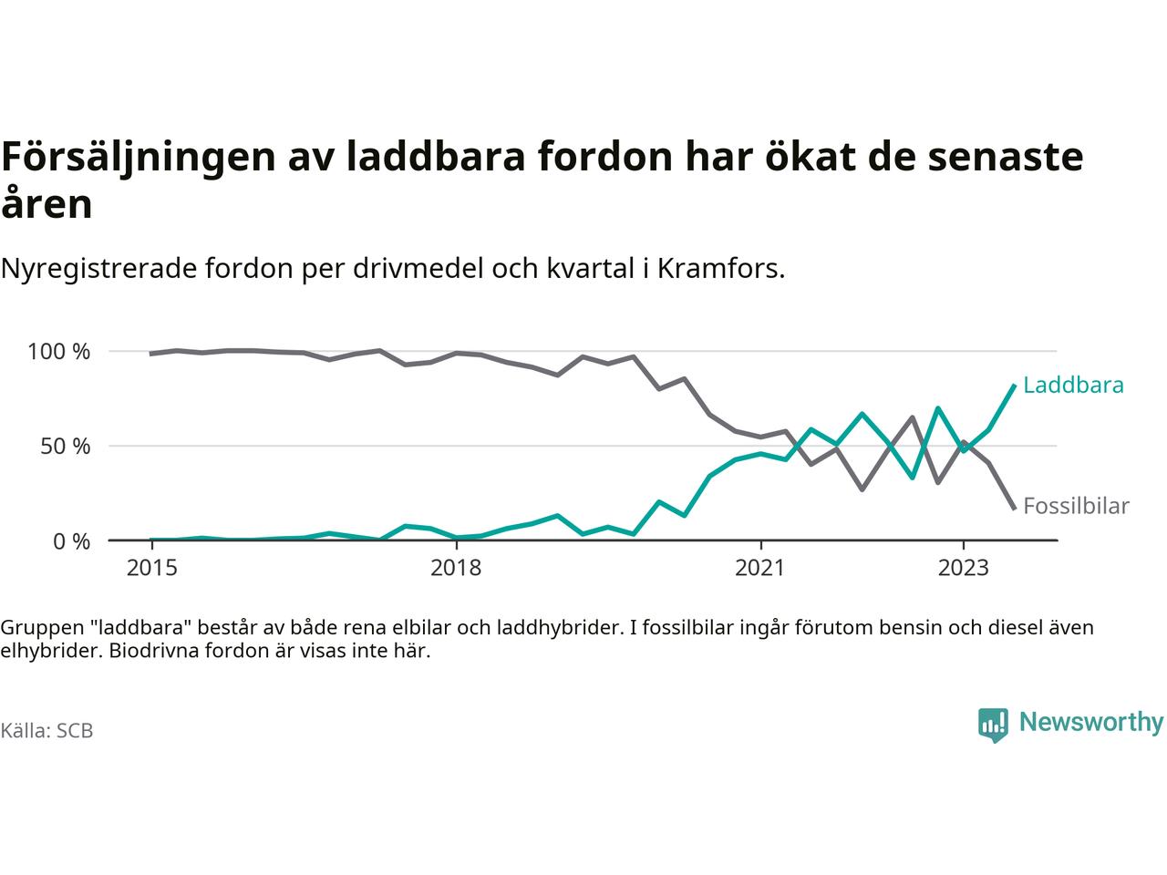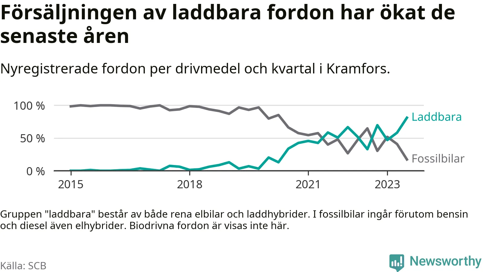 Under tredje kvartalet 2023 var 81 procent av alla nyregistrerade personbilar i Kramfors laddbara (sammanlagt registrerades 116 nya bilar). Merparten av de laddbara bilarna var så kallade laddhybrider, det vill säga fordon som går att ladda och köra på el, men som även har en förbränningsmotor. 39 procent av alla nya bilar var rena elbilar.