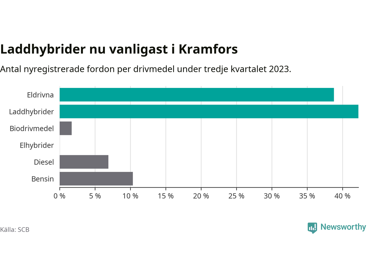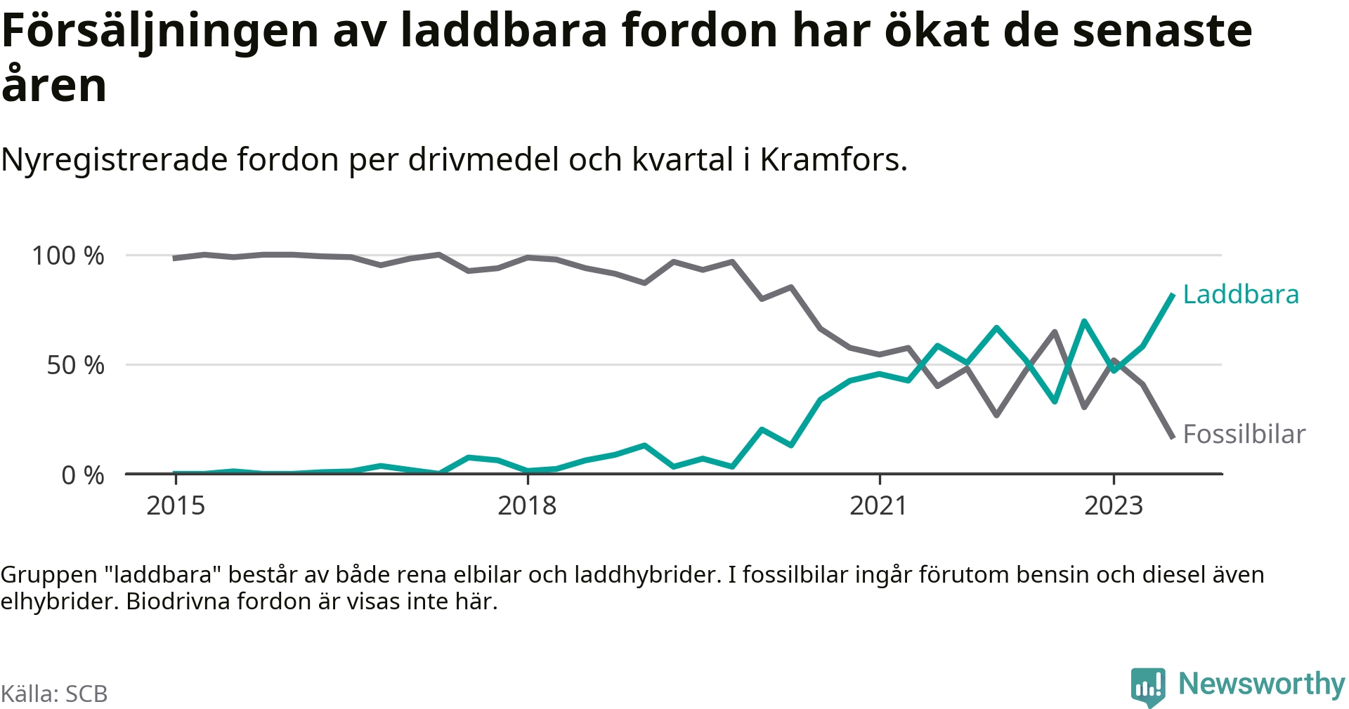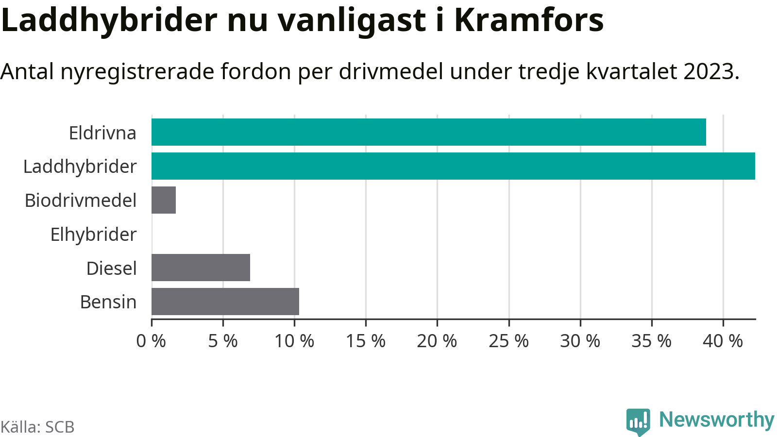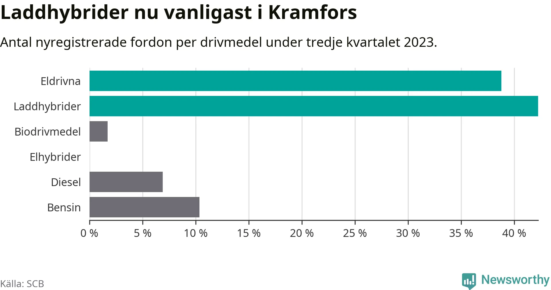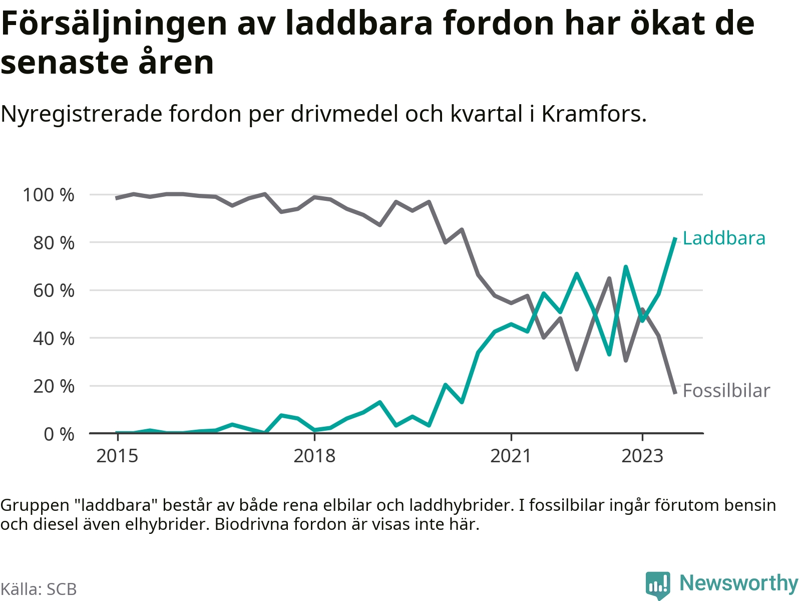 Under tredje kvartalet 2023 var 81 procent av alla nyregistrerade personbilar i Kramfors laddbara (sammanlagt registrerades 116 nya bilar). Merparten av de laddbara bilarna var så kallade laddhybrider, det vill säga fordon som går att ladda och köra på el, men som även har en förbränningsmotor. 39 procent av alla nya bilar var rena elbilar.