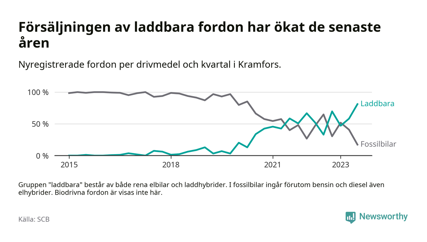 Jämfört med andra kommuner sticker Kramfors ut med en väldigt hög andel elbilar och laddhybrider. Under tredje kvartalet var andelen laddbara bilar av alla nyregistreringar rentav högst i hela landet.
