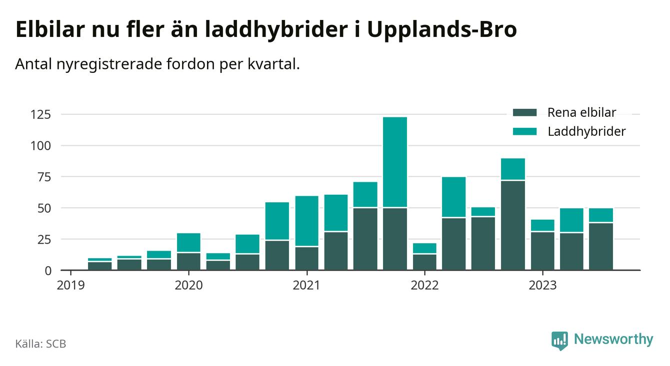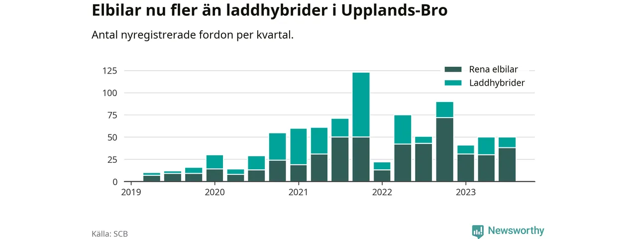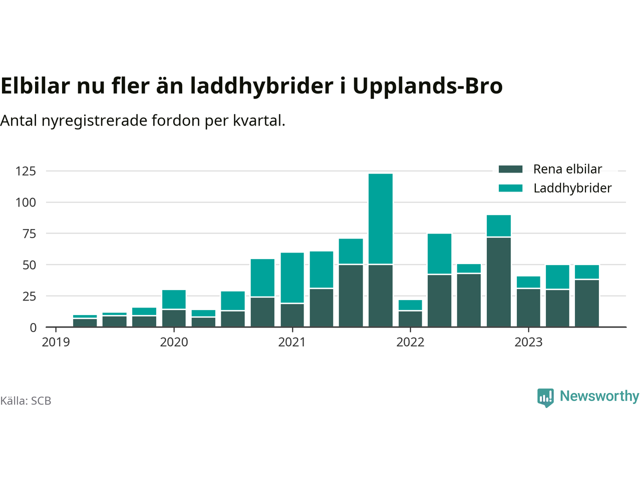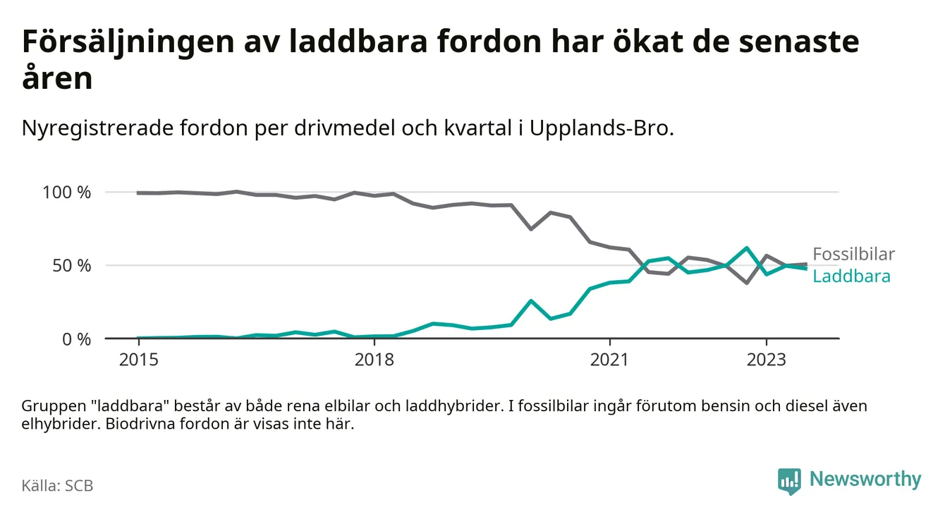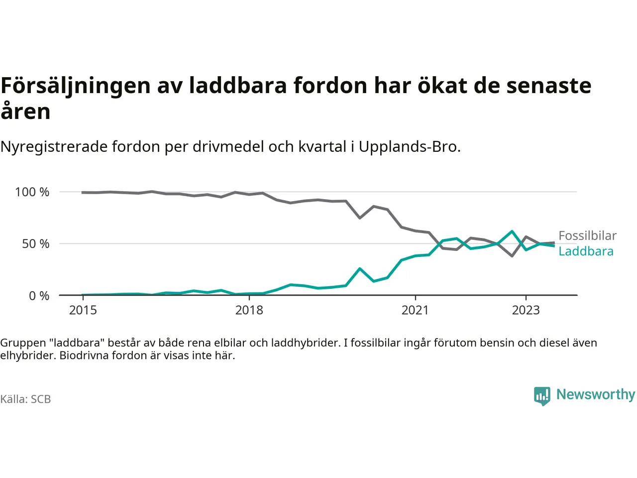 Under tredje kvartalet 2023 var 48 procent av alla nyregistrerade personbilar i Upplands-Bro laddbara (sammanlagt registrerades 105 nya bilar). Merparten av de laddbara bilarna var rena elbilar (36 procent av alla).
