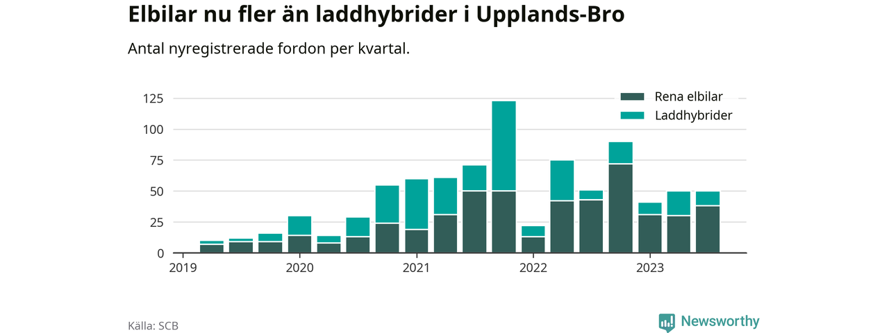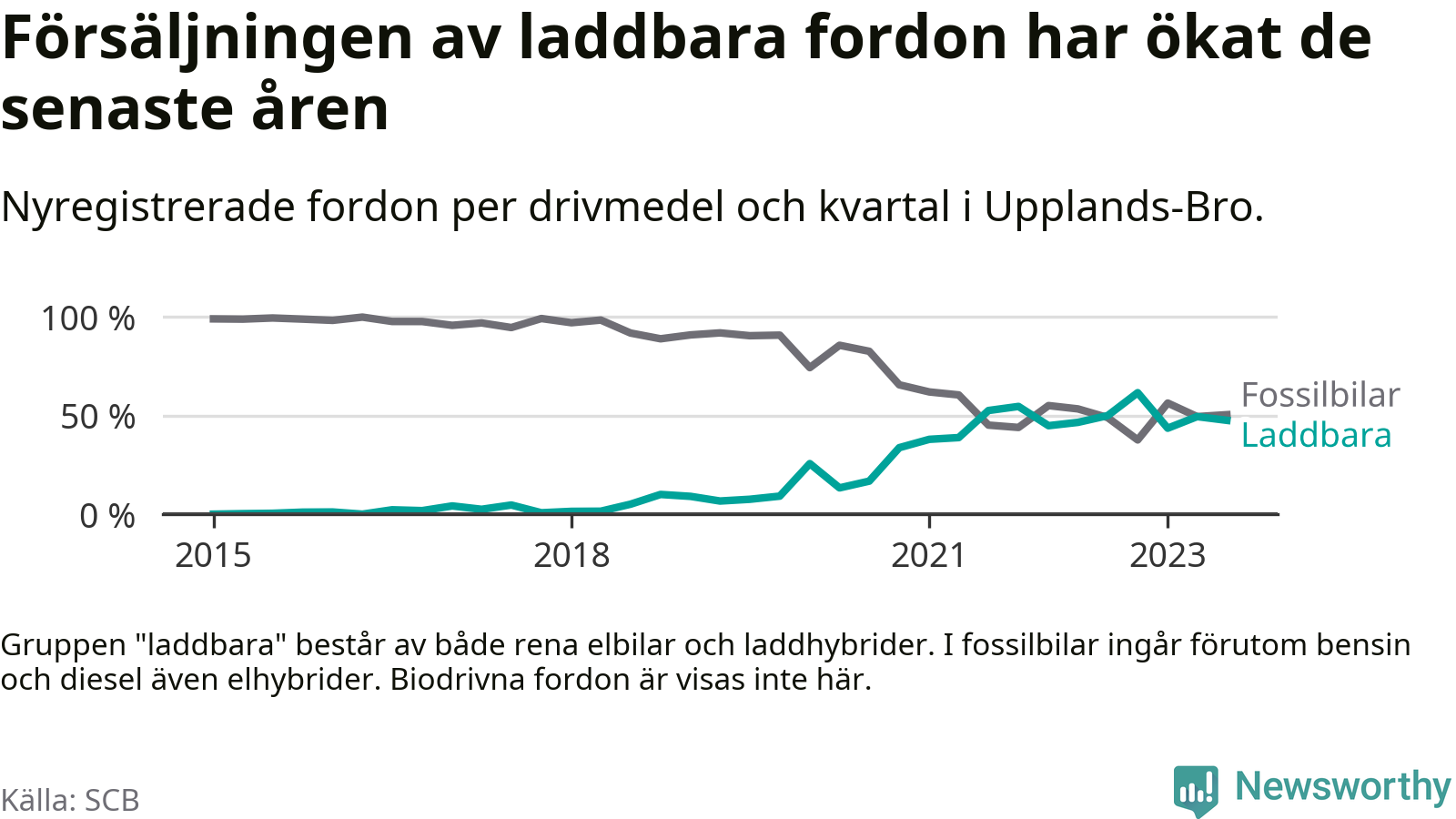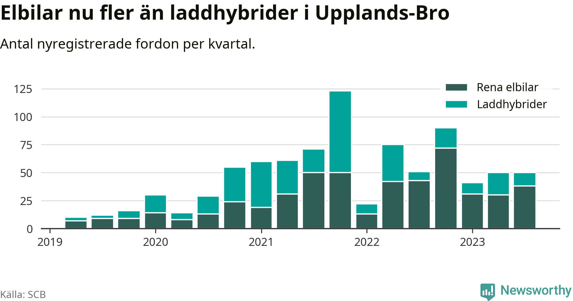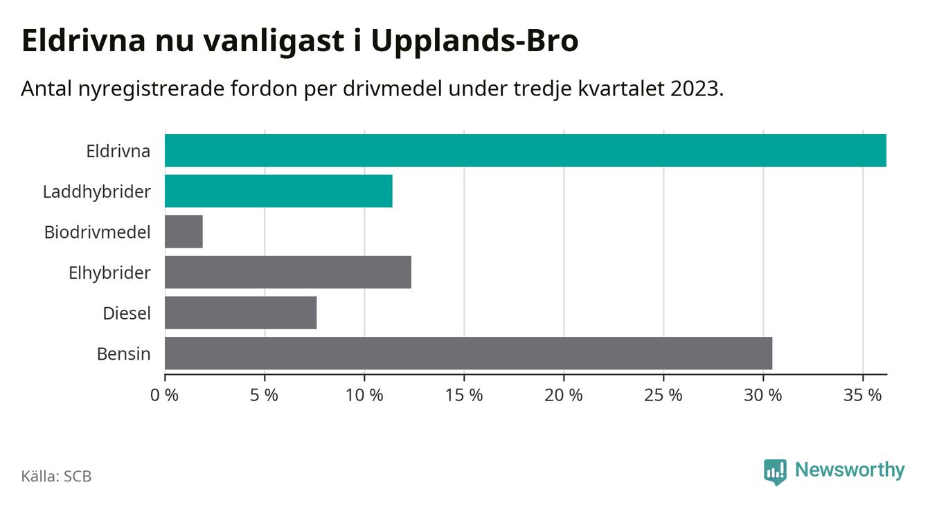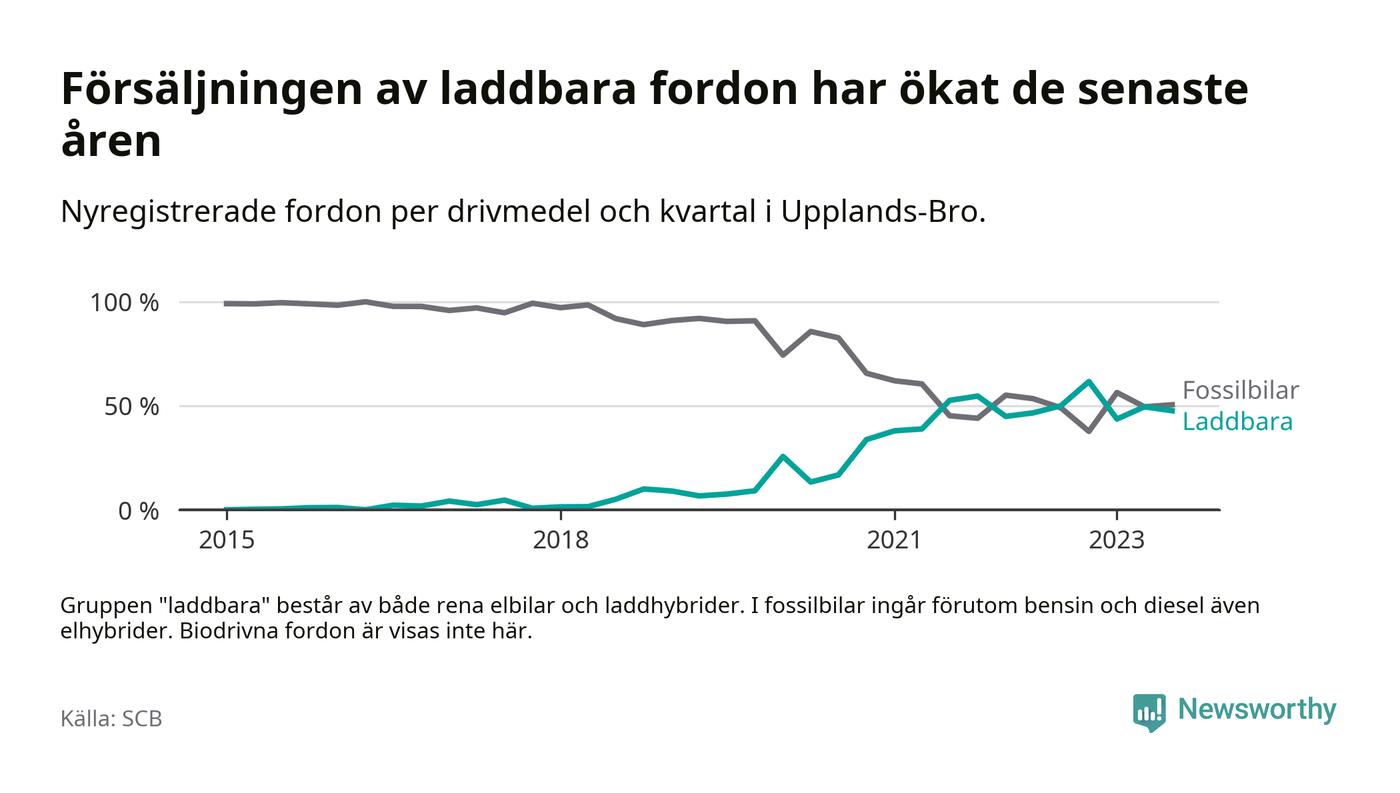 Under tredje kvartalet 2023 var 48 procent av alla nyregistrerade personbilar i Upplands-Bro laddbara (sammanlagt registrerades 105 nya bilar). Merparten av de laddbara bilarna var rena elbilar (36 procent av alla).
