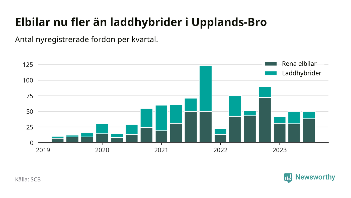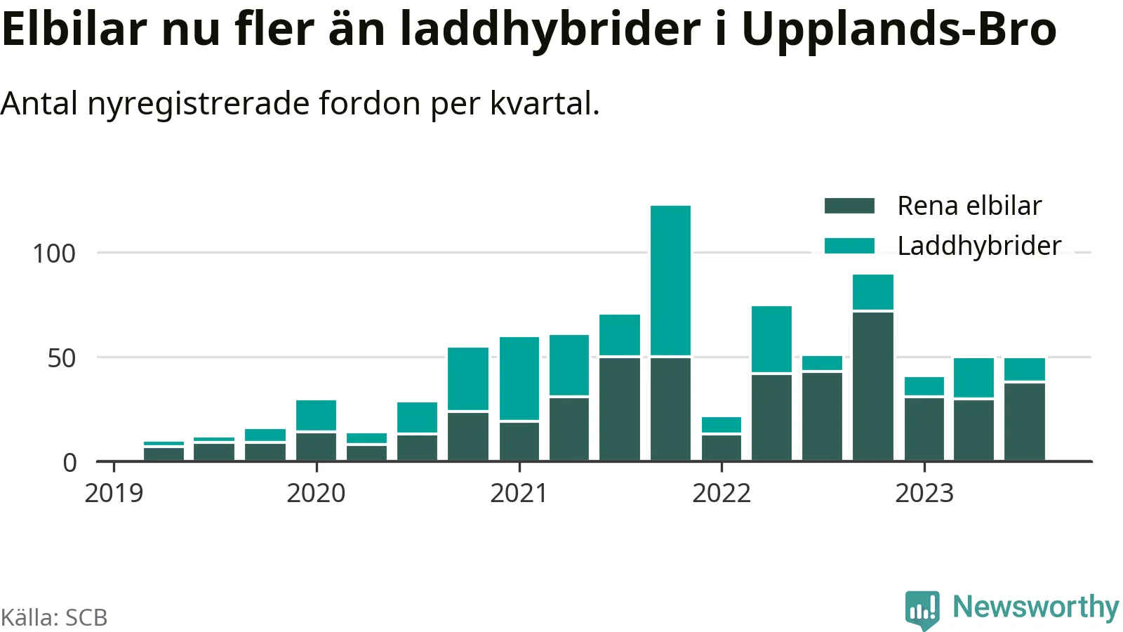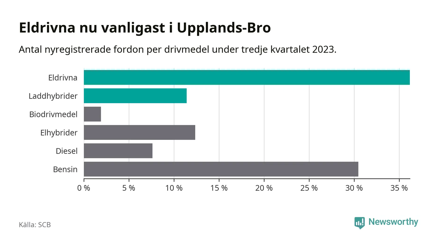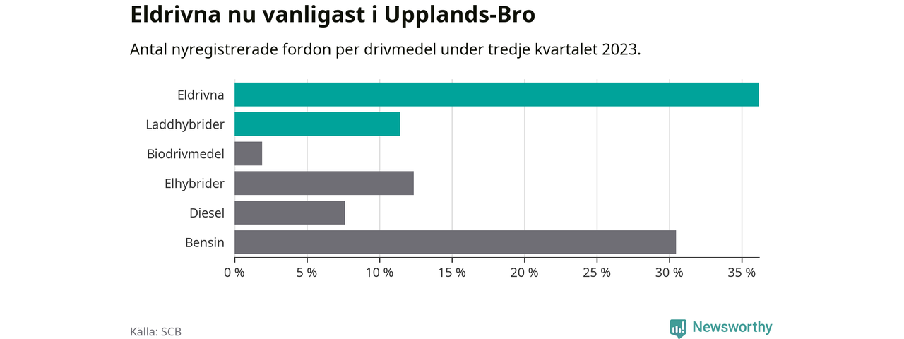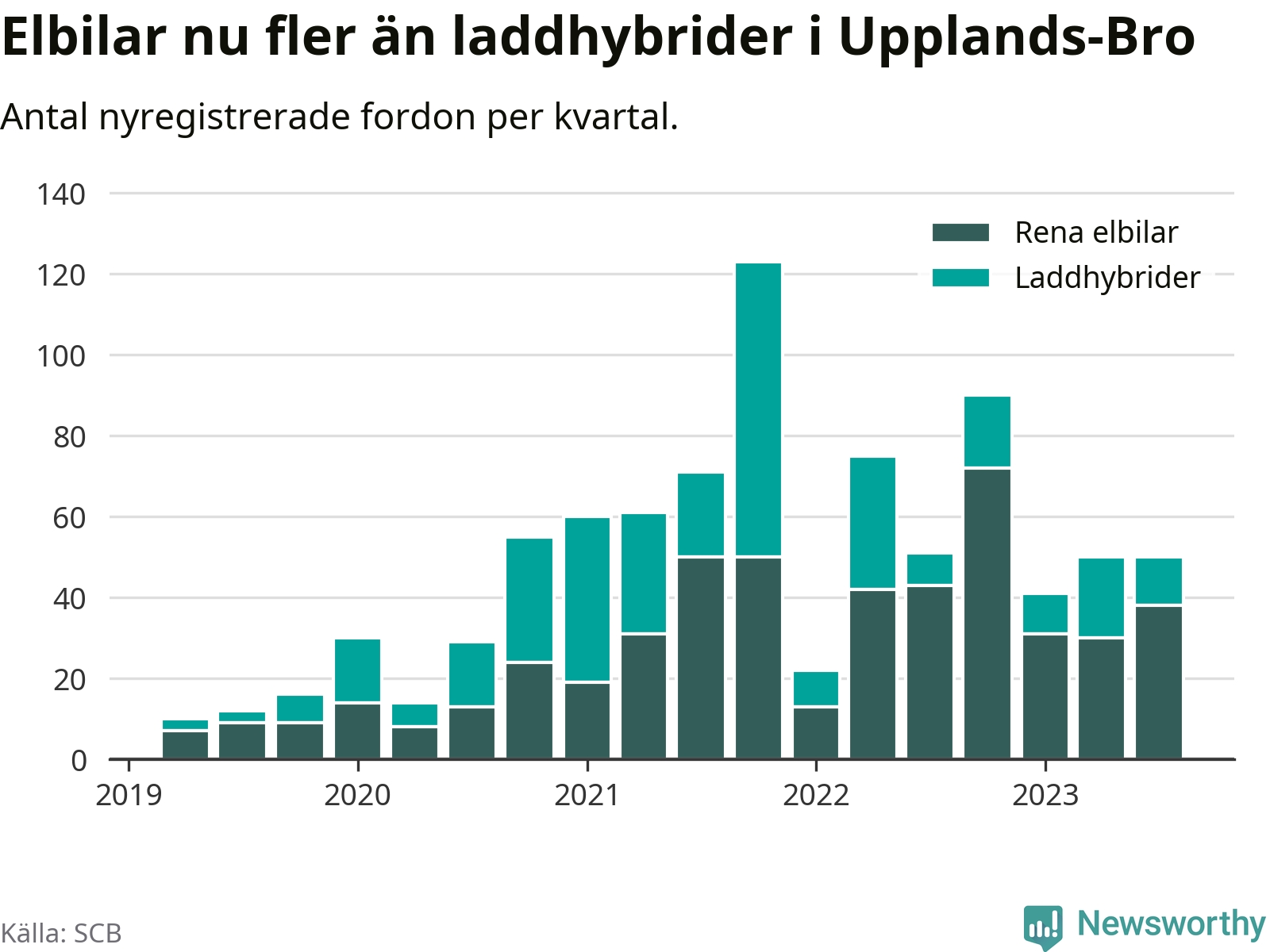 Under tredje kvartalet 2023 var 48 procent av alla nyregistrerade personbilar i Upplands-Bro laddbara (sammanlagt registrerades 105 nya bilar). Merparten av de laddbara bilarna var rena elbilar (36 procent av alla).