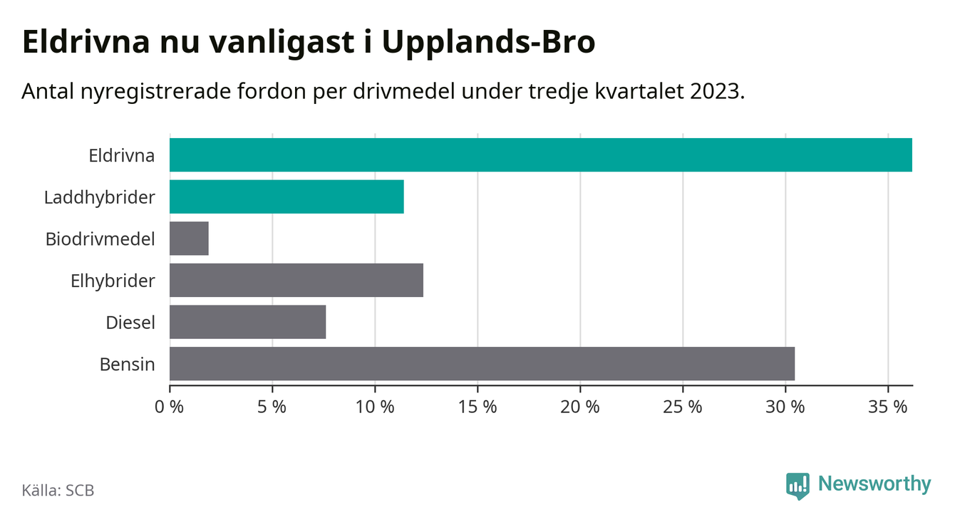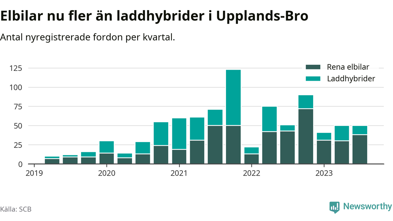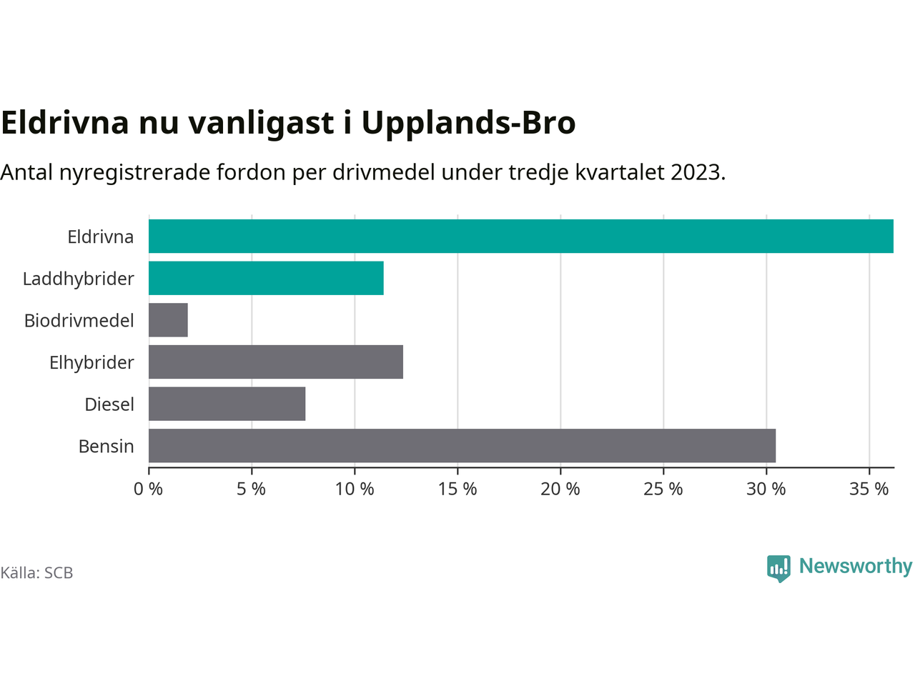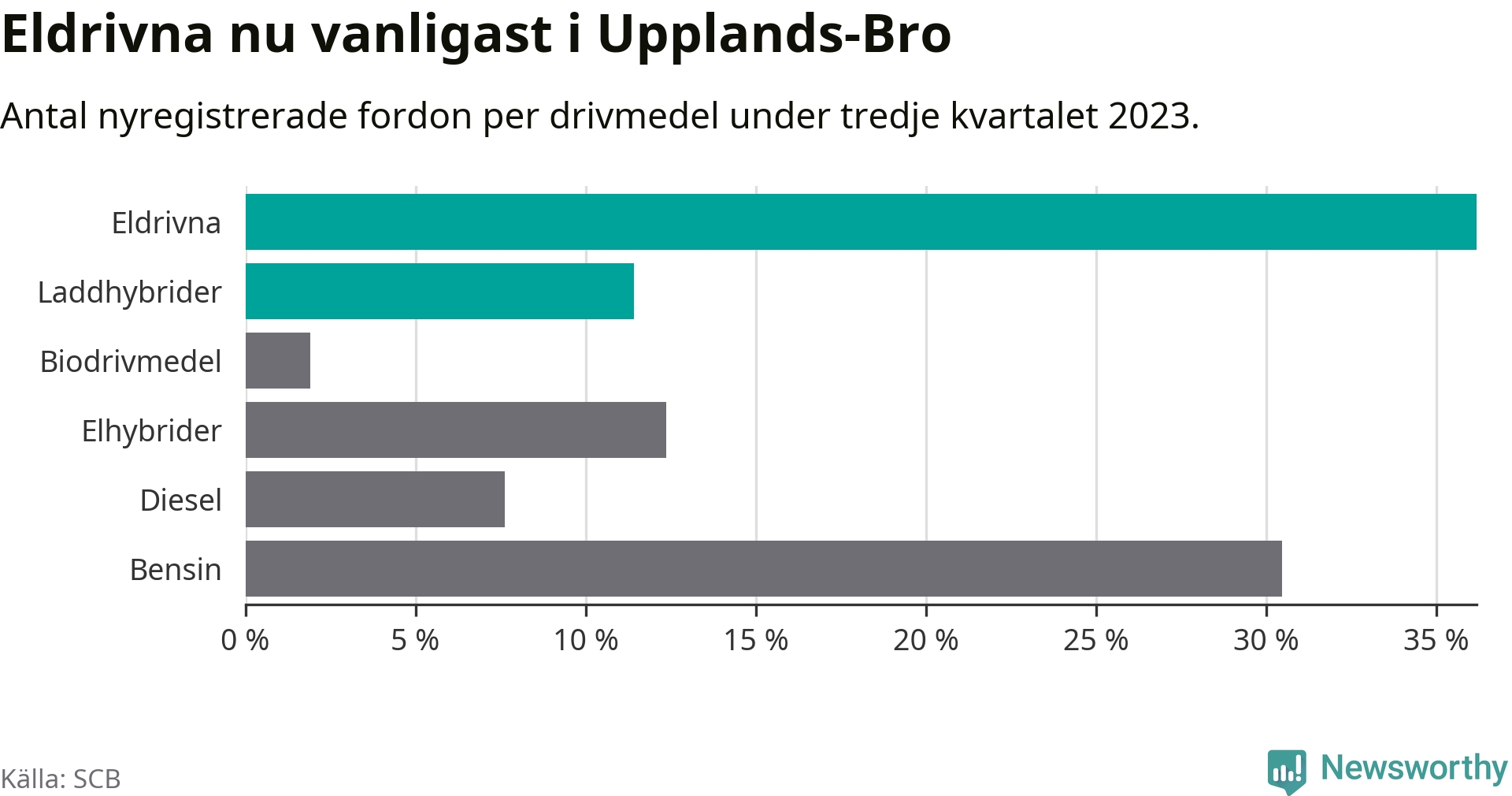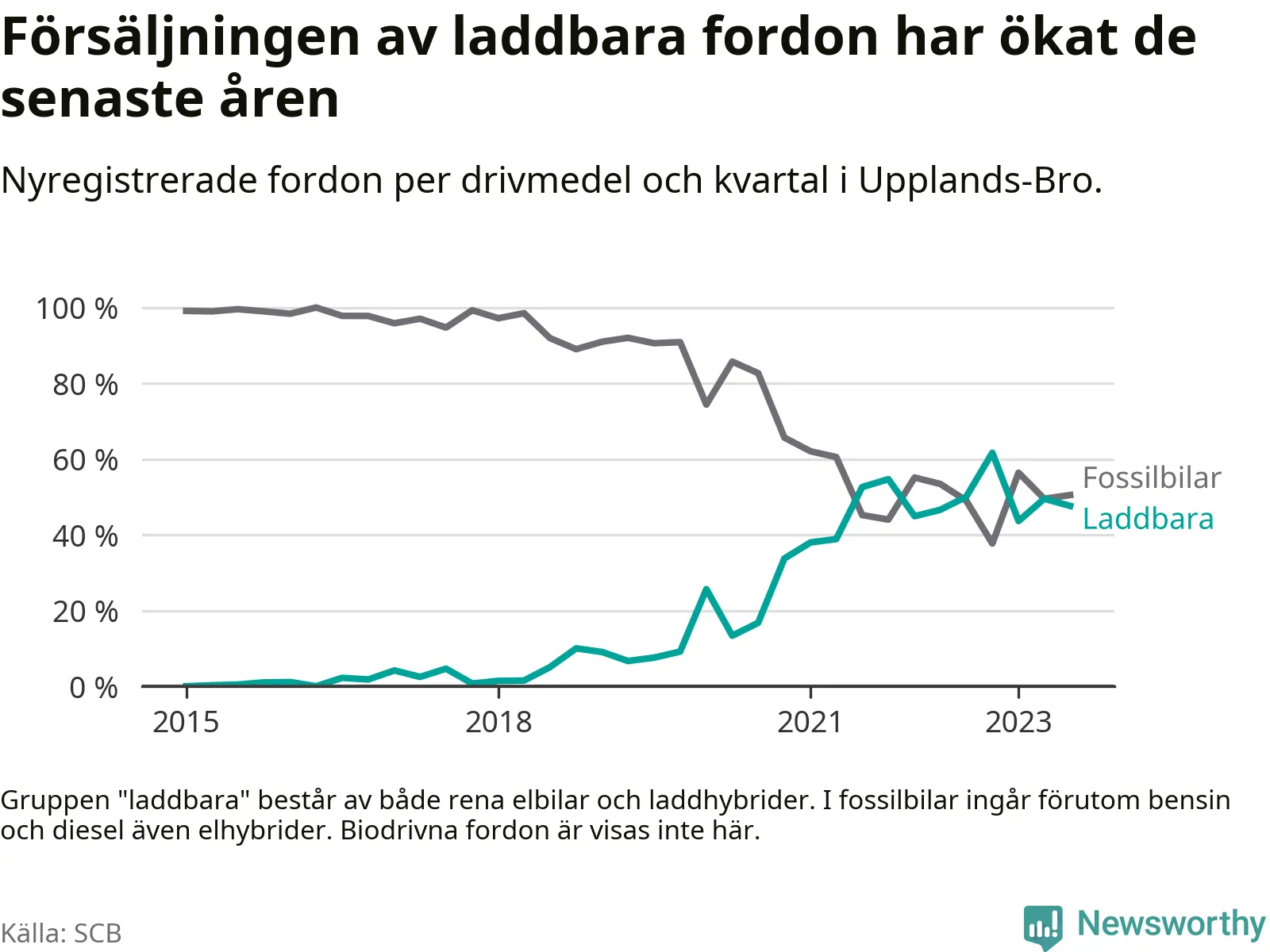 Under tredje kvartalet 2023 var 48 procent av alla nyregistrerade personbilar i Upplands-Bro laddbara (sammanlagt registrerades 105 nya bilar). Merparten av de laddbara bilarna var rena elbilar (36 procent av alla).