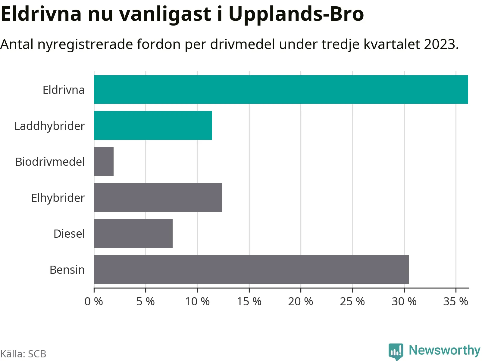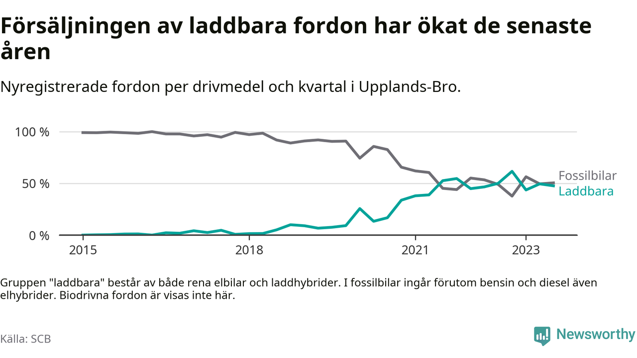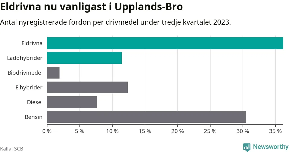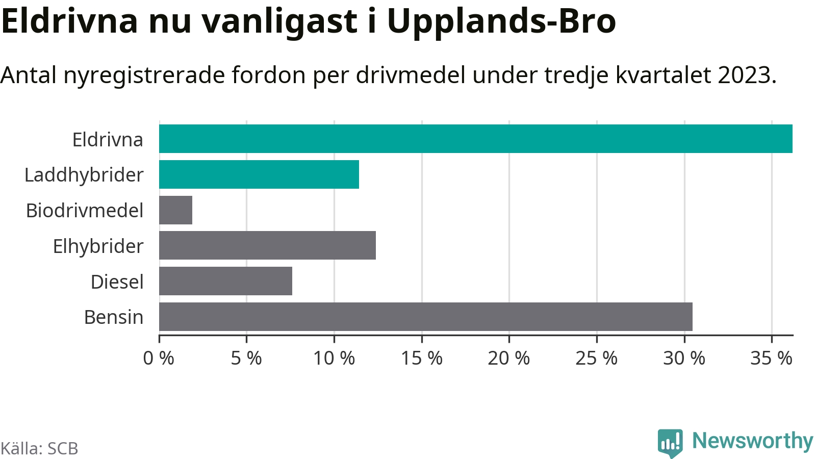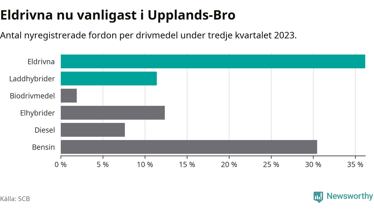 Under tredje kvartalet 2023 var 48 procent av alla nyregistrerade personbilar i Upplands-Bro laddbara (sammanlagt registrerades 105 nya bilar). Merparten av de laddbara bilarna var rena elbilar (36 procent av alla).