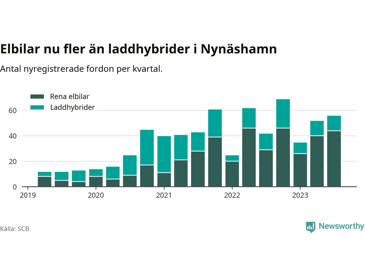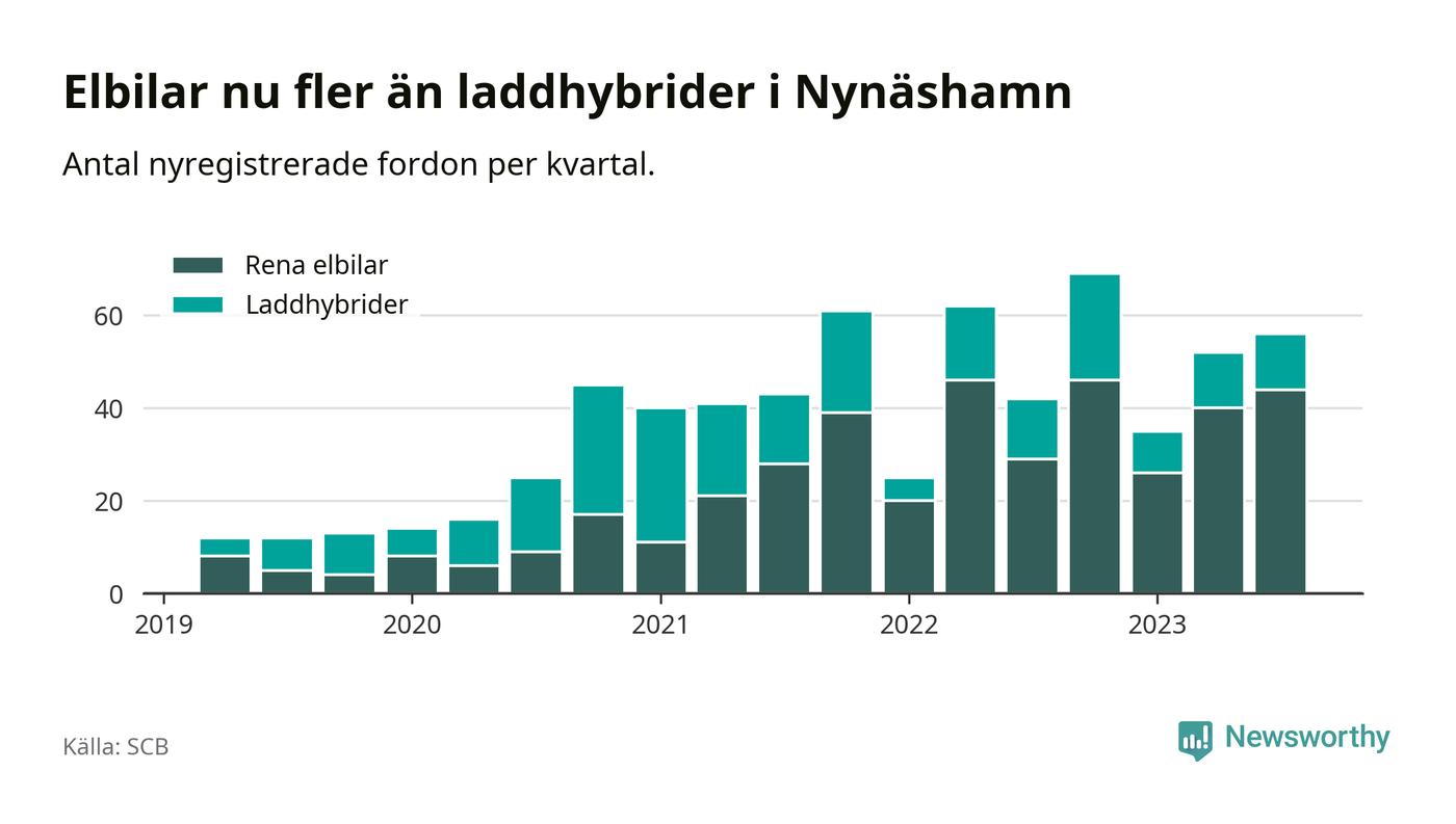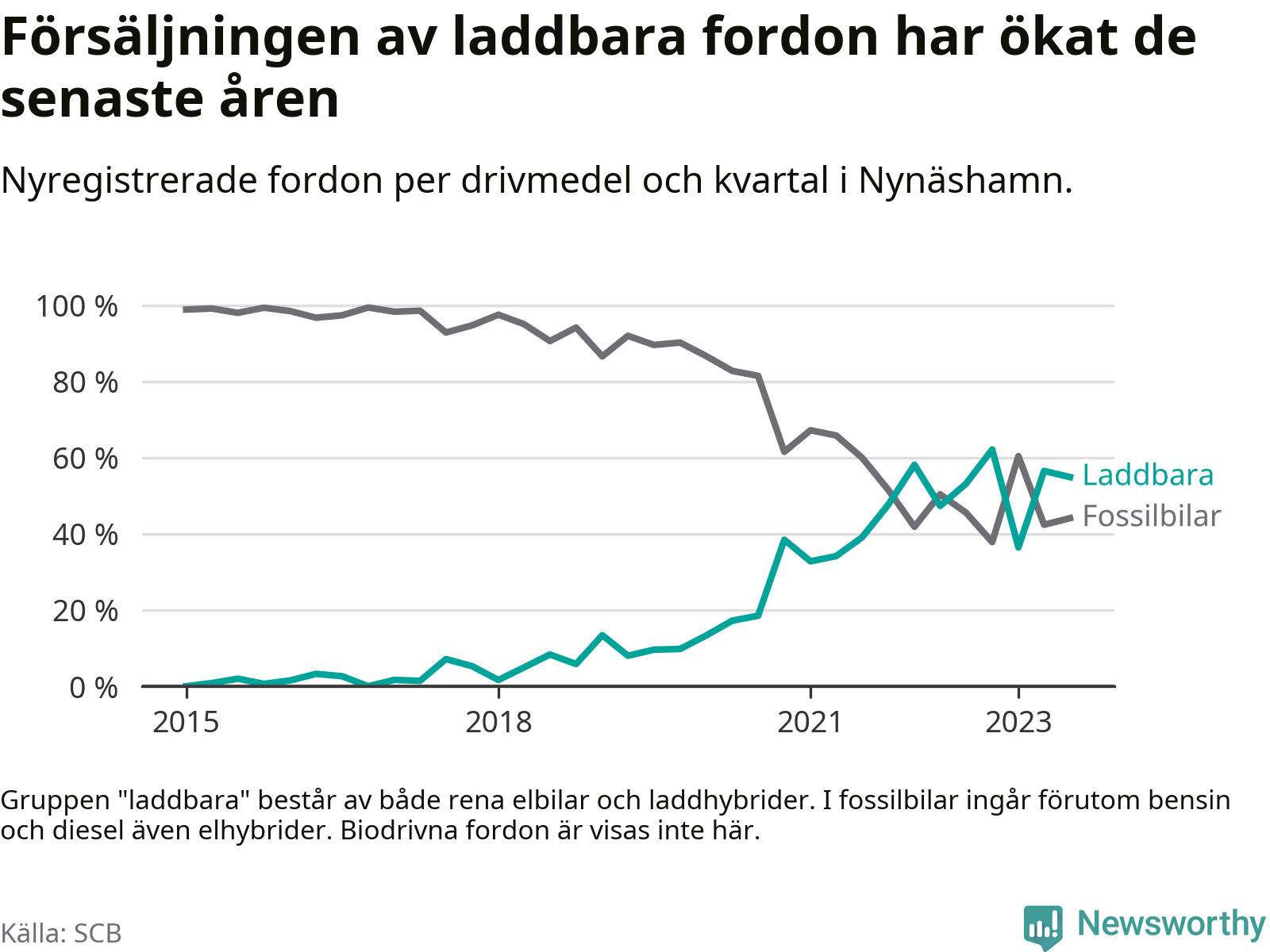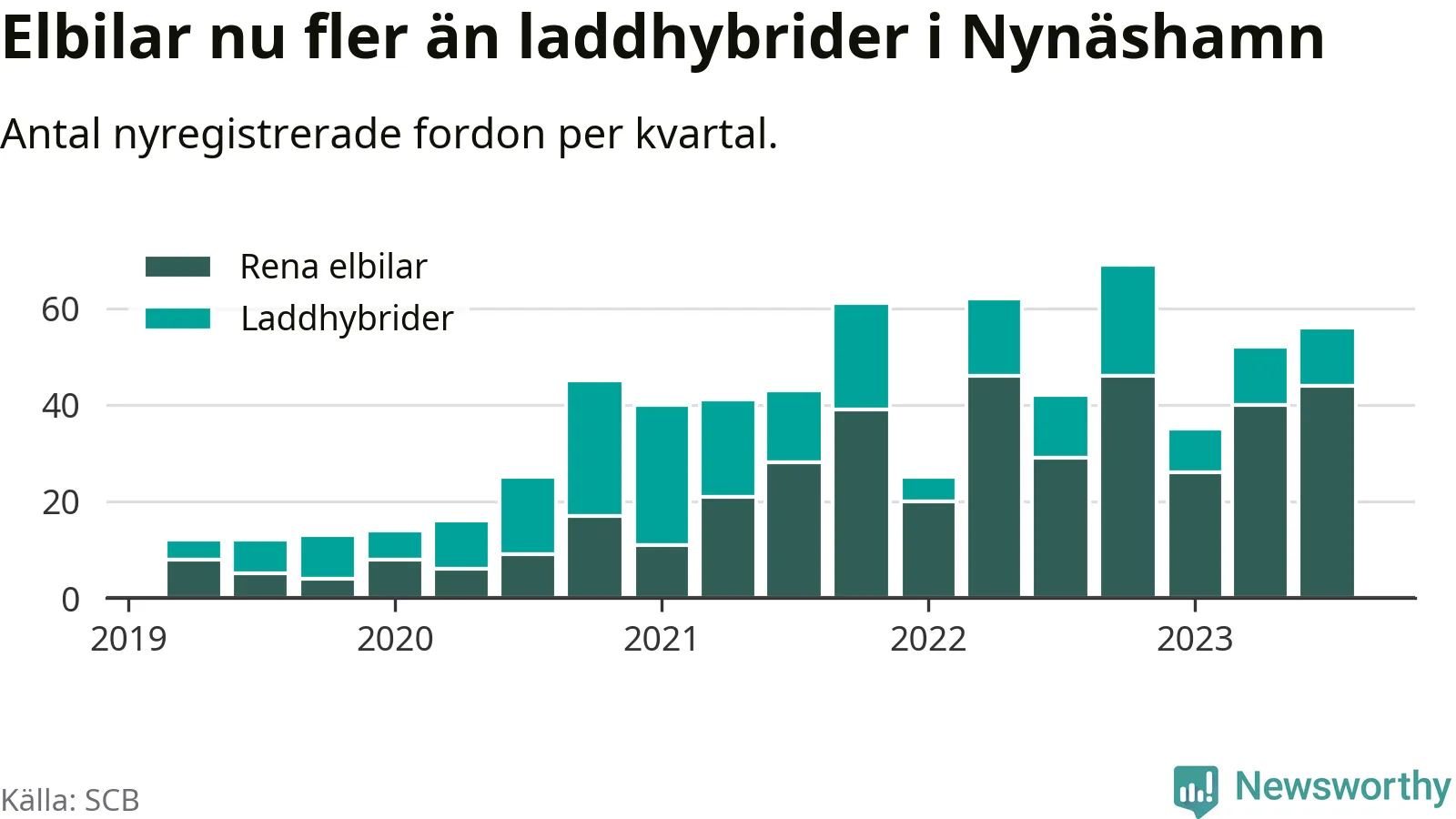 Under tredje kvartalet 2023 var 55 procent av alla nyregistrerade personbilar i Nynäshamn laddbara (sammanlagt registrerades 102 nya bilar). Merparten av de laddbara bilarna var rena elbilar (43 procent av alla).