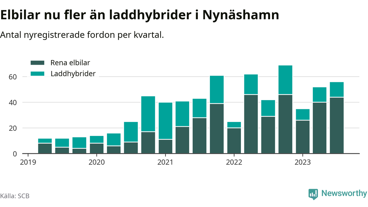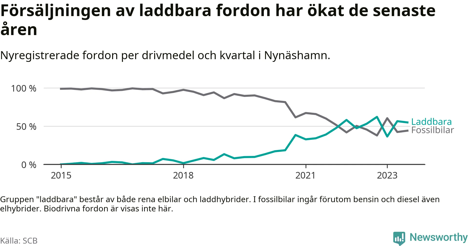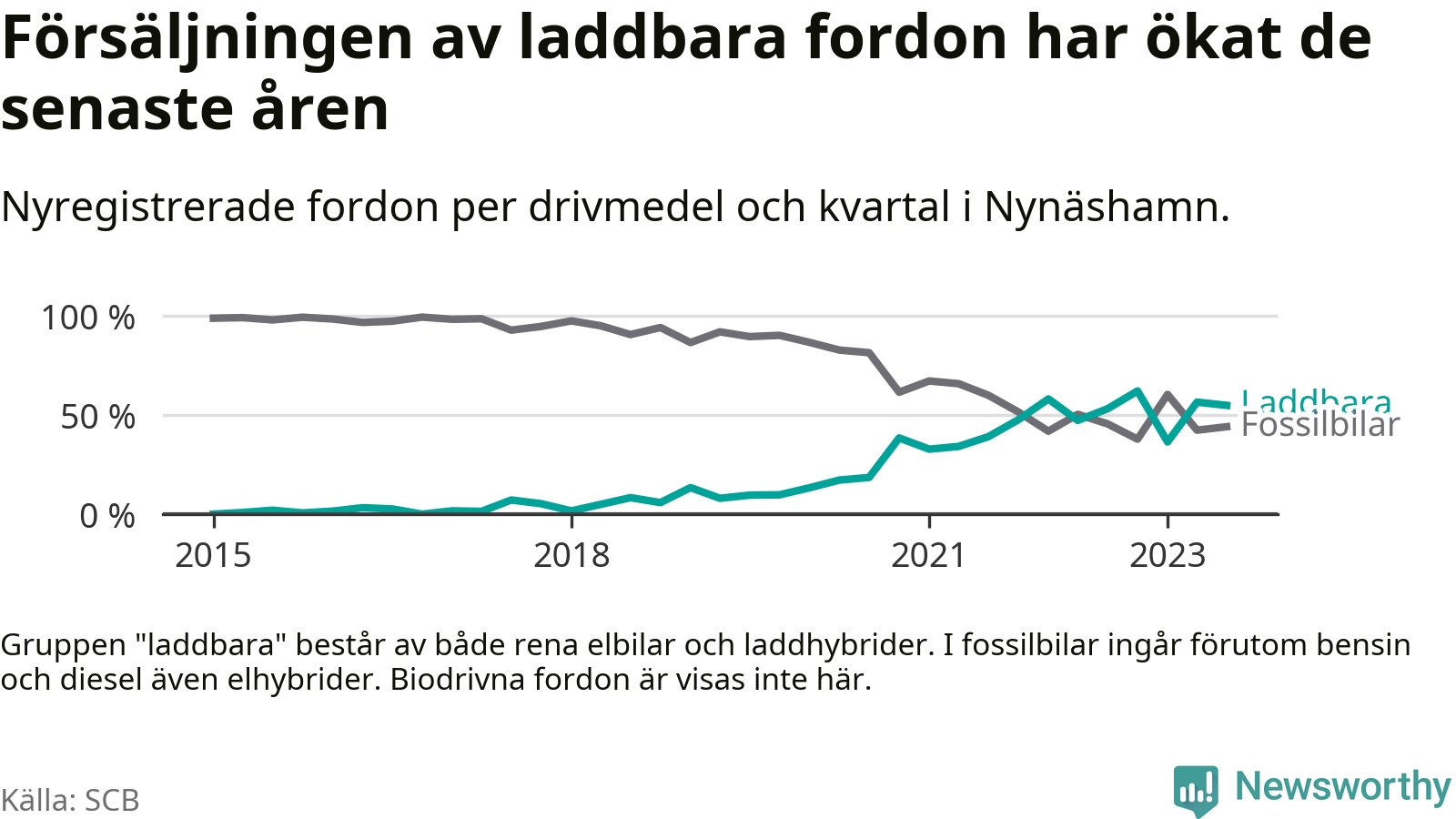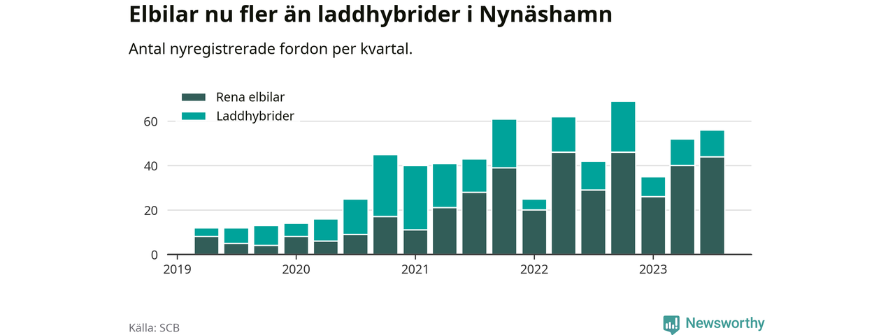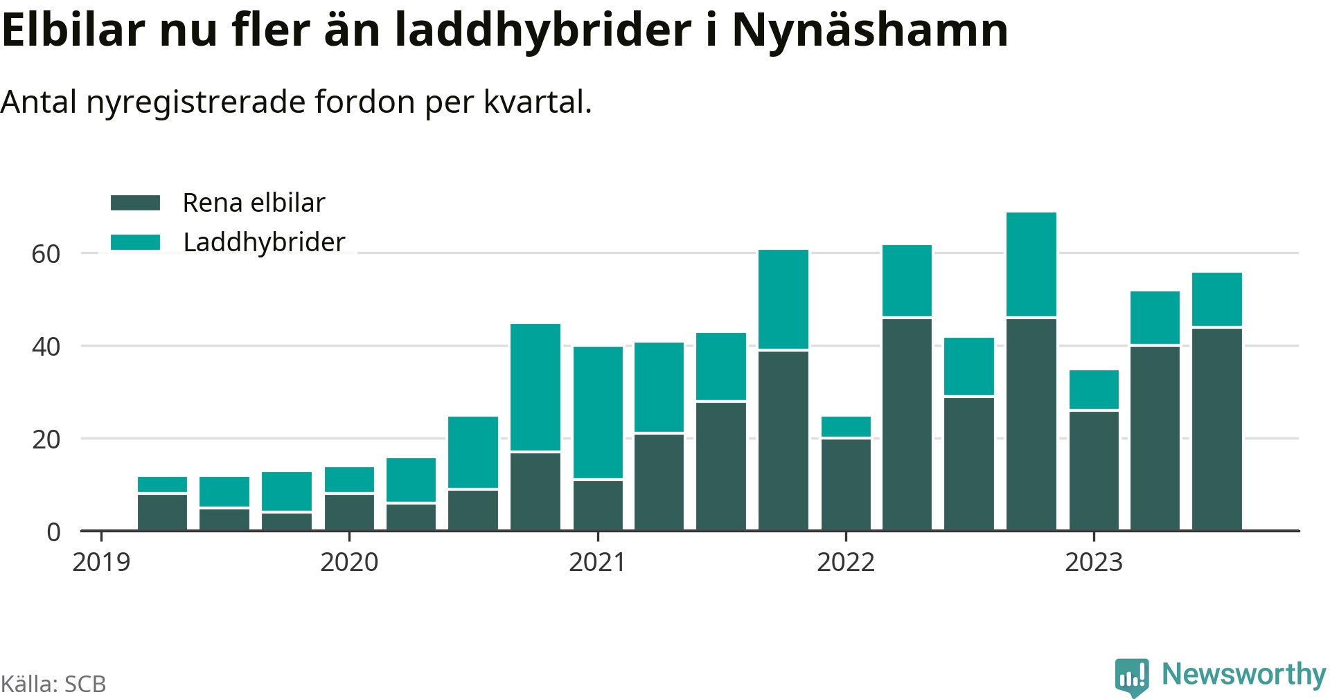 Under tredje kvartalet 2023 var 55 procent av alla nyregistrerade personbilar i Nynäshamn laddbara (sammanlagt registrerades 102 nya bilar). Merparten av de laddbara bilarna var rena elbilar (43 procent av alla).