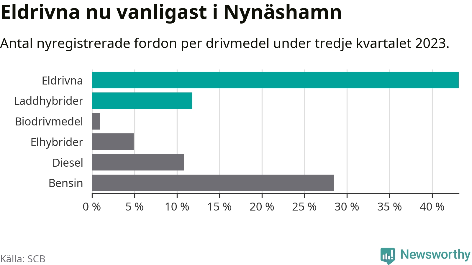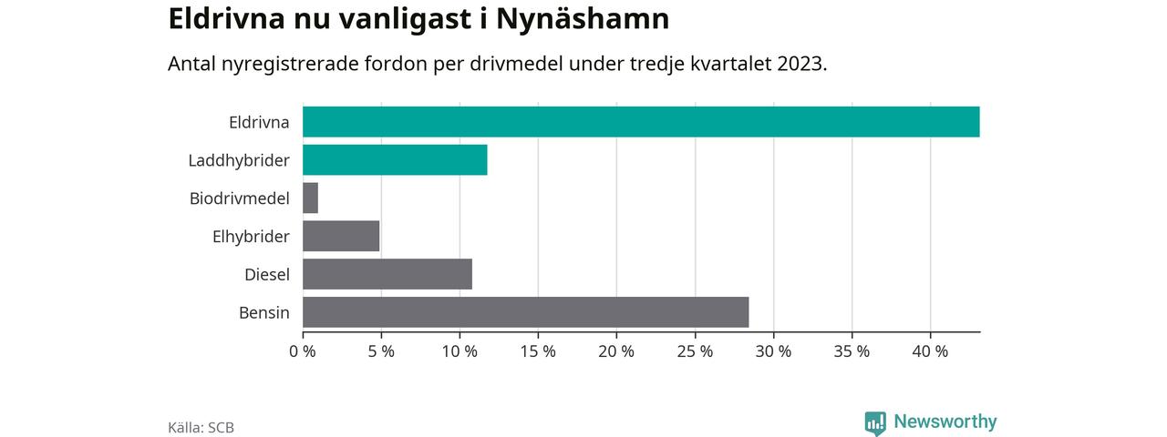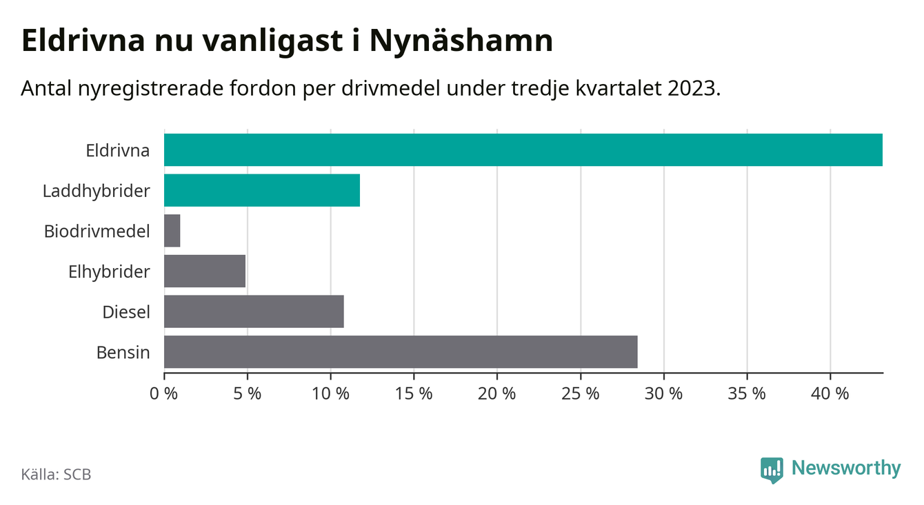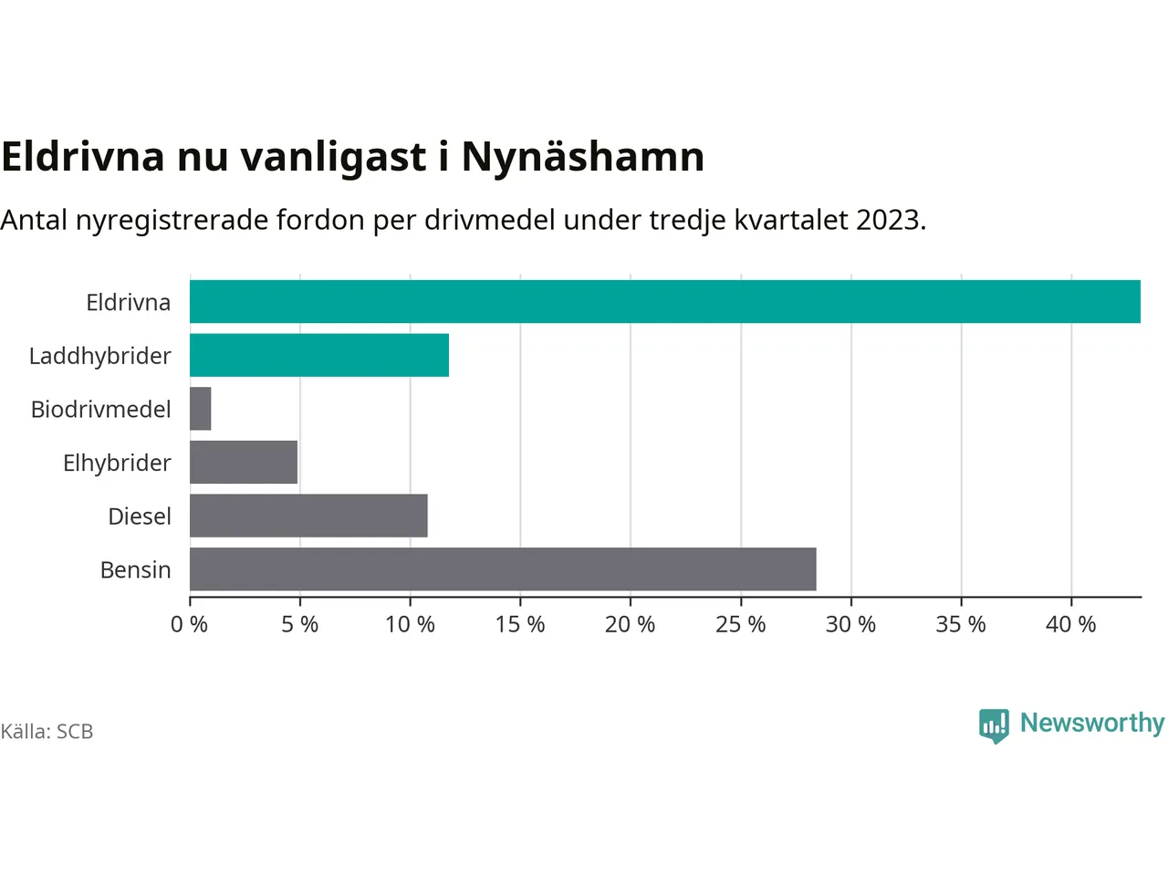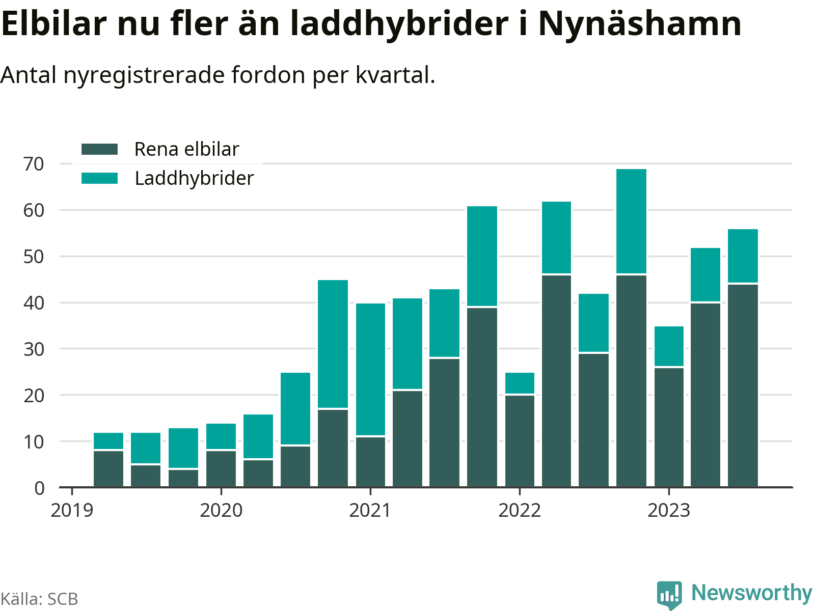 Under tredje kvartalet 2023 var 55 procent av alla nyregistrerade personbilar i Nynäshamn laddbara (sammanlagt registrerades 102 nya bilar). Merparten av de laddbara bilarna var rena elbilar (43 procent av alla).