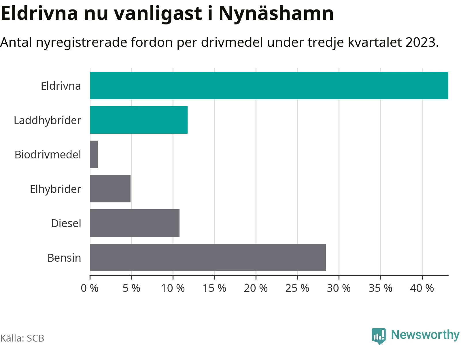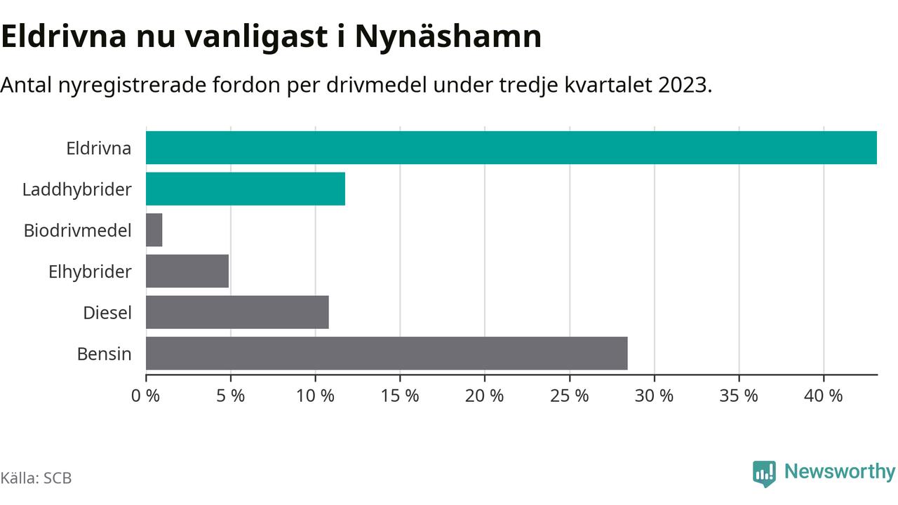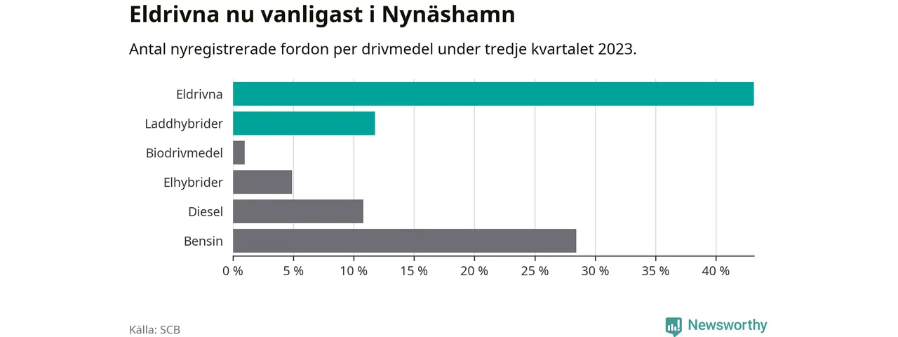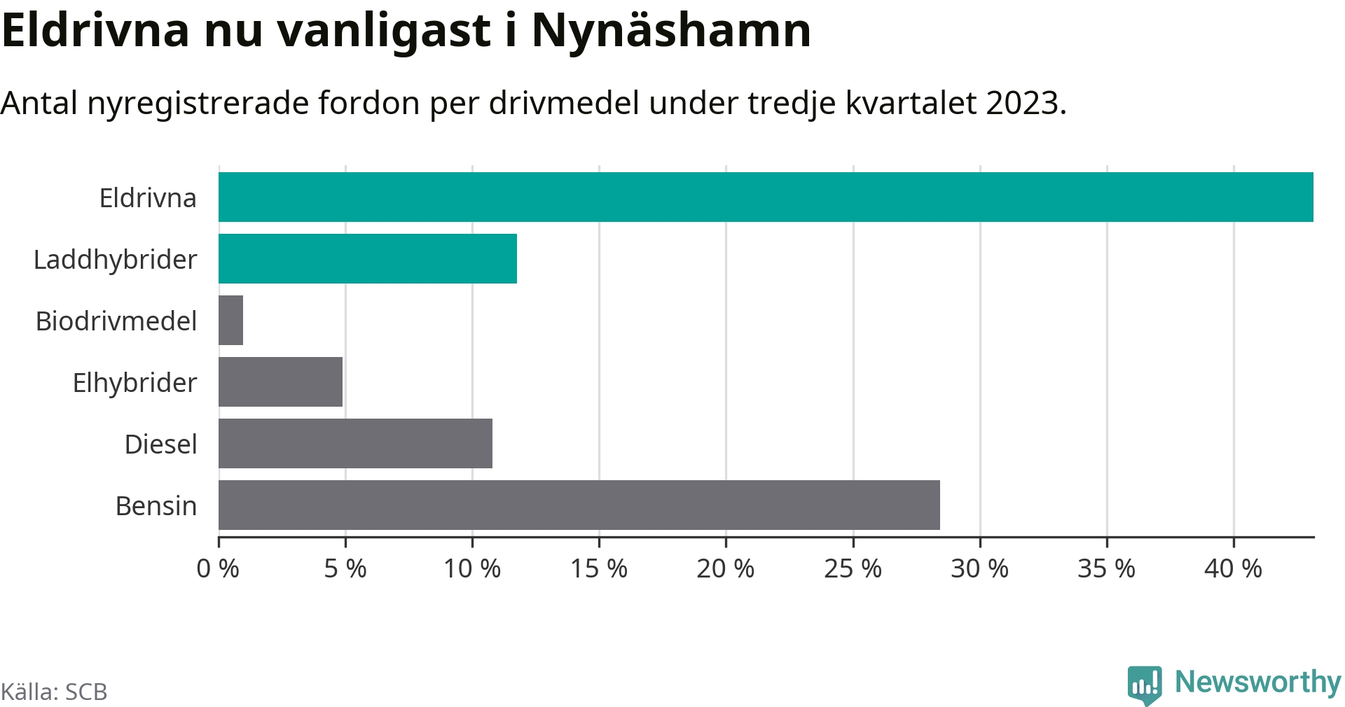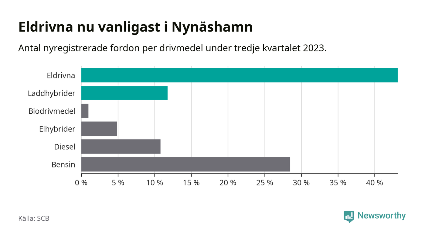 Under tredje kvartalet 2023 var 55 procent av alla nyregistrerade personbilar i Nynäshamn laddbara (sammanlagt registrerades 102 nya bilar). Merparten av de laddbara bilarna var rena elbilar (43 procent av alla).