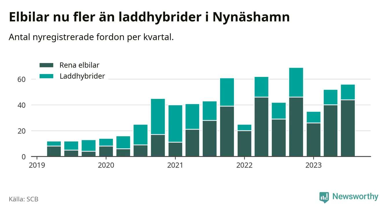 Elbilar och laddhybrider har ökat i försäljning de senaste åren, men under tredje kvartalet minskade de laddbara bilarnas andel av nyregistreringarna i Nynäshamns kommun. Och då har effekten av den slopade elbilsbonusen inte gett fullt utslag ännu.