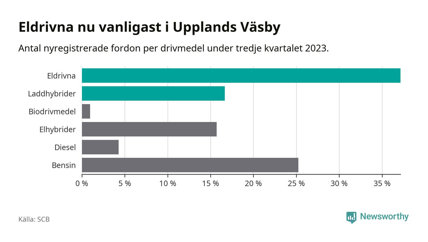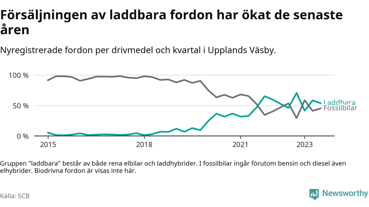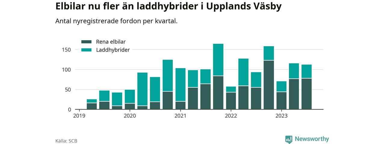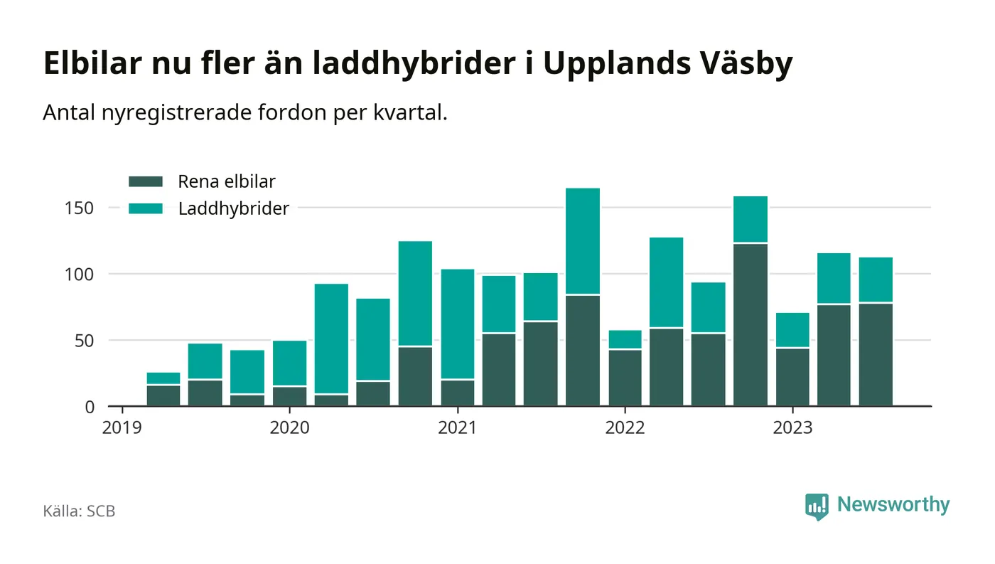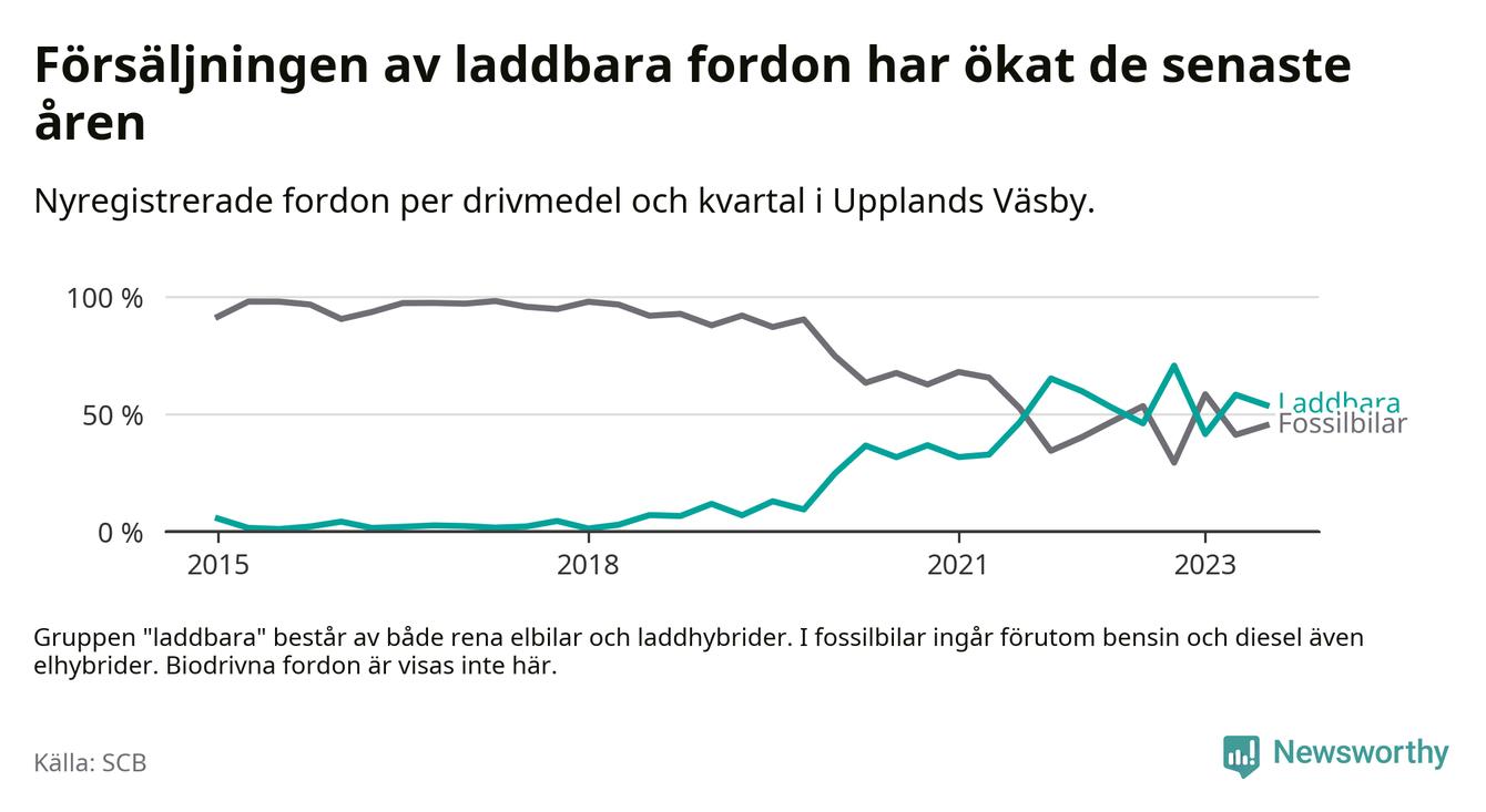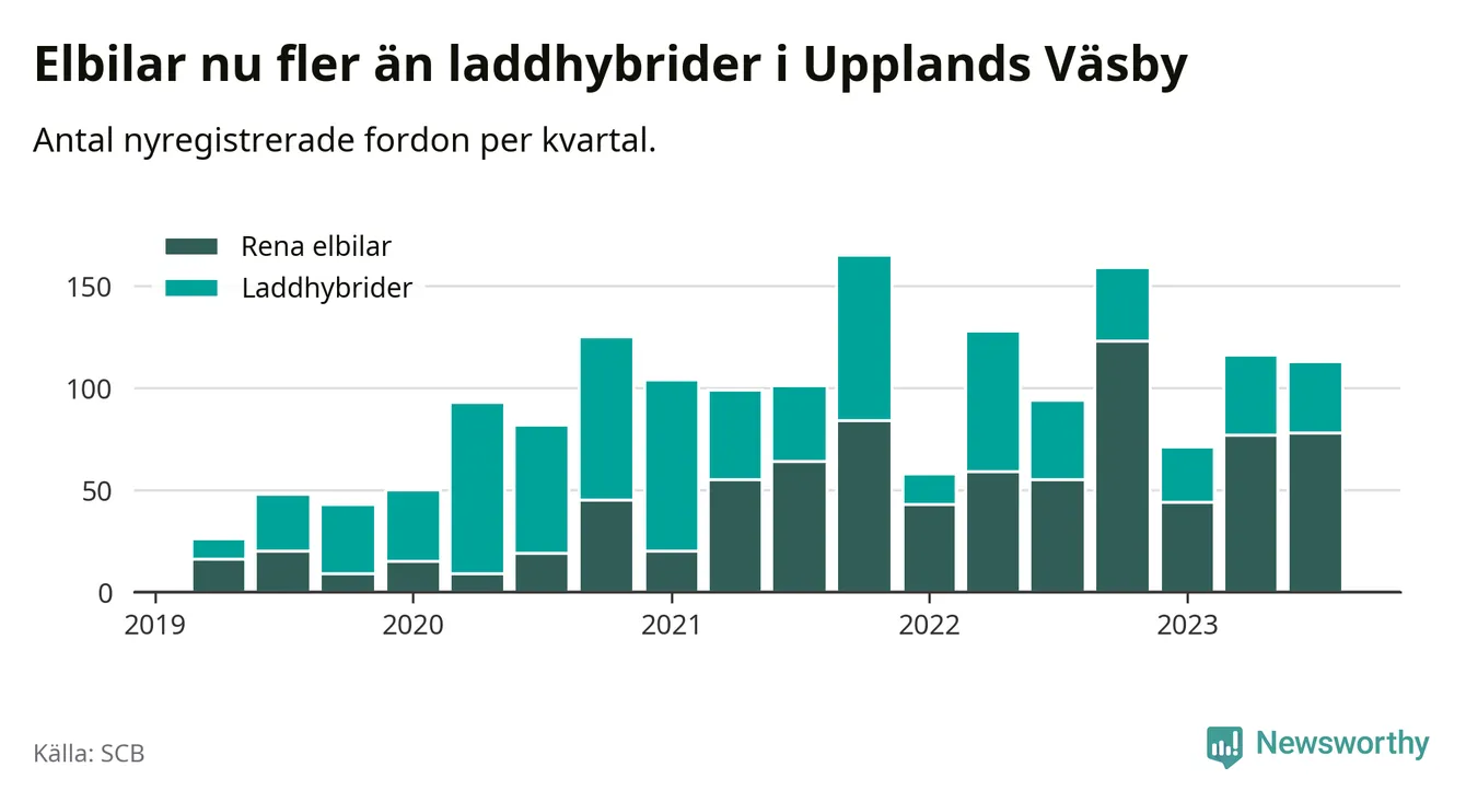 Under tredje kvartalet 2023 var 54 procent av alla nyregistrerade personbilar i Upplands Väsby laddbara (sammanlagt registrerades 210 nya bilar). Merparten av de laddbara bilarna var rena elbilar (37 procent av alla).
