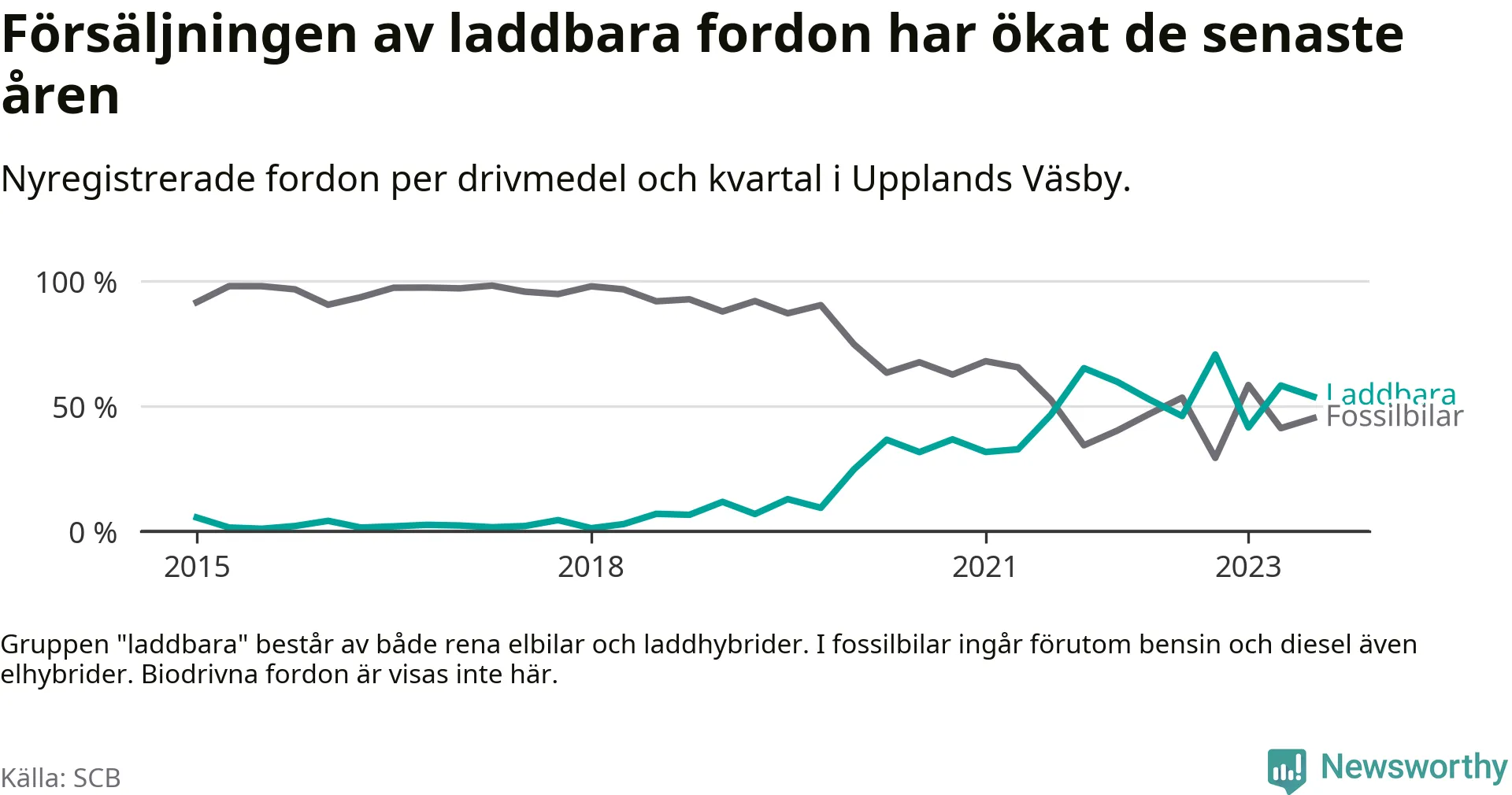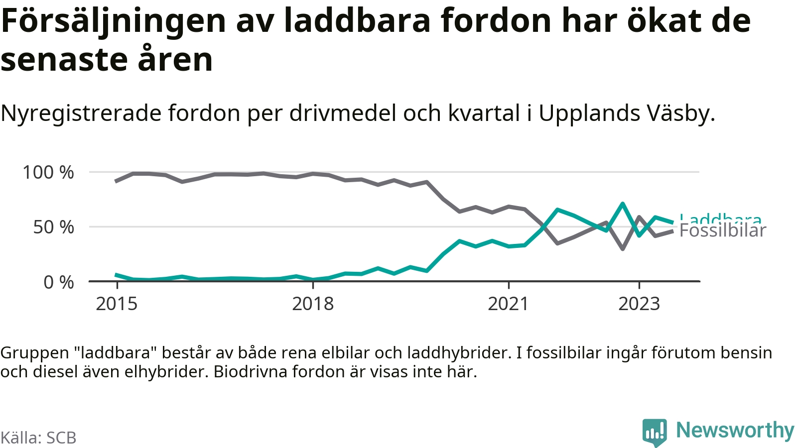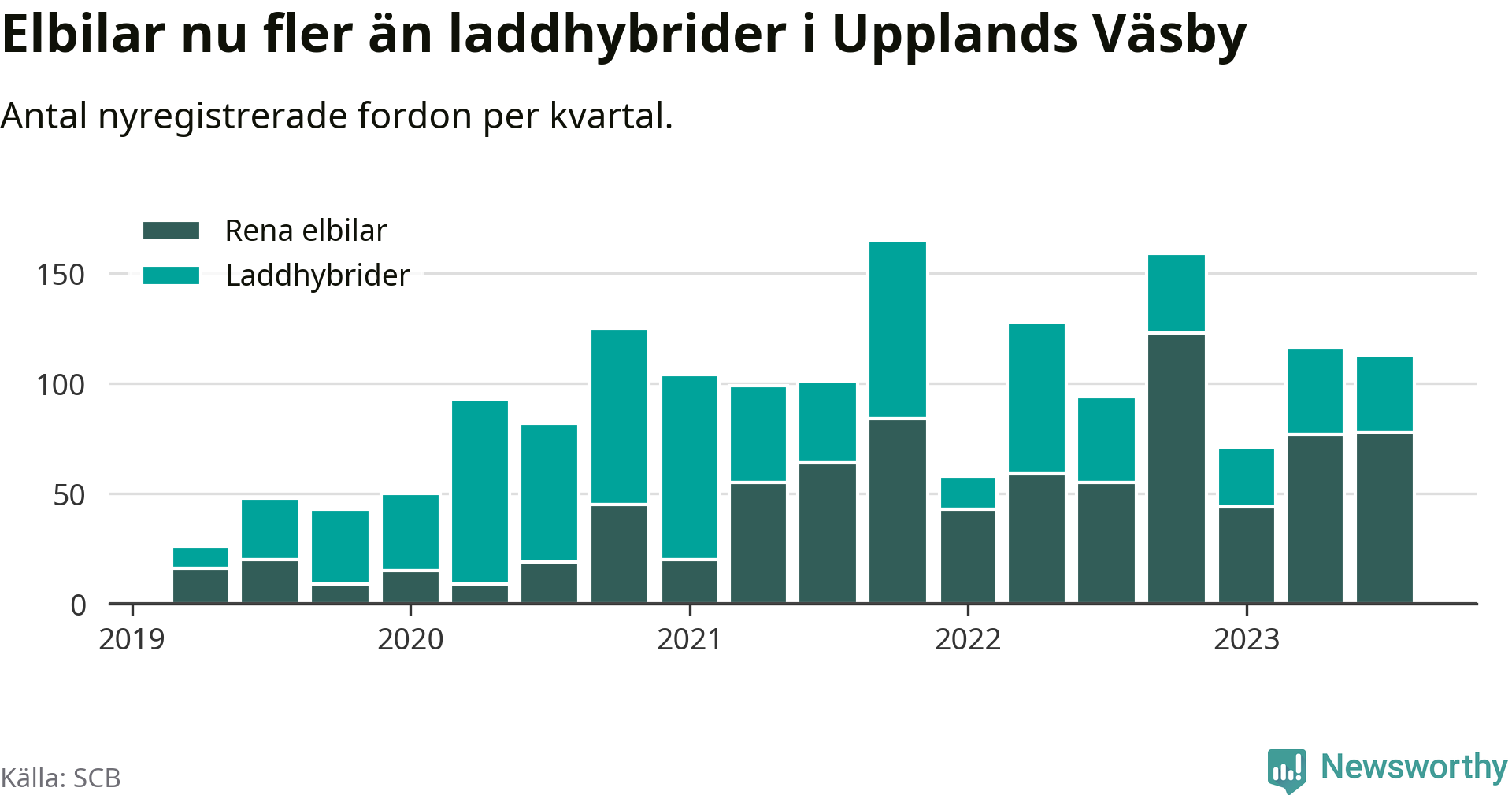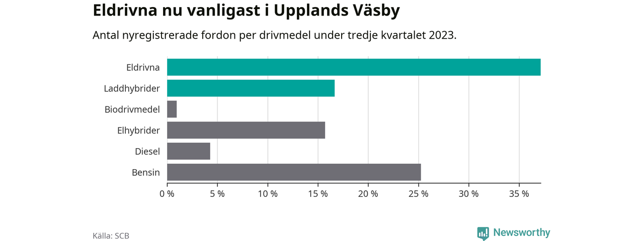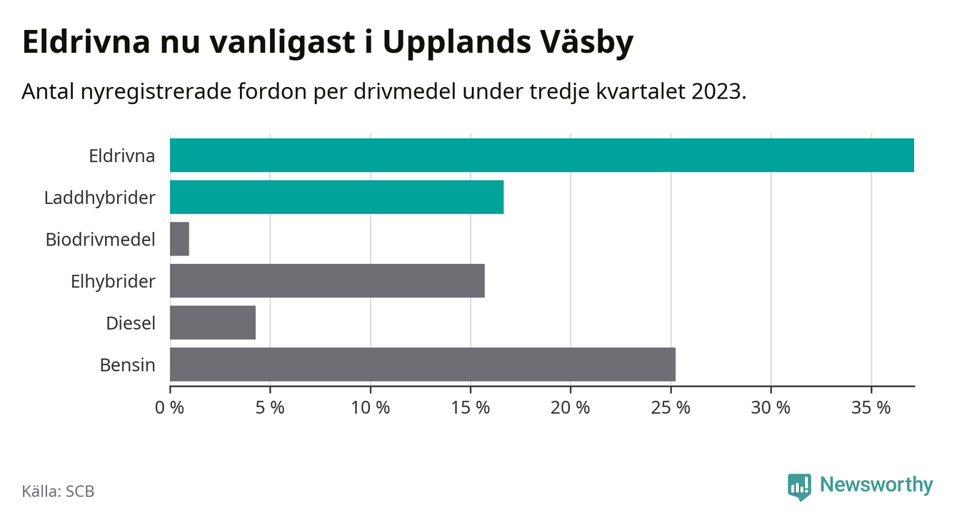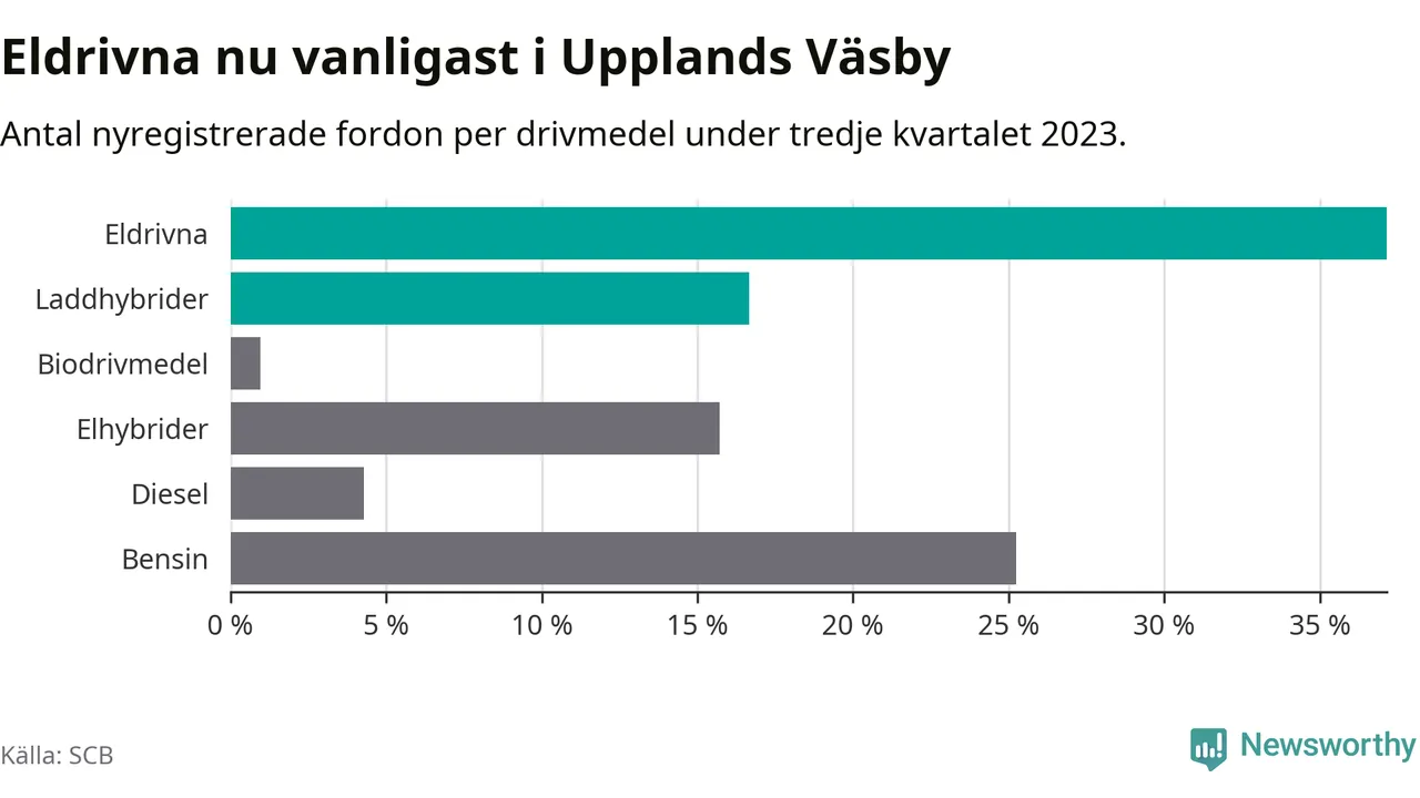 Under tredje kvartalet 2023 var 54 procent av alla nyregistrerade personbilar i Upplands Väsby laddbara (sammanlagt registrerades 210 nya bilar). Merparten av de laddbara bilarna var rena elbilar (37 procent av alla).