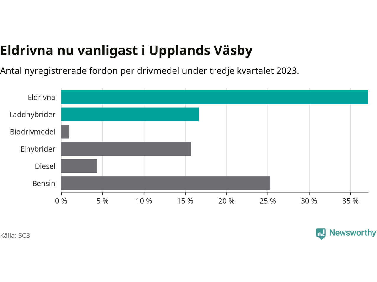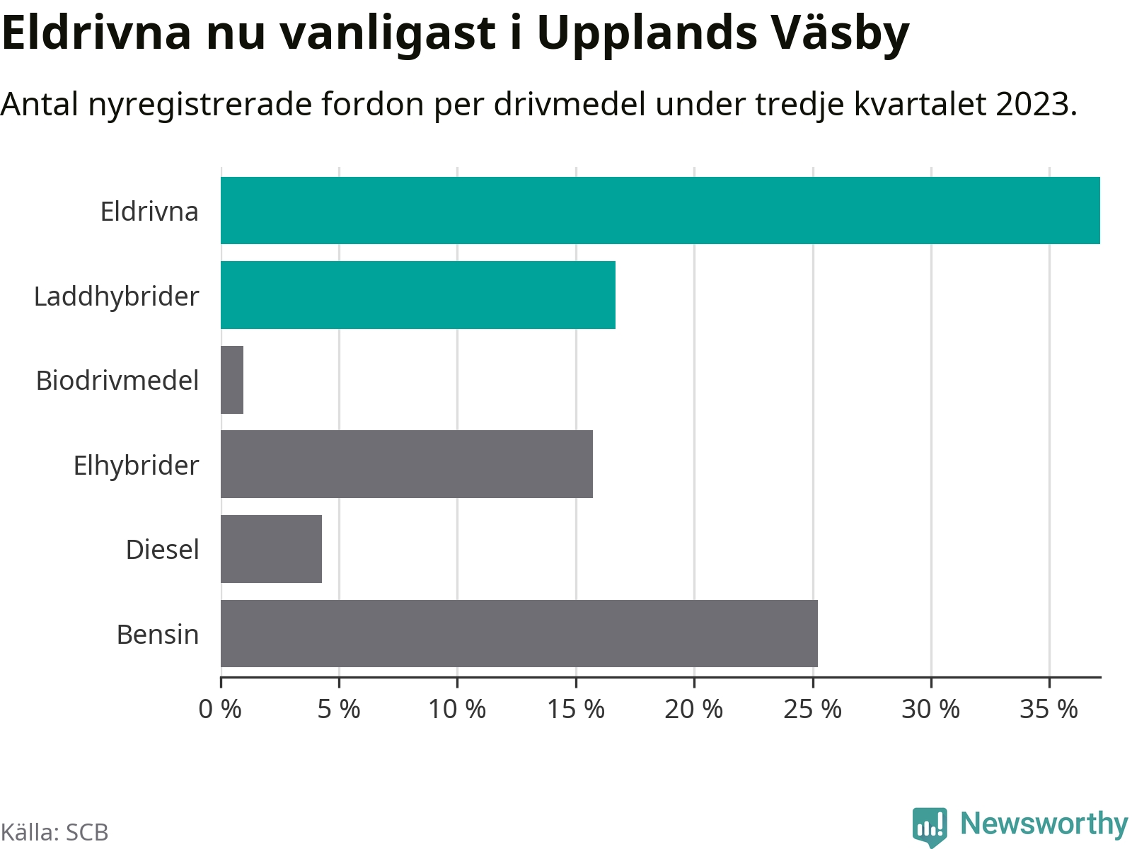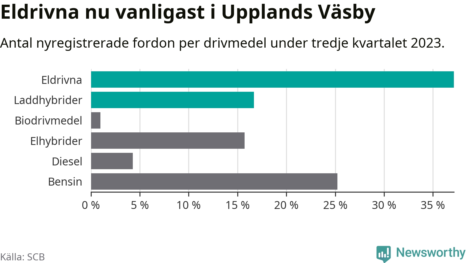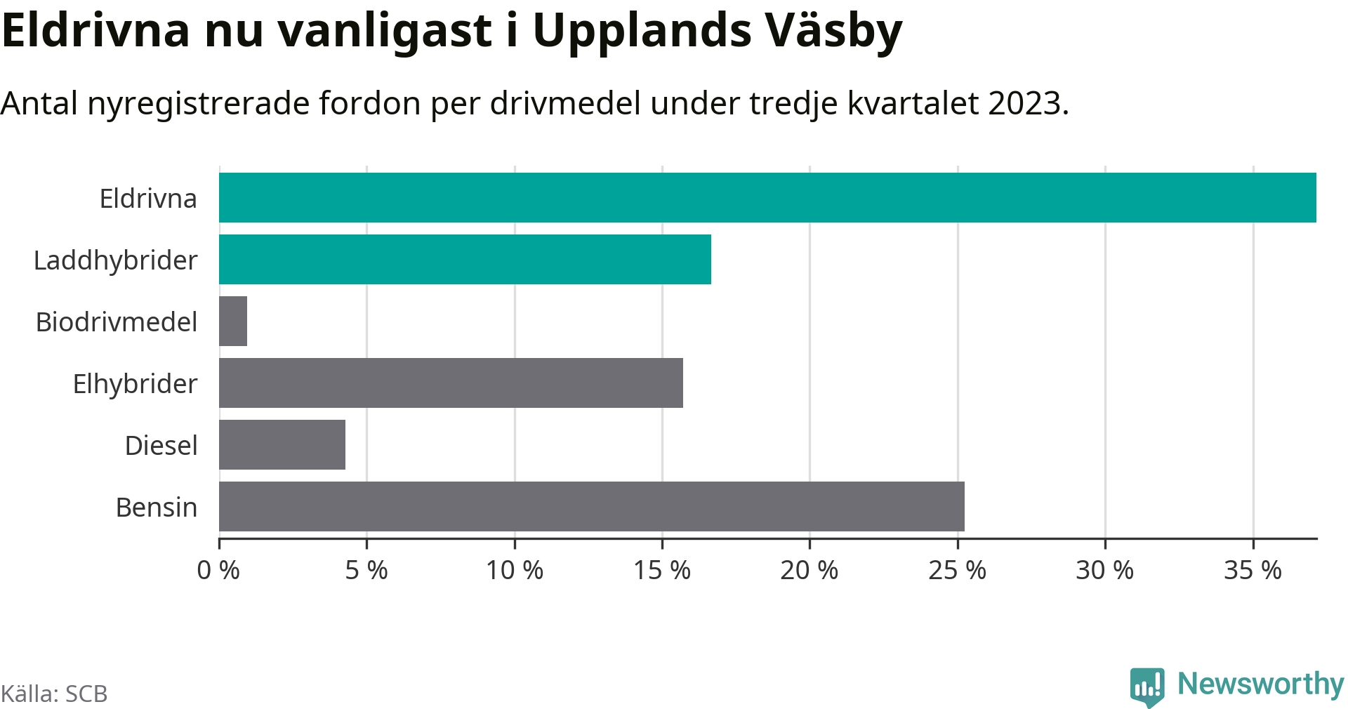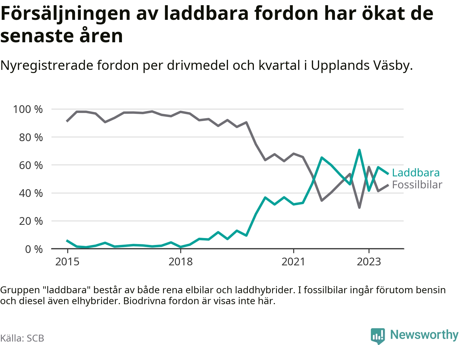 Under tredje kvartalet 2023 var 54 procent av alla nyregistrerade personbilar i Upplands Väsby laddbara (sammanlagt registrerades 210 nya bilar). Merparten av de laddbara bilarna var rena elbilar (37 procent av alla).