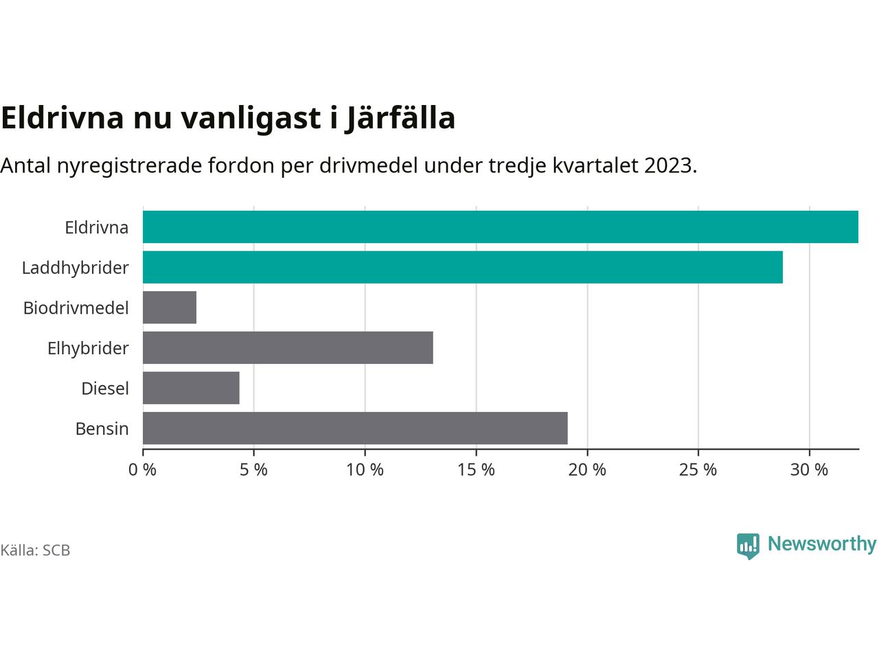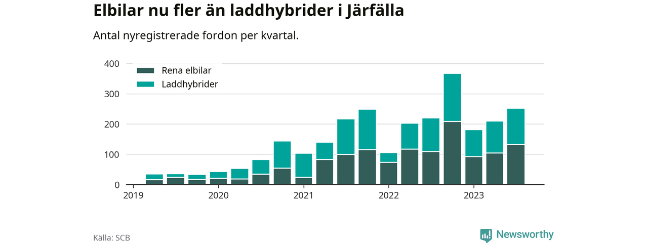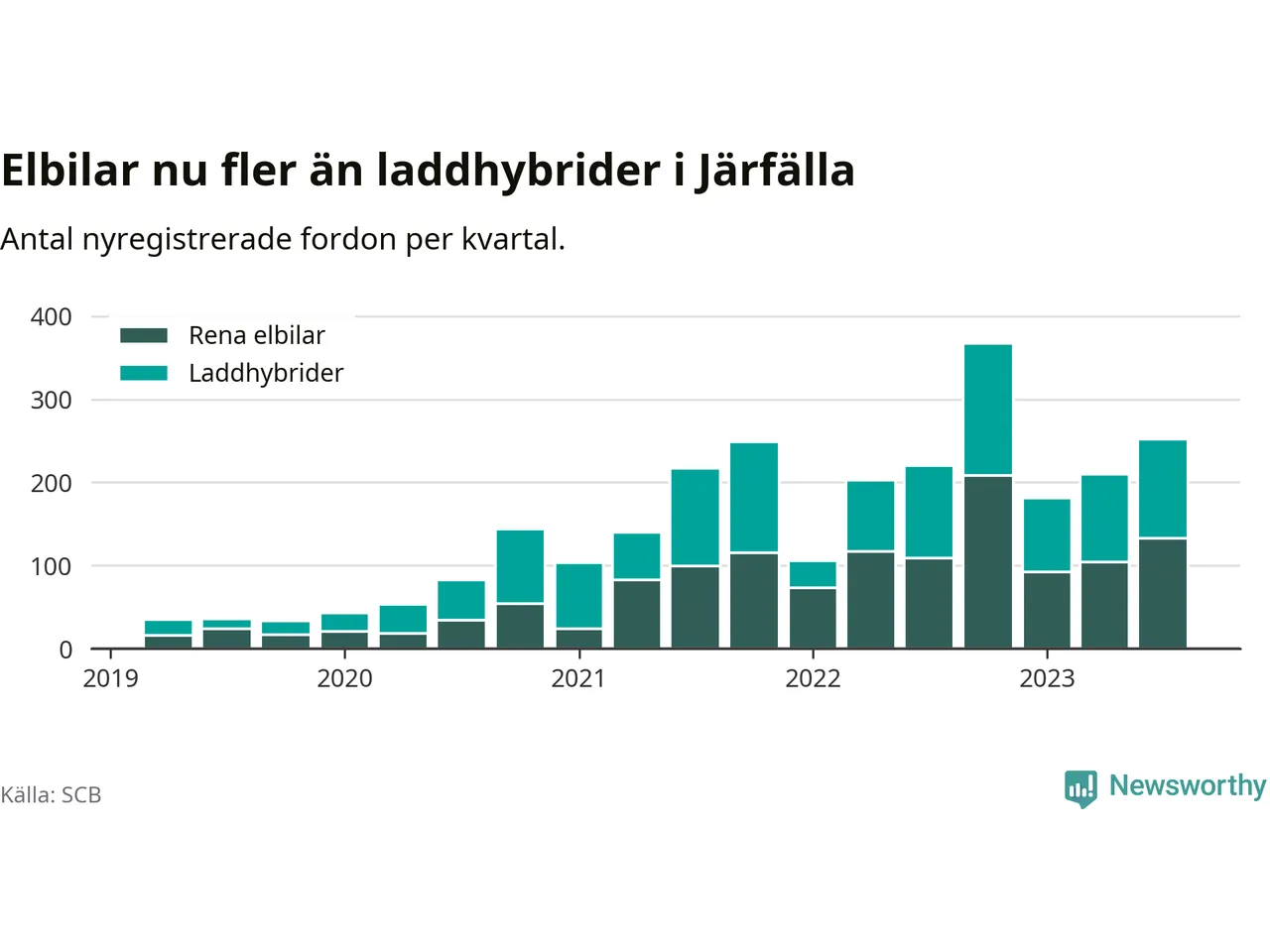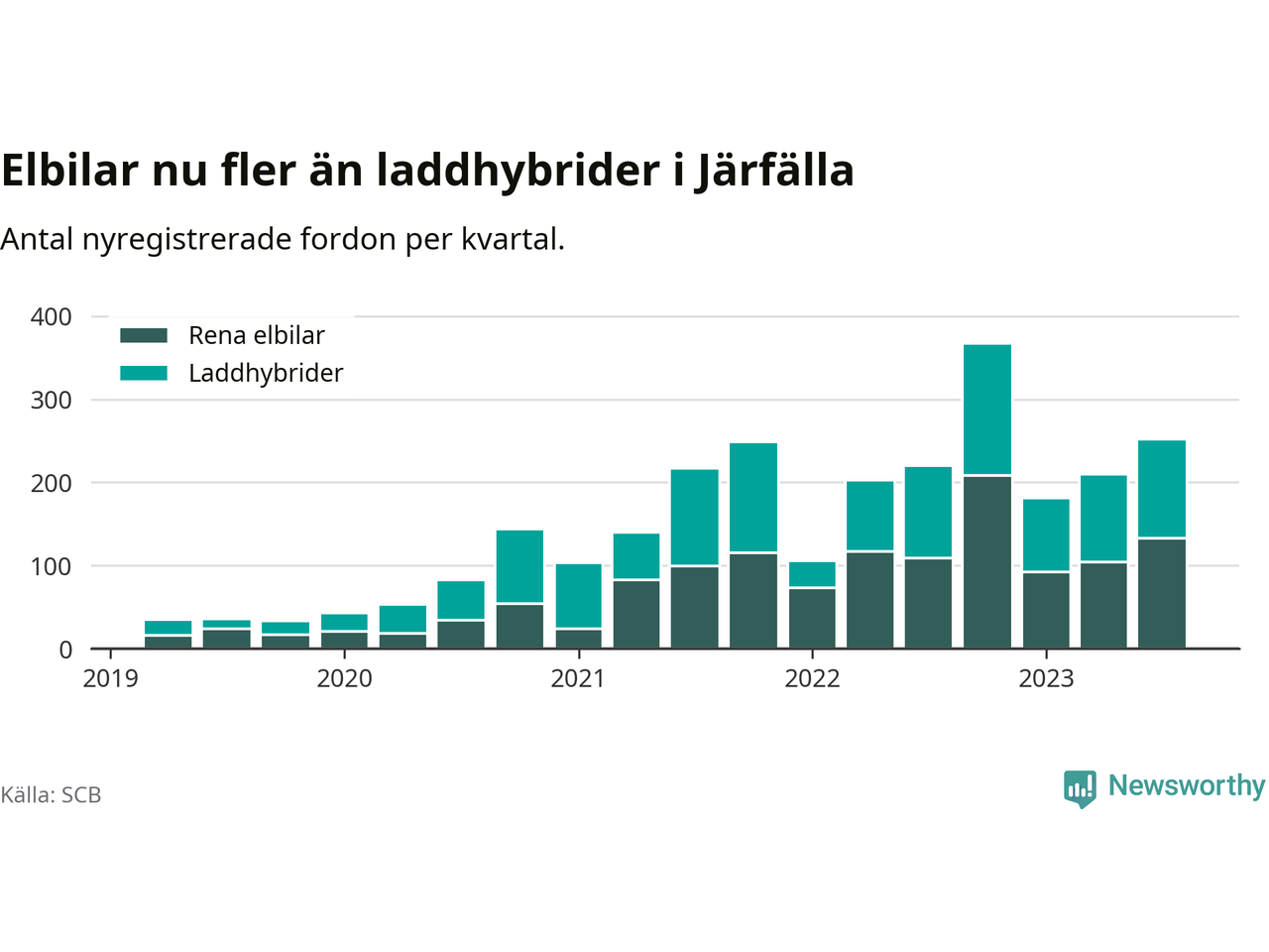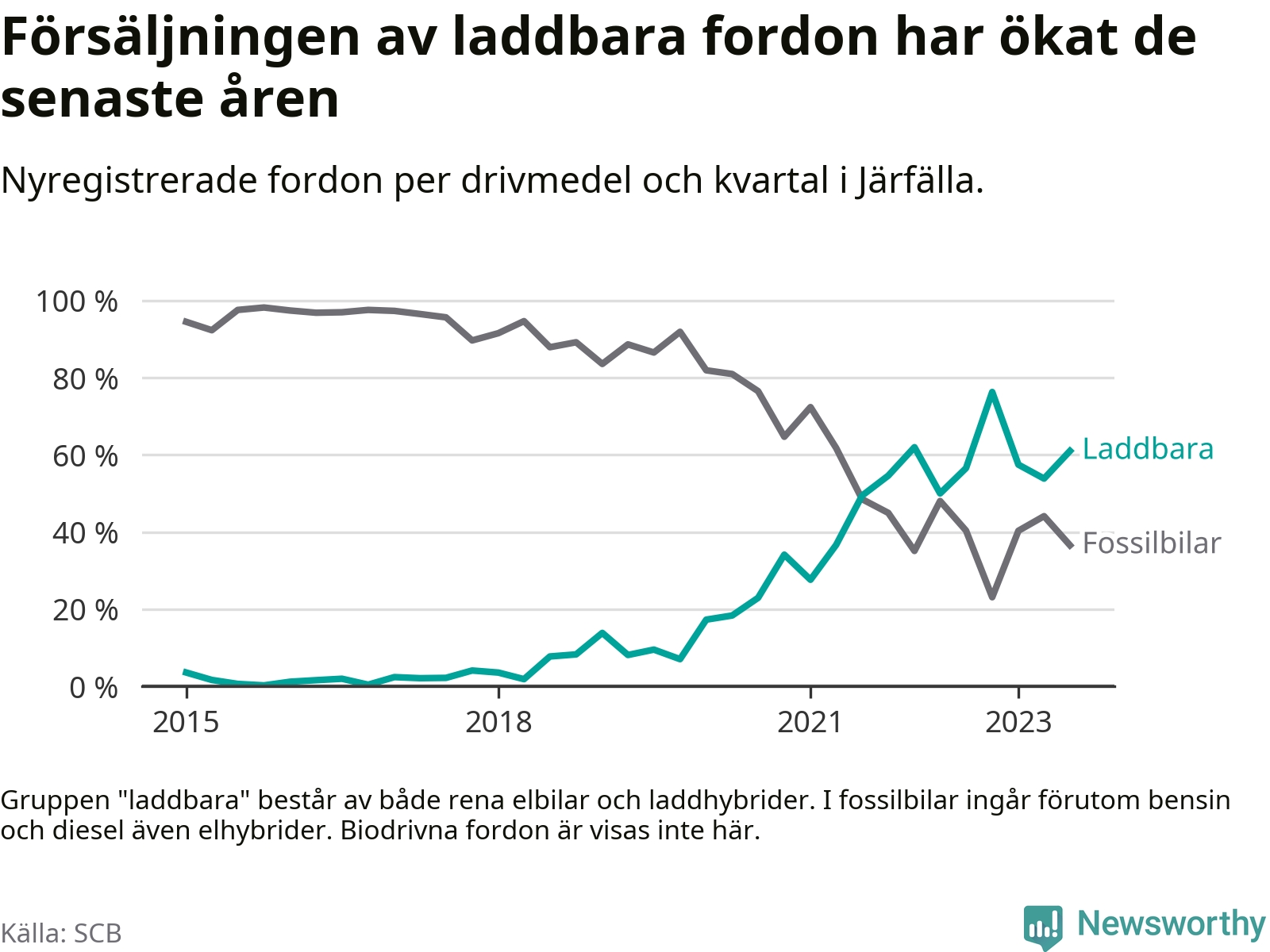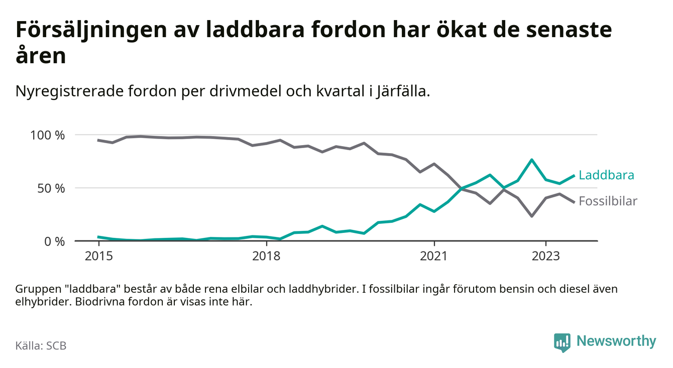 Under tredje kvartalet 2023 var 61 procent av alla nyregistrerade personbilar i Järfälla laddbara (sammanlagt registrerades 413 nya bilar). Merparten av de laddbara bilarna var rena elbilar (32 procent av alla).