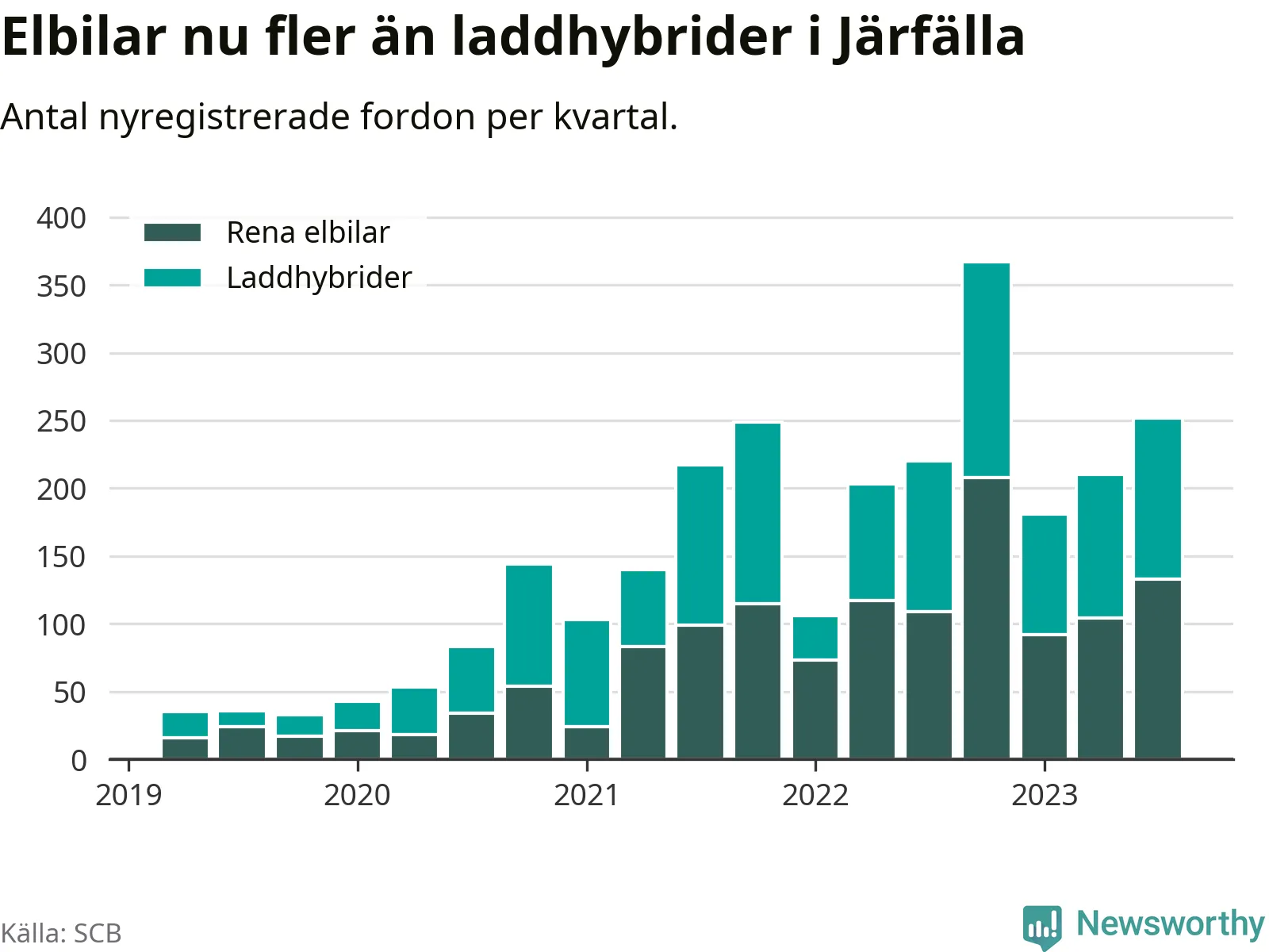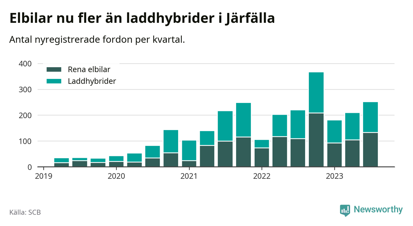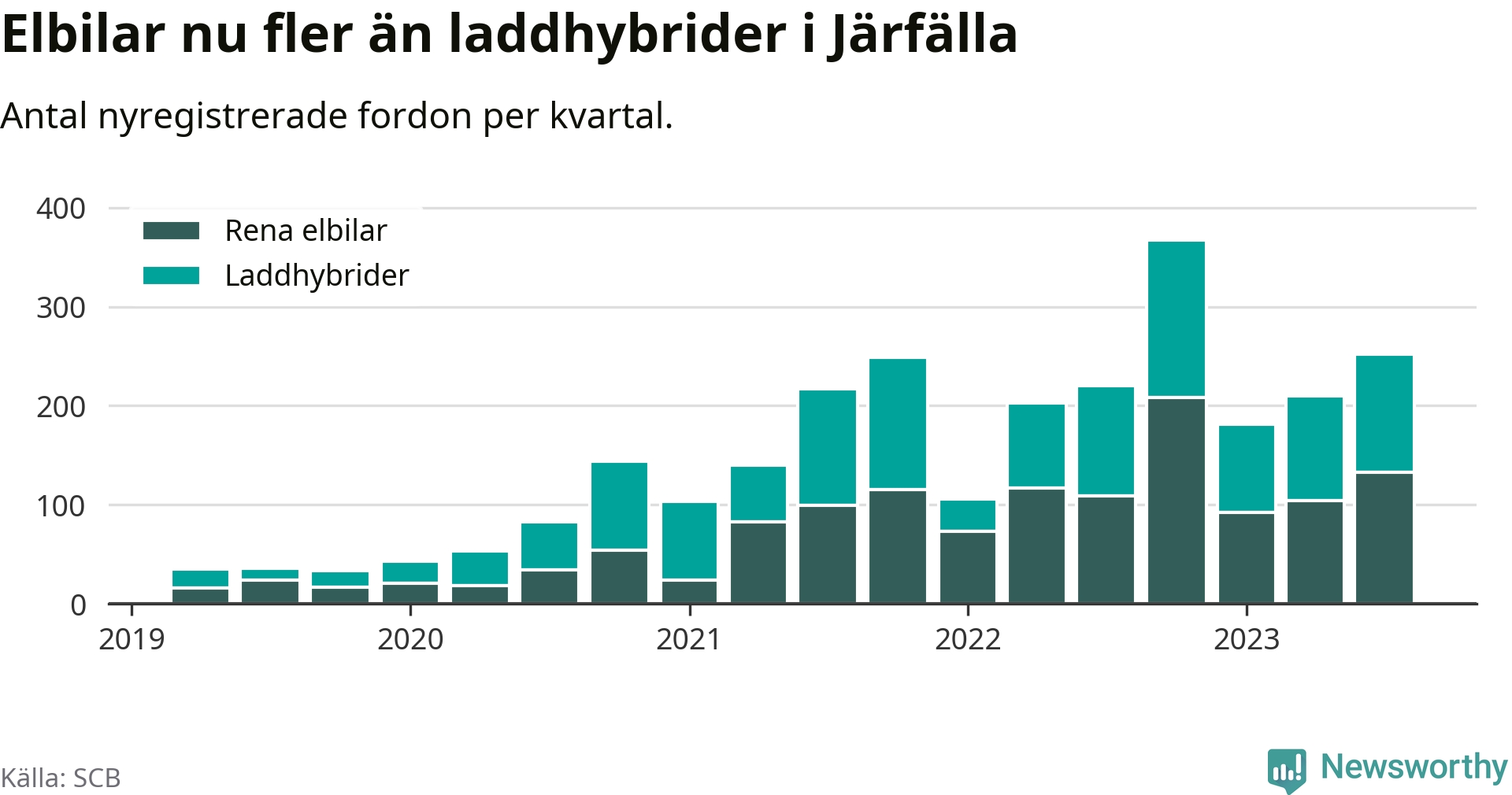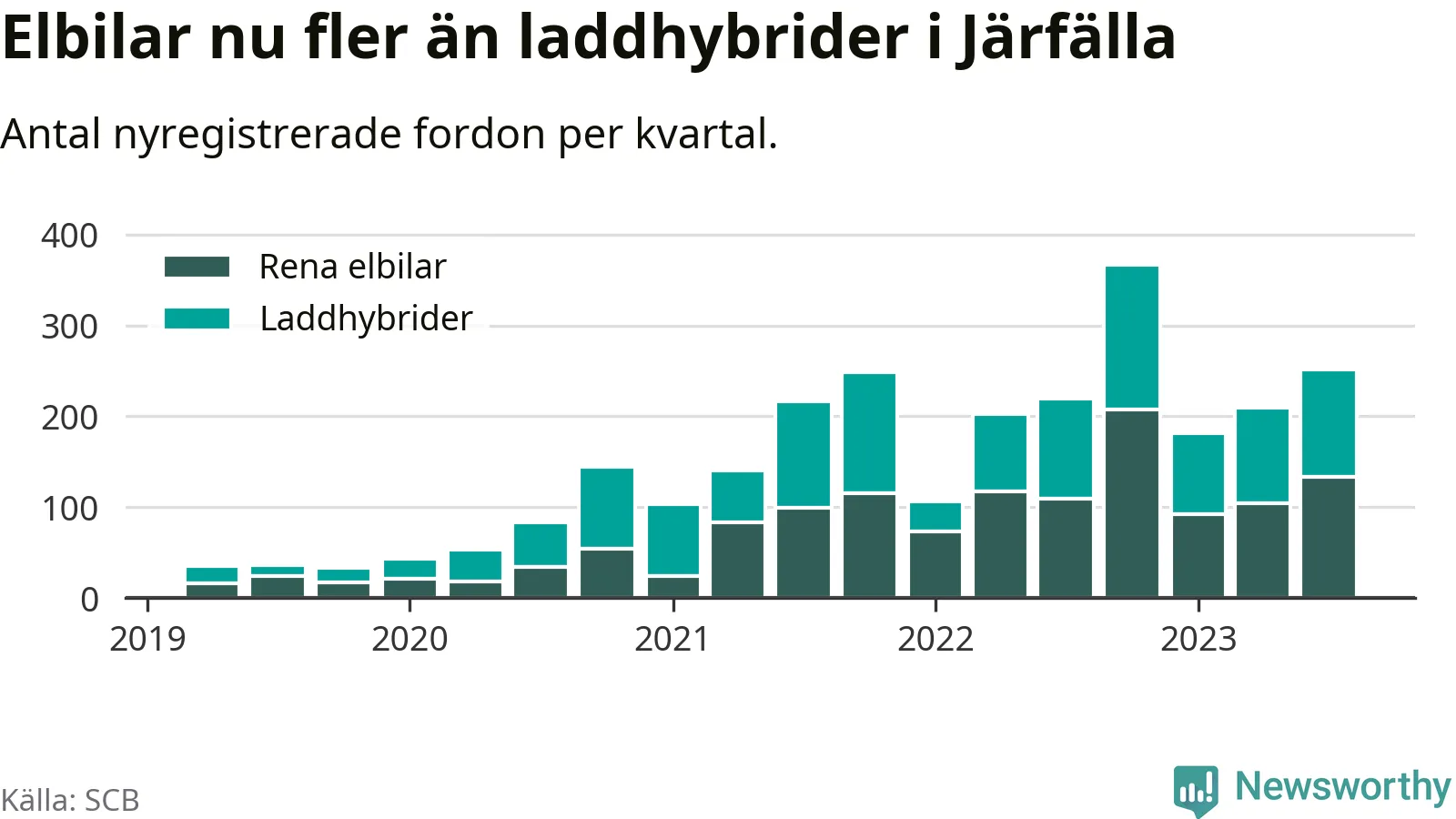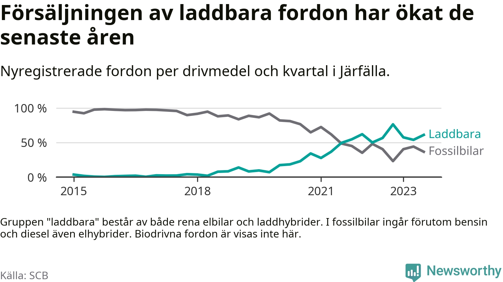 Under tredje kvartalet 2023 var 61 procent av alla nyregistrerade personbilar i Järfälla laddbara (sammanlagt registrerades 413 nya bilar). Merparten av de laddbara bilarna var rena elbilar (32 procent av alla).