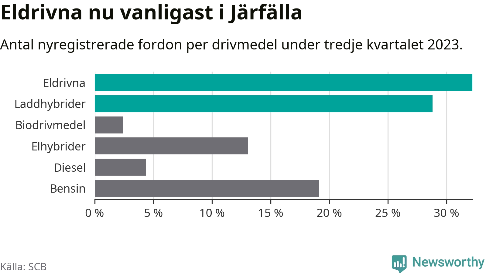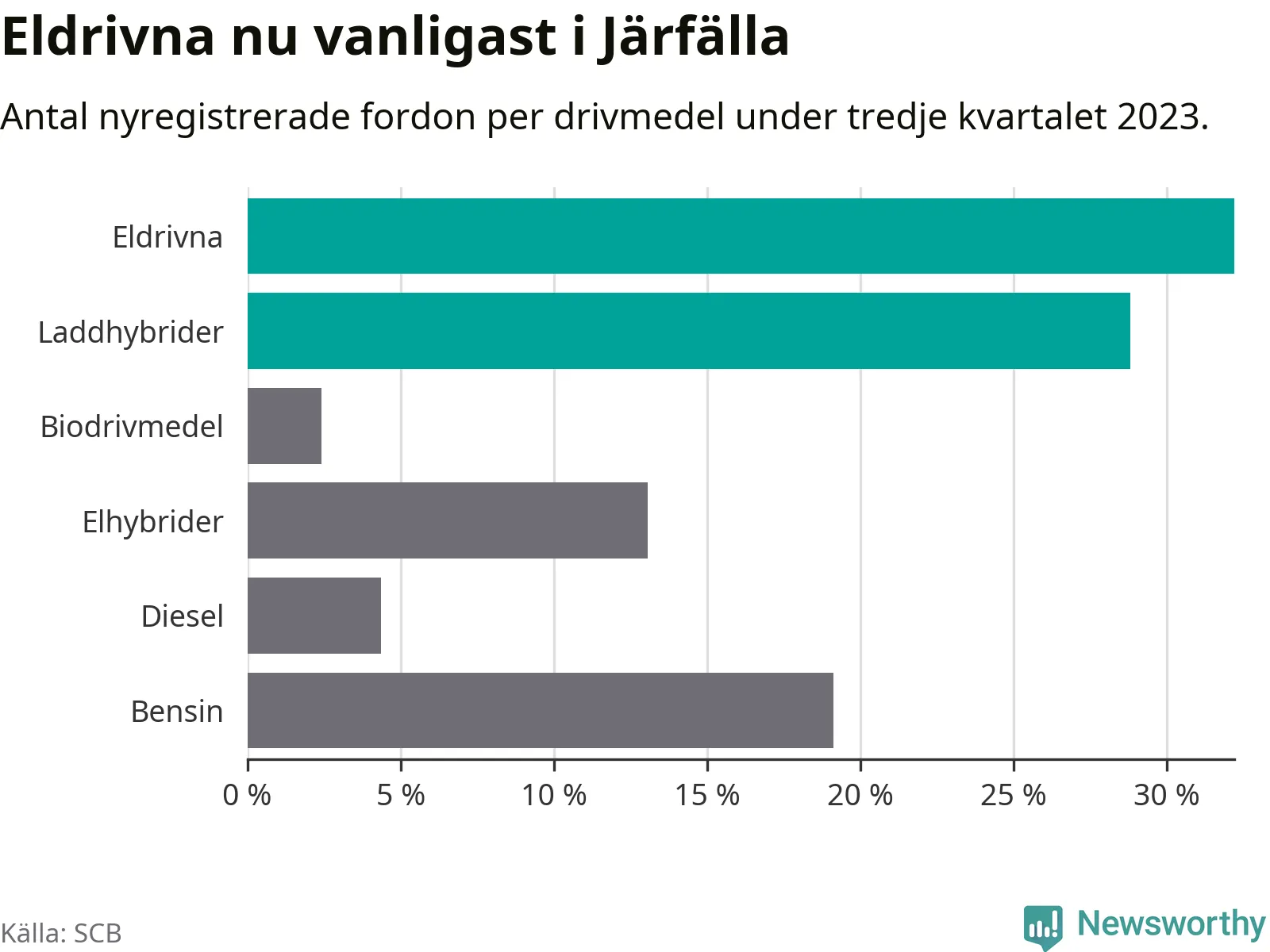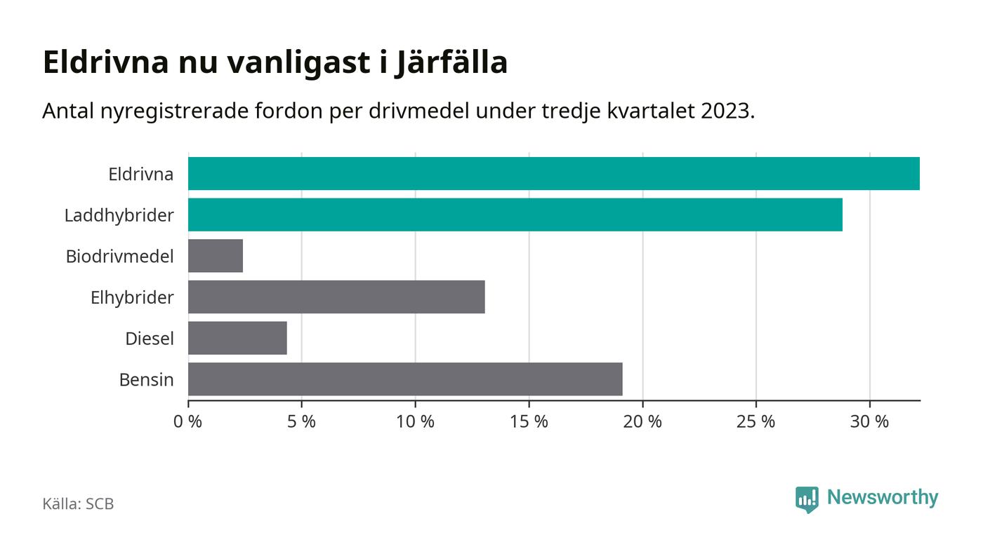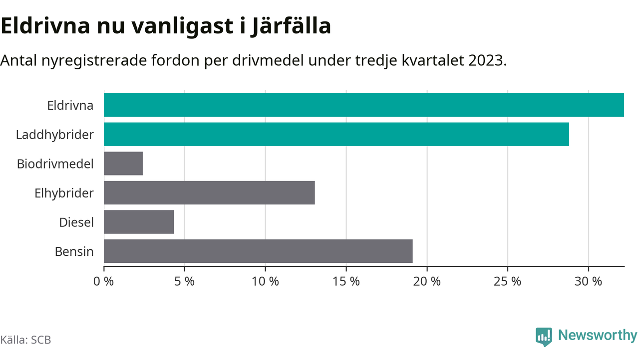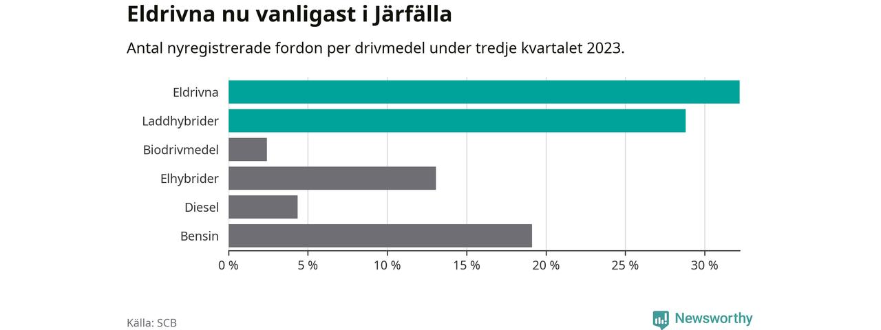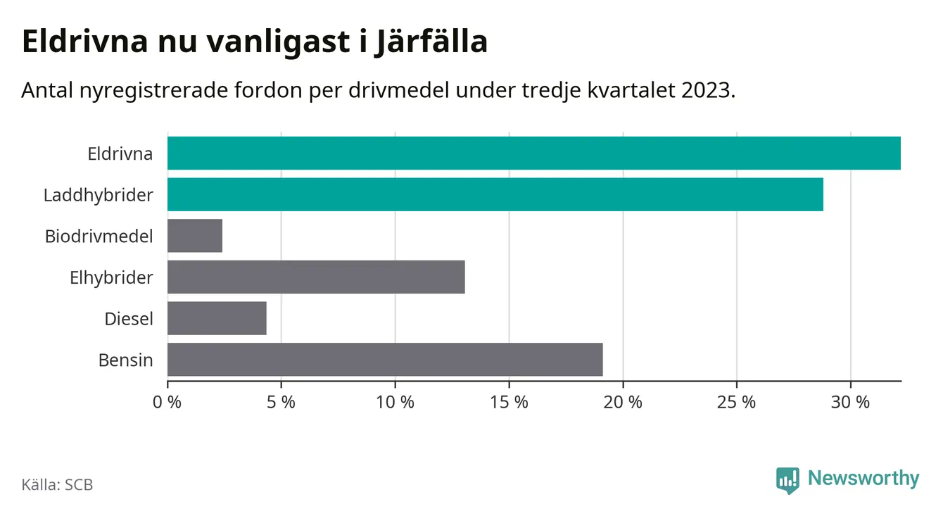 Under tredje kvartalet 2023 var 61 procent av alla nyregistrerade personbilar i Järfälla laddbara (sammanlagt registrerades 413 nya bilar). Merparten av de laddbara bilarna var rena elbilar (32 procent av alla).