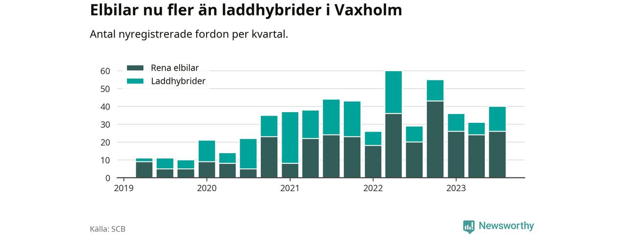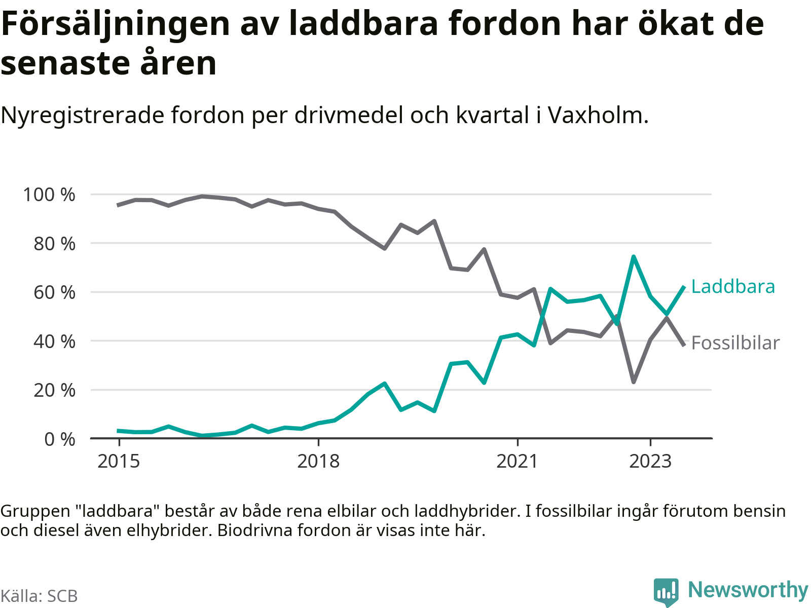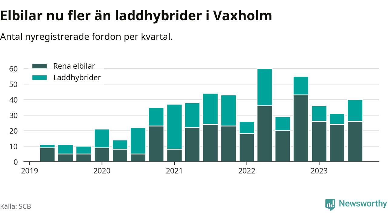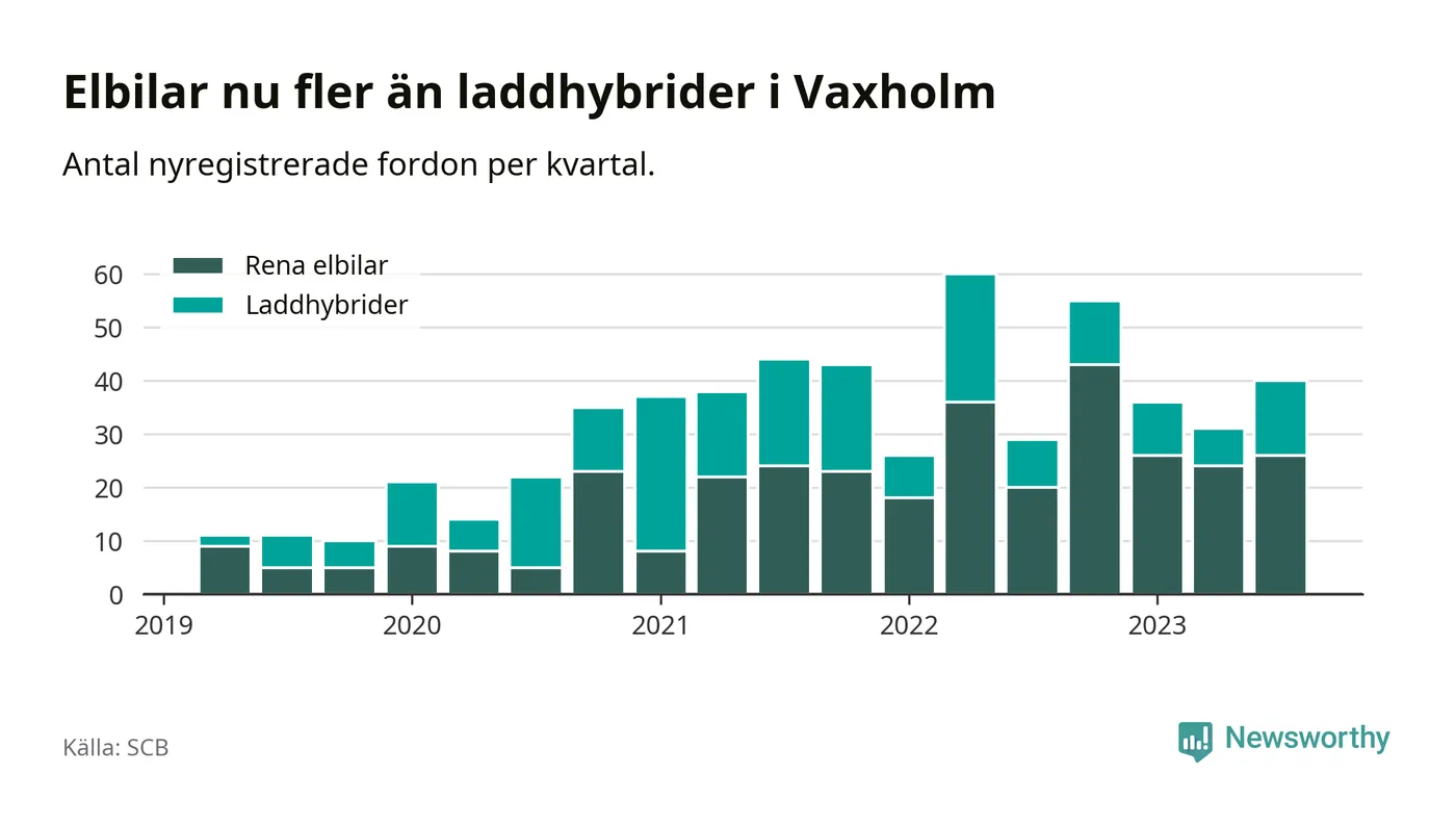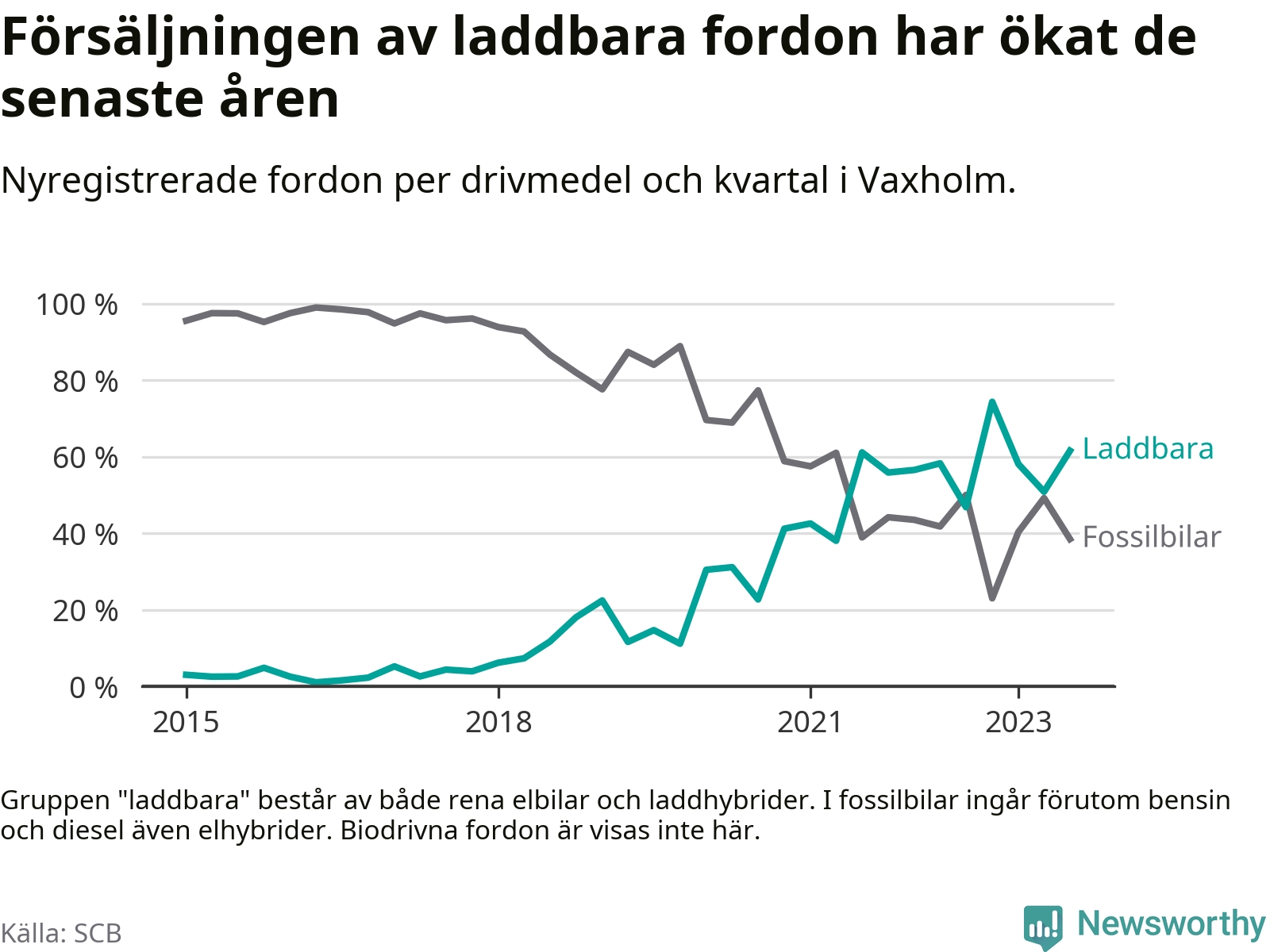 Under tredje kvartalet 2023 var 62 procent av alla nyregistrerade personbilar i Vaxholm laddbara (sammanlagt registrerades 65 nya bilar). Merparten av de laddbara bilarna var rena elbilar (40 procent av alla).