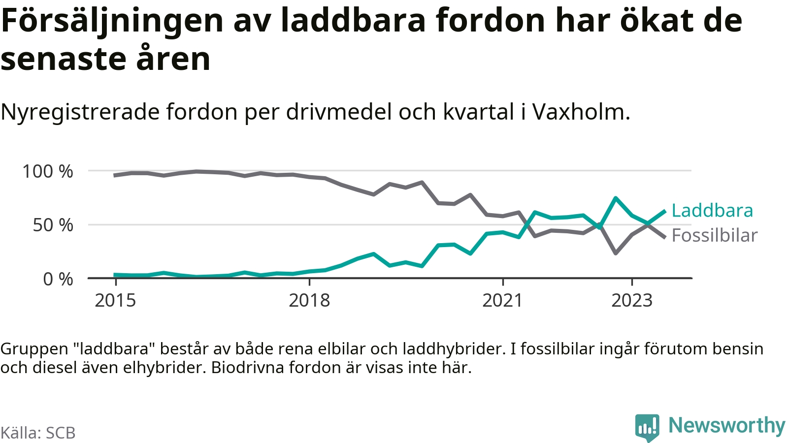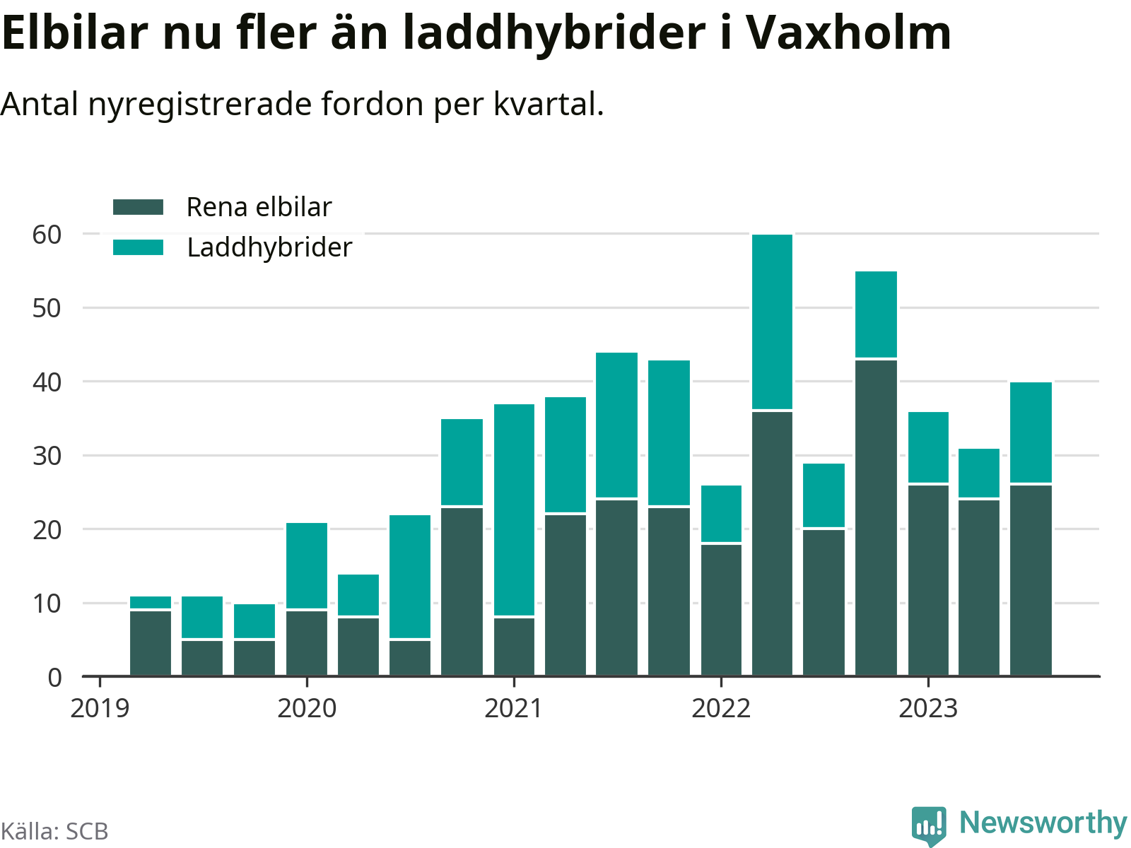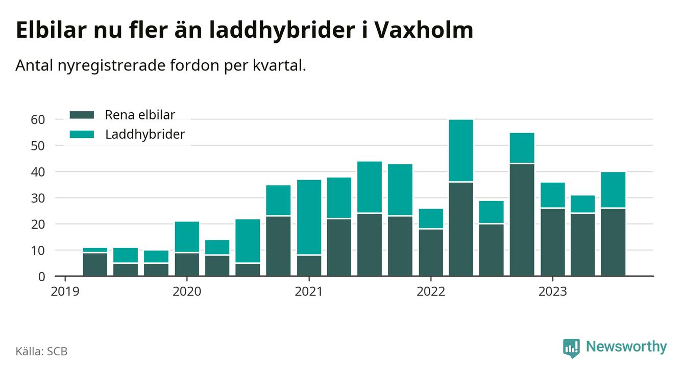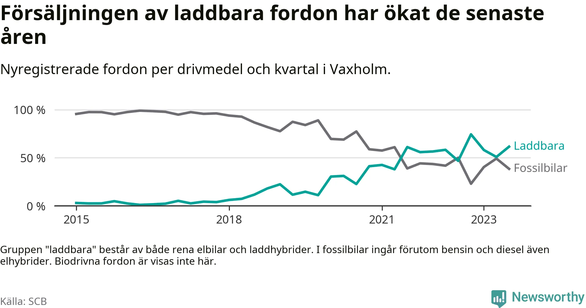 Under tredje kvartalet 2023 var 62 procent av alla nyregistrerade personbilar i Vaxholm laddbara (sammanlagt registrerades 65 nya bilar). Merparten av de laddbara bilarna var rena elbilar (40 procent av alla).
