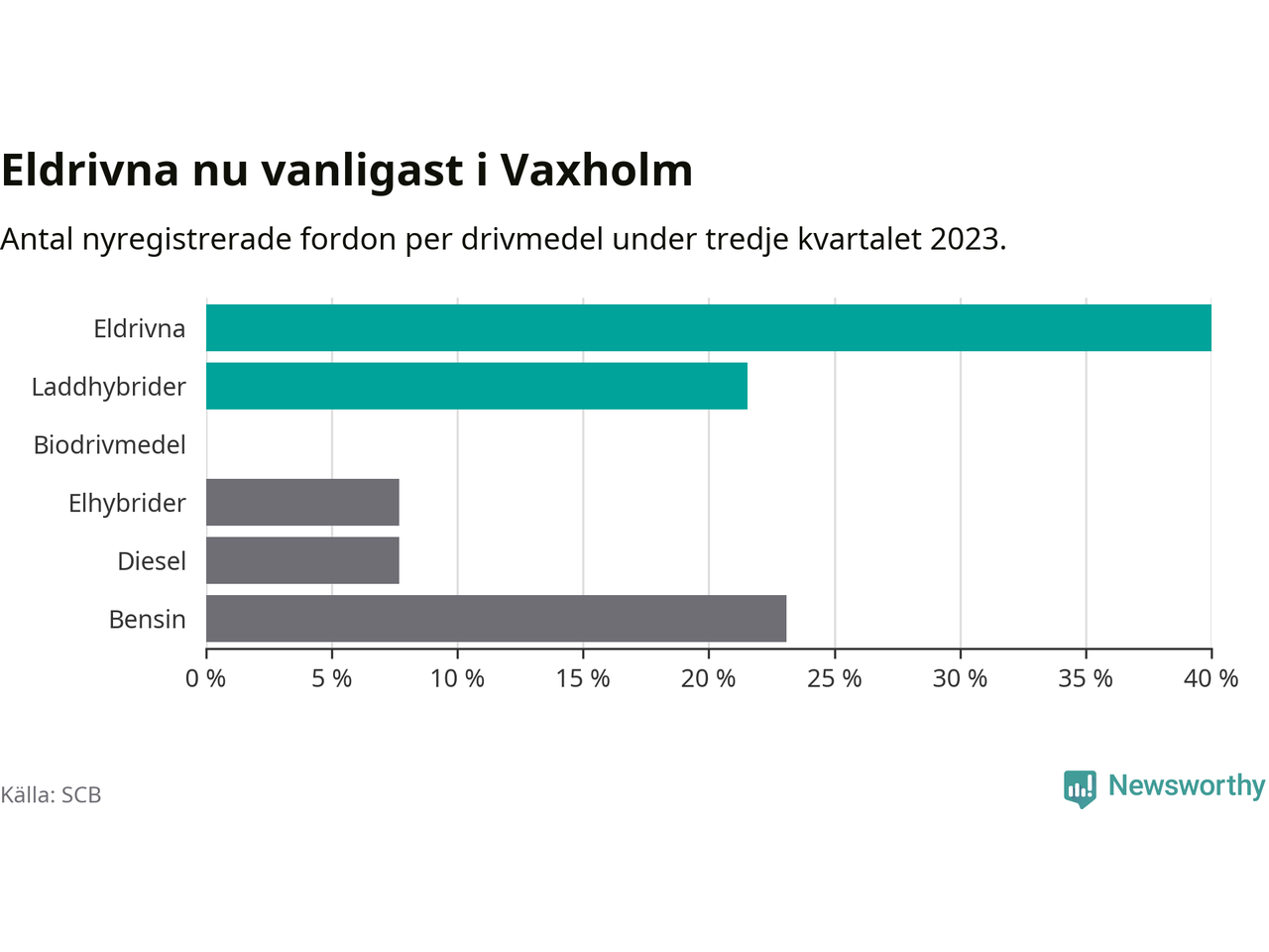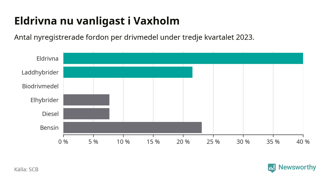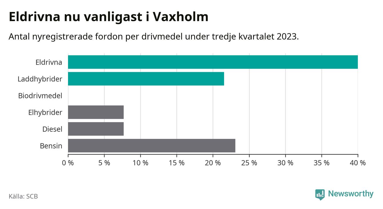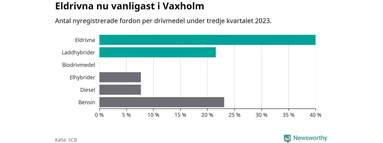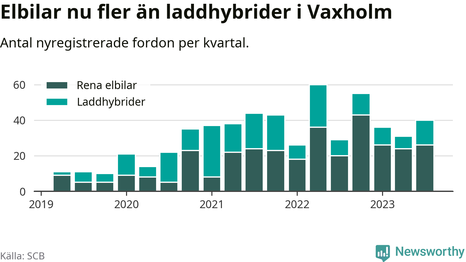 Under tredje kvartalet 2023 var 62 procent av alla nyregistrerade personbilar i Vaxholm laddbara (sammanlagt registrerades 65 nya bilar). Merparten av de laddbara bilarna var rena elbilar (40 procent av alla).