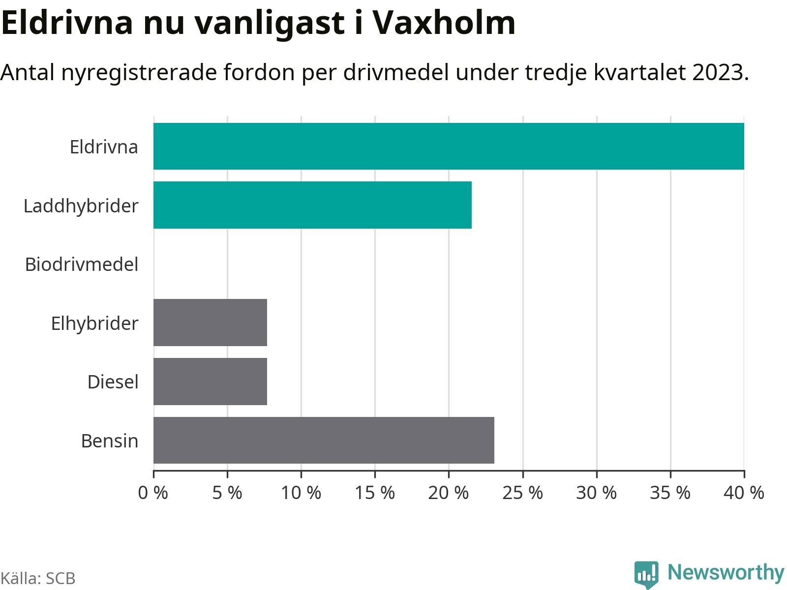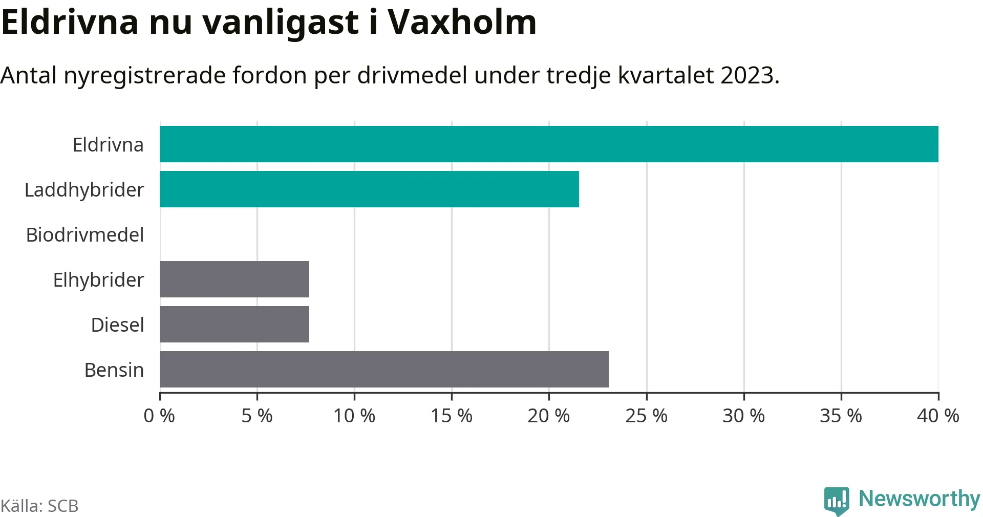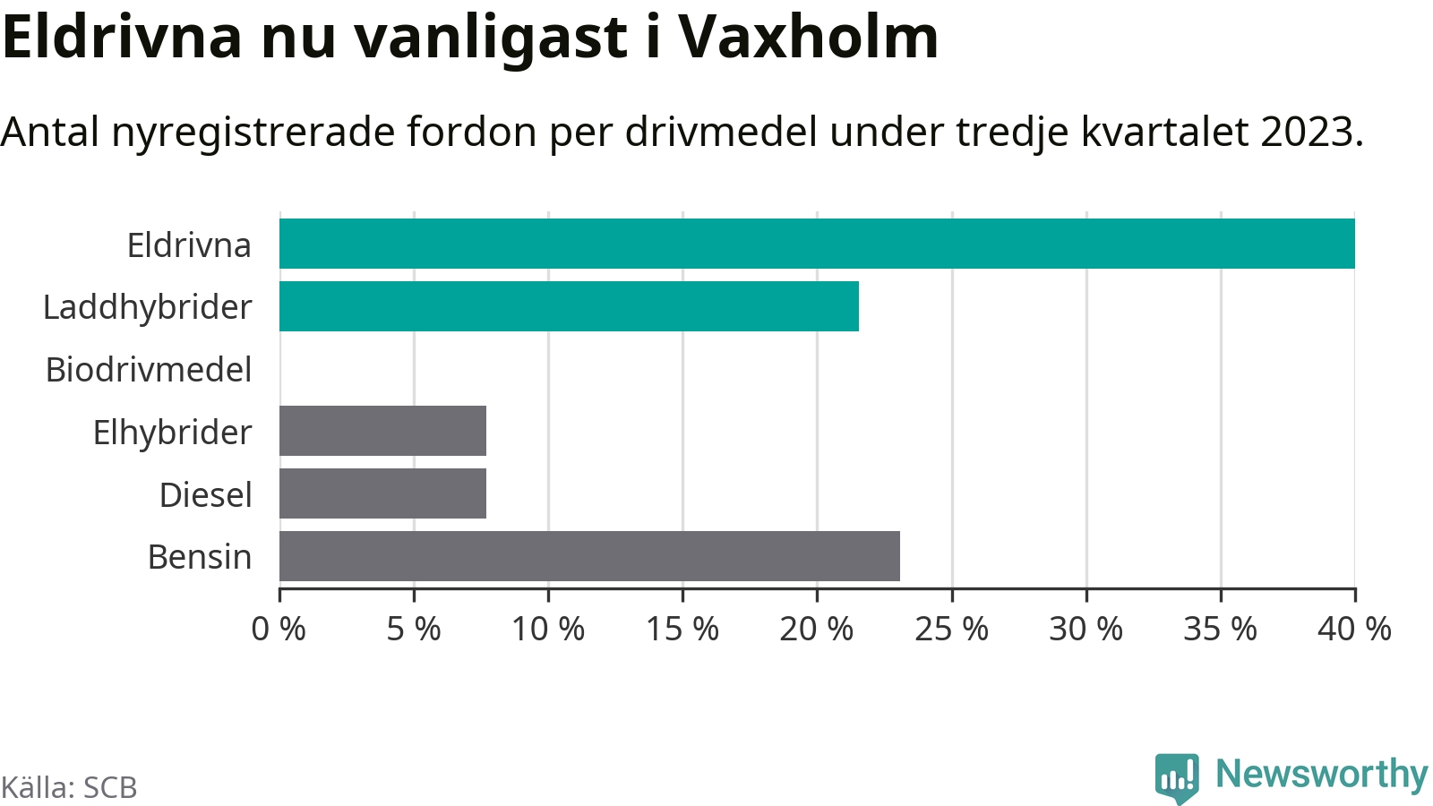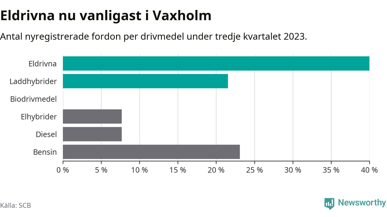 Under tredje kvartalet 2023 var 62 procent av alla nyregistrerade personbilar i Vaxholm laddbara (sammanlagt registrerades 65 nya bilar). Merparten av de laddbara bilarna var rena elbilar (40 procent av alla).