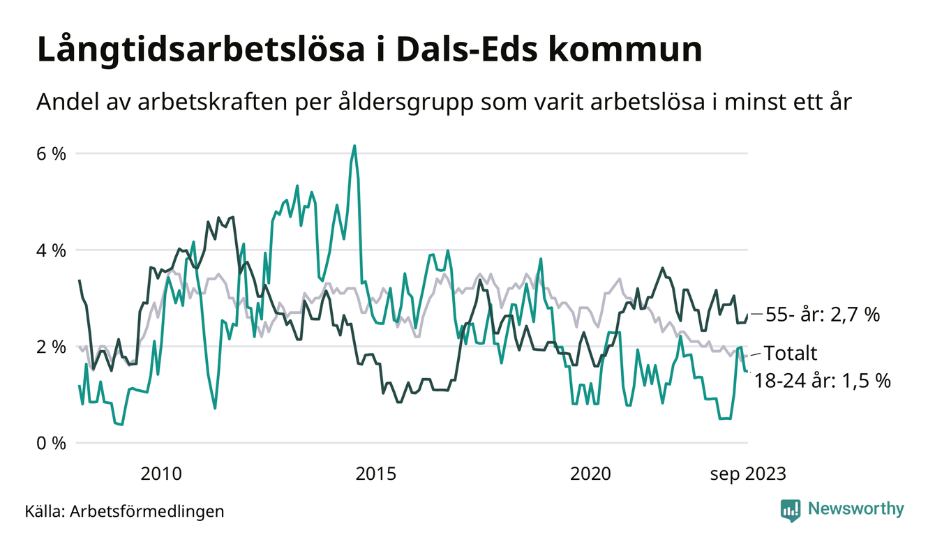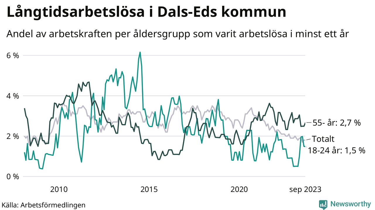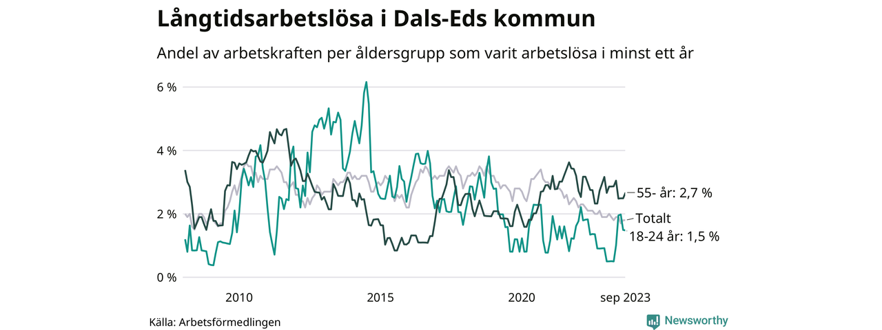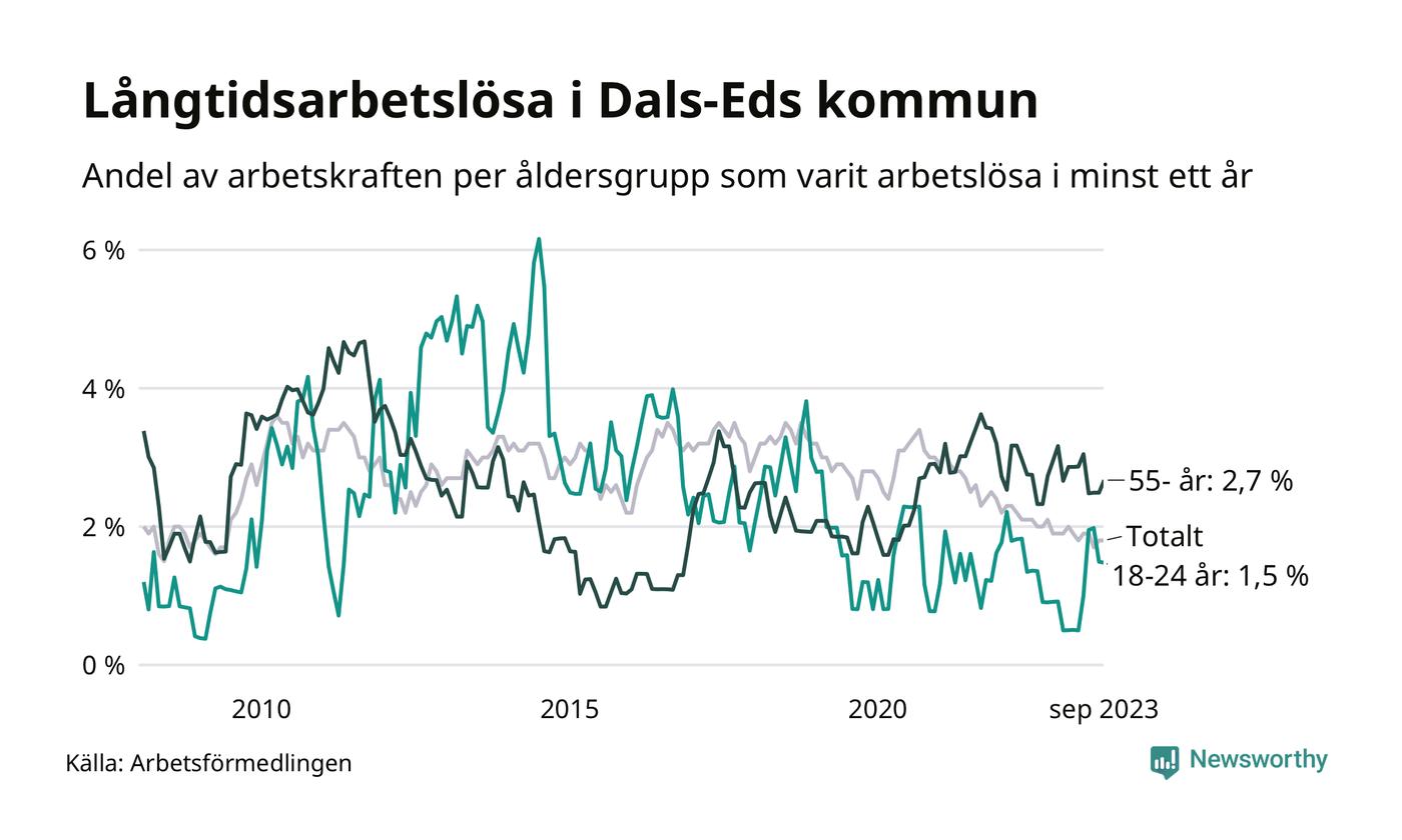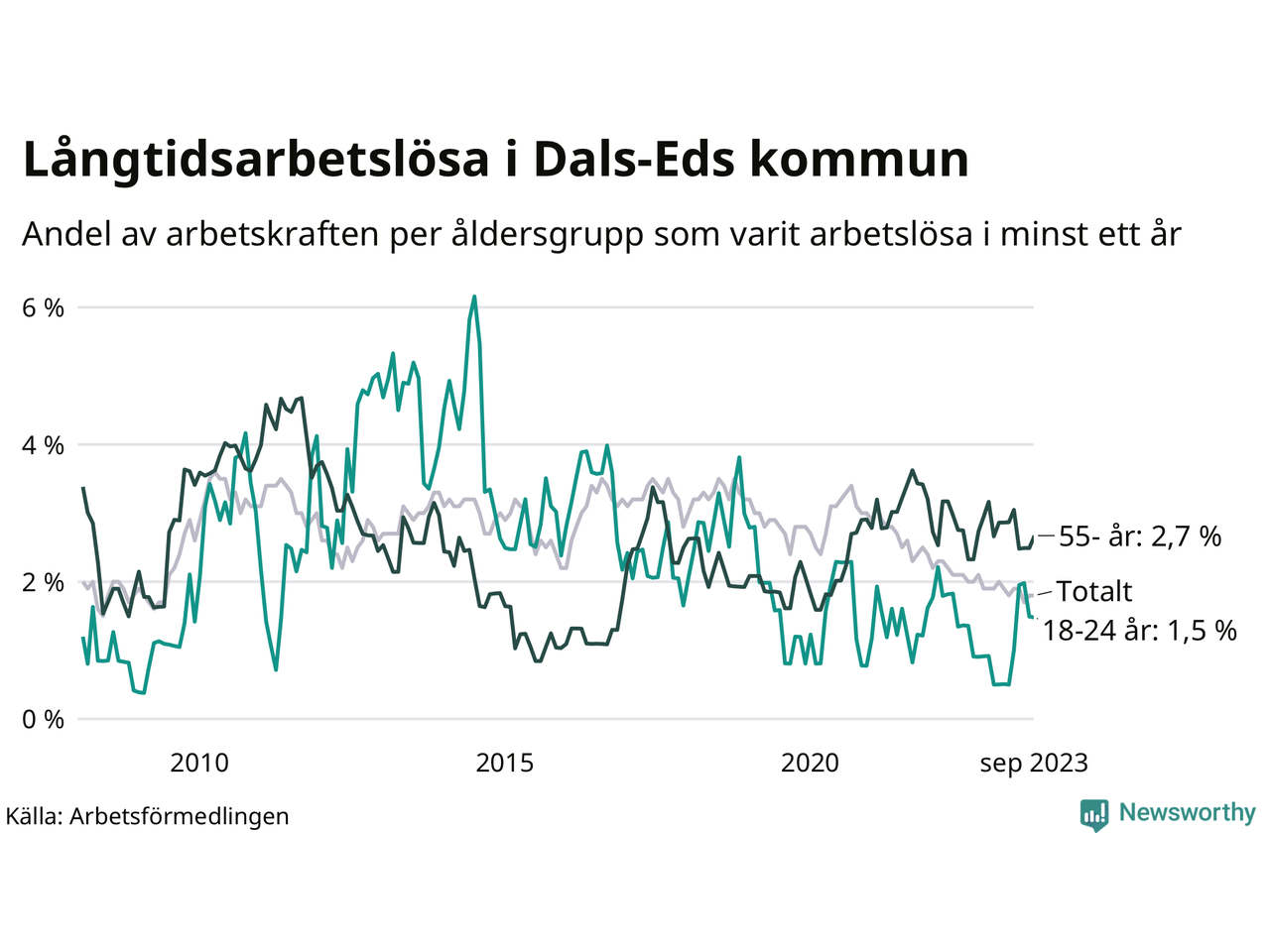 Av de 37 personerna som varit arbetslösa i mer än ett år i Dals-Eds kommun är 14 personer mellan 55 och 651 år och tre är mellan 18 och 24 år. För den äldre gruppen är andelen arbetslösa 2,7 procent medan den i den yngre gruppen är 1,5 procent. Även i riket som helhet är långtidsarbetslösheten högre i gruppen äldre.