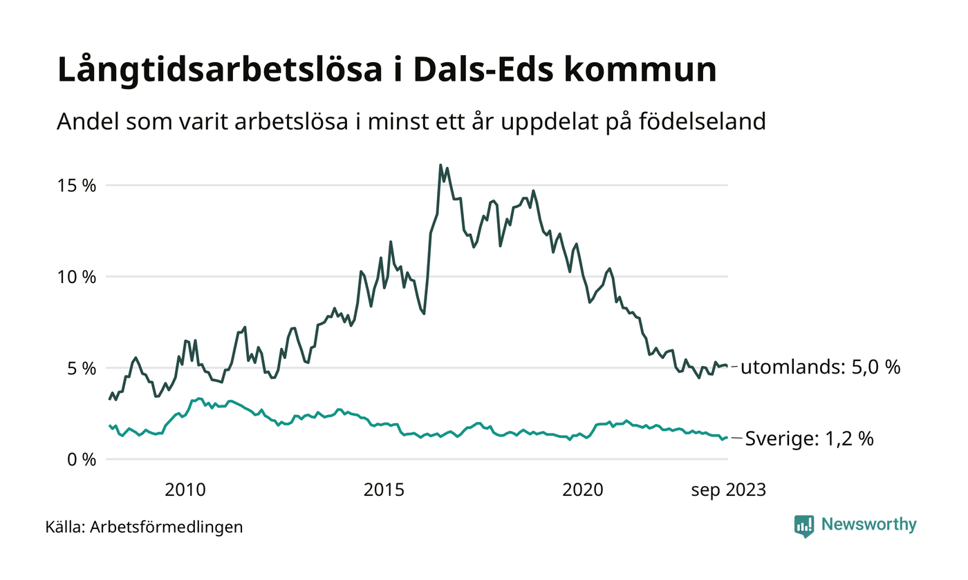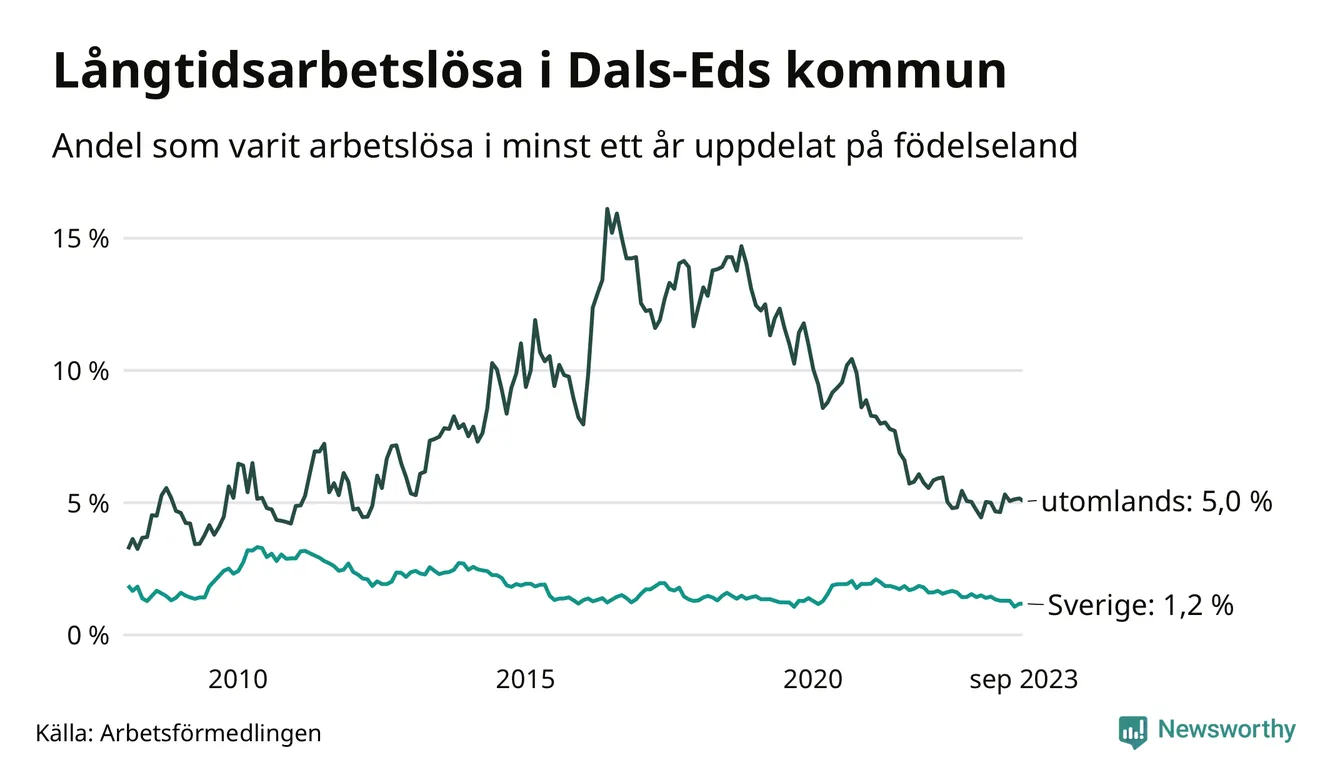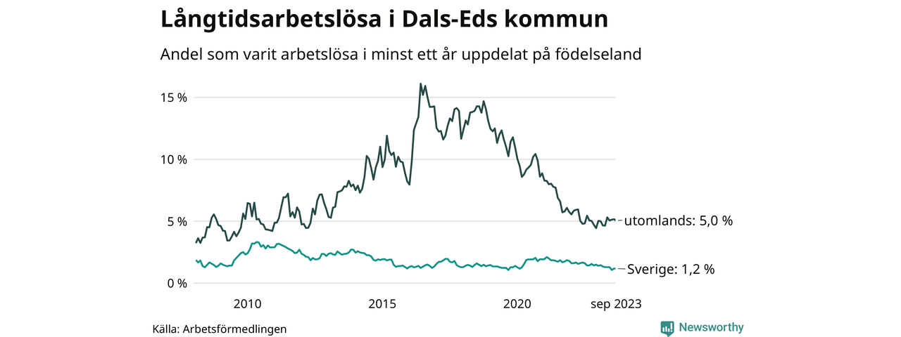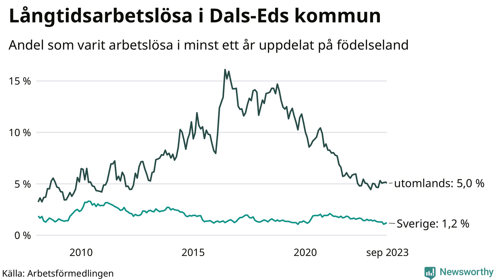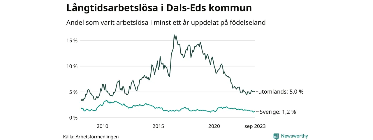 21 av de långtidsarbetslösa i Dals-Ed är födda i Sverige, medan 16 är födda utomlands. Det innebär att långtidsarbetslösheten bland Sverigefödda är 1,2 procent, medan den är fyra gånger så hög – 5,0 procent – bland födda utomlands. Även i riket som helhet är arbetslösheten högre bland utrikesfödda.