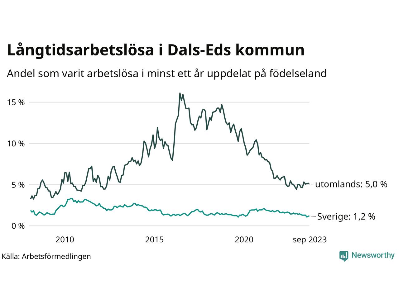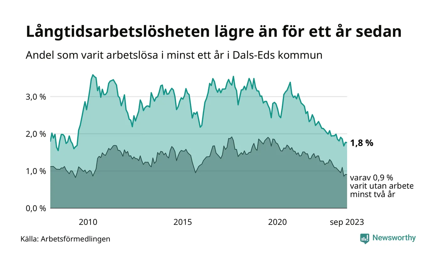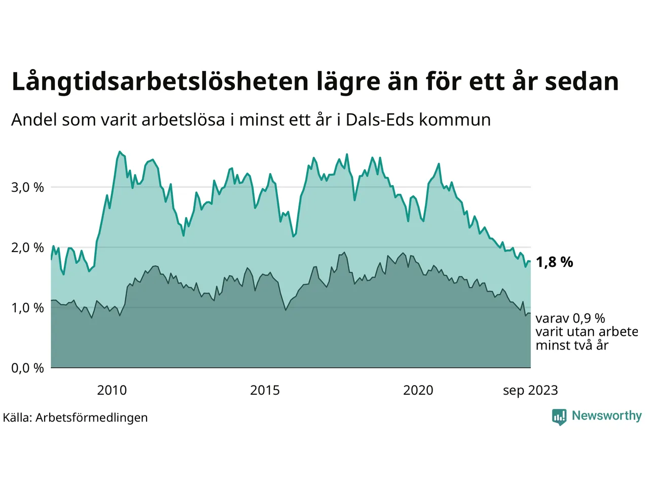 I september hade 37 Dals-Edsbor varit arbetslösa i minst ett år, vilket är lika många som månaden innan. 37 personer motsvarar 1,8 procent av arbetskraften i kommunen – andelen långtidsarbetslösa är 0,2 procentenheter lägre än samma månad för ett år sedan.
