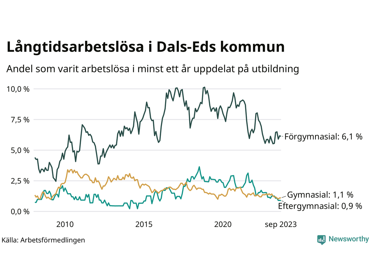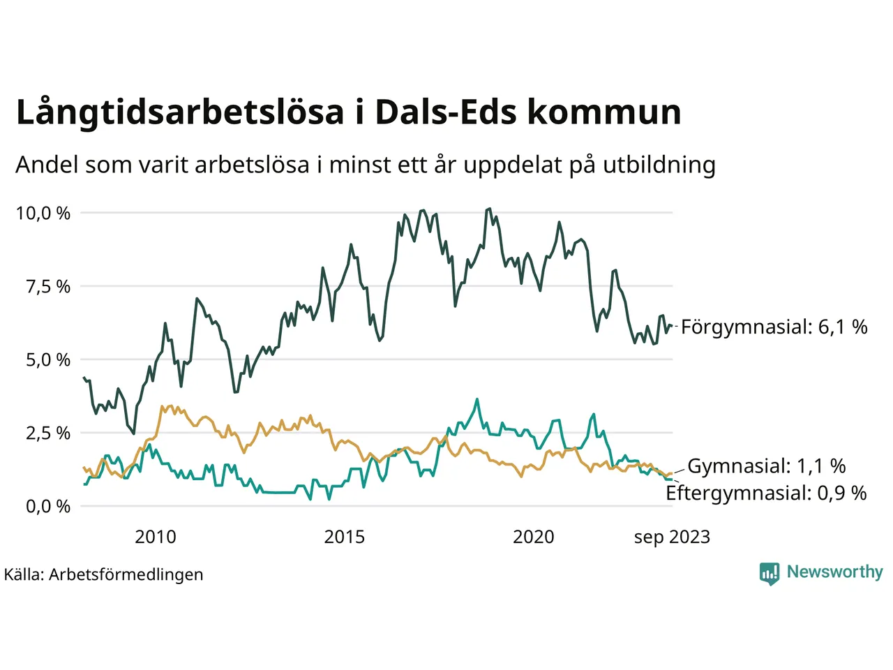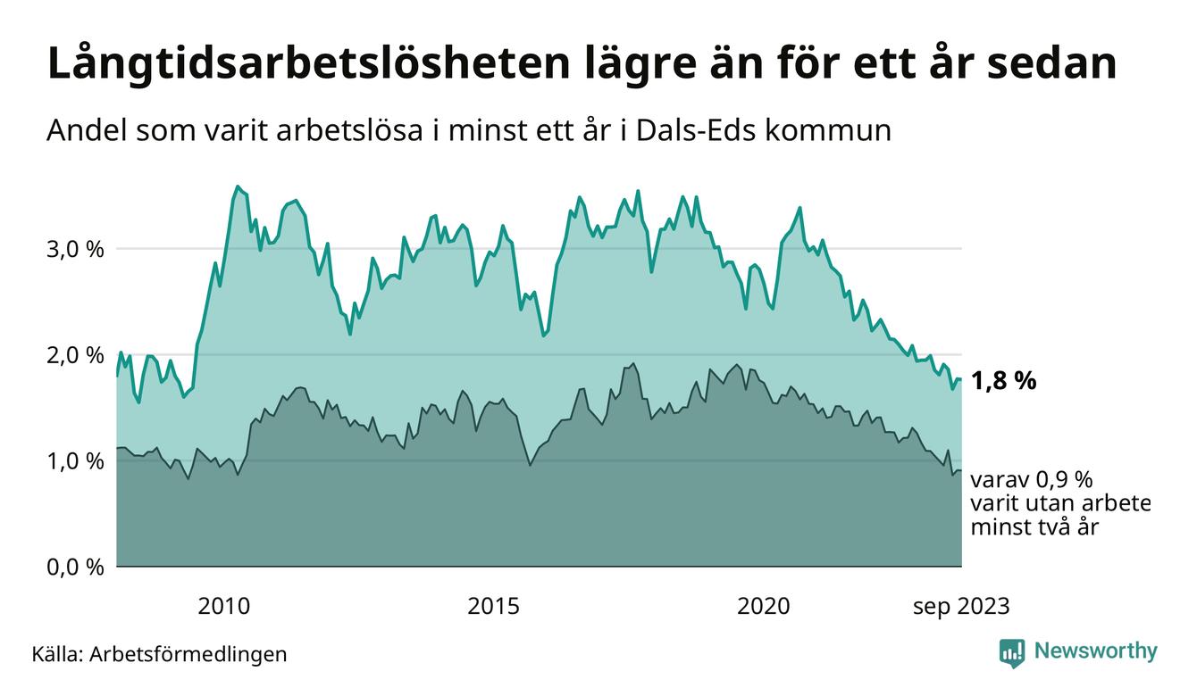 I september hade 37 Dals-Edsbor varit arbetslösa i minst ett år, vilket är lika många som månaden innan. 37 personer motsvarar 1,8 procent av arbetskraften i kommunen – andelen långtidsarbetslösa är 0,2 procentenheter lägre än samma månad för ett år sedan.