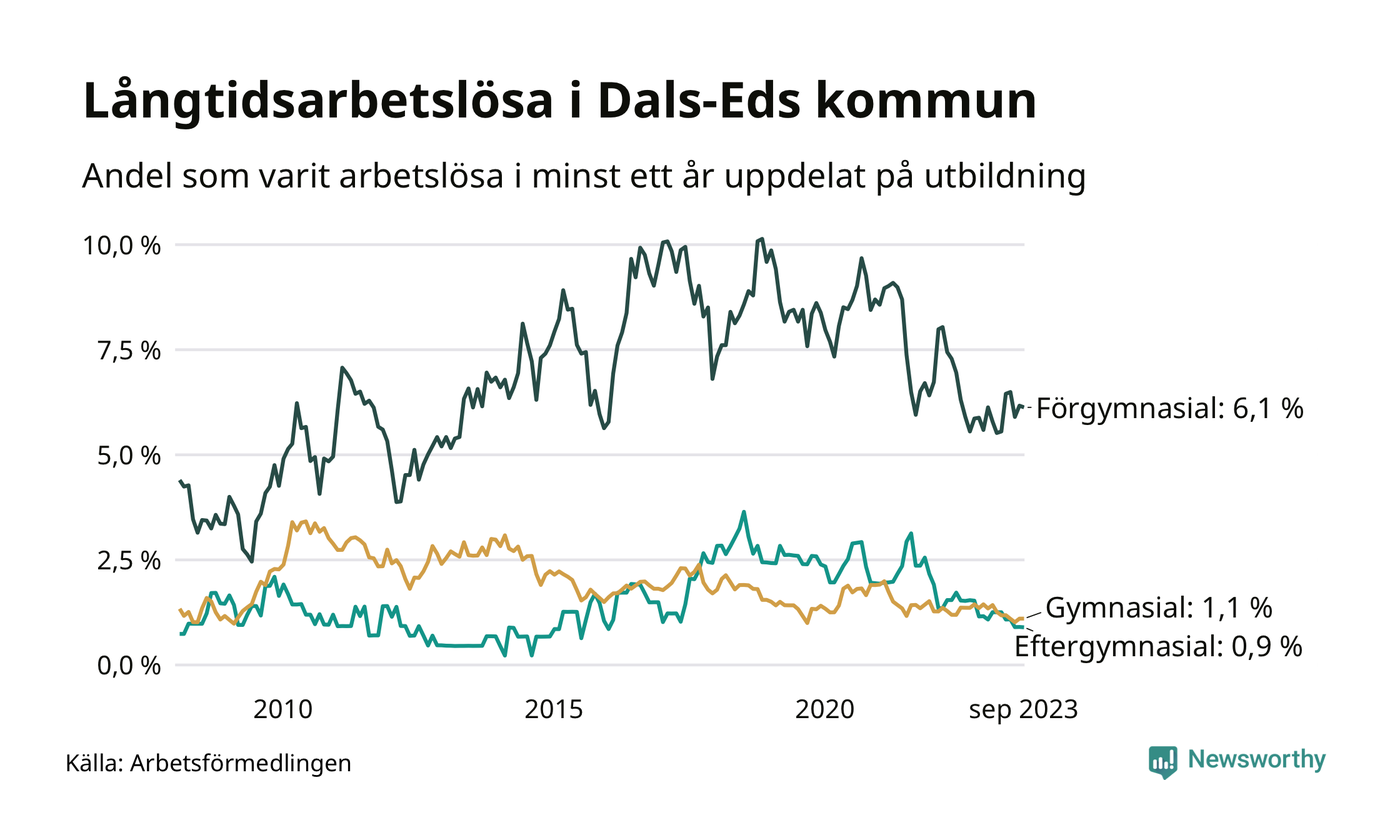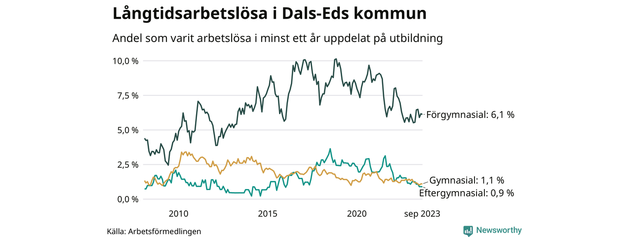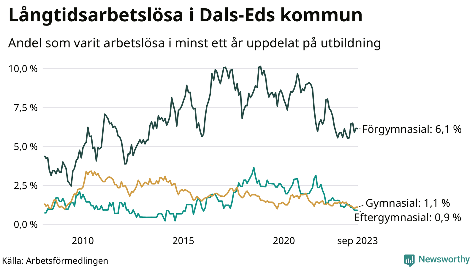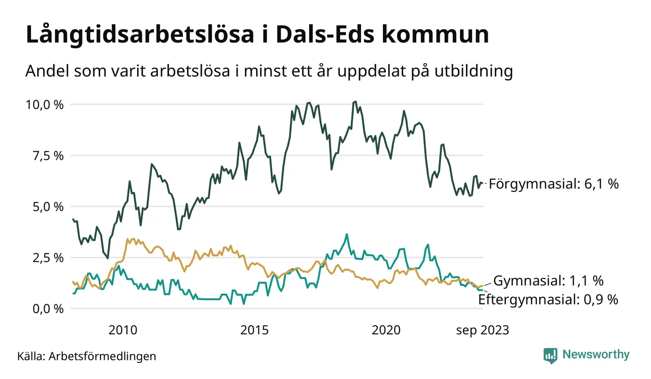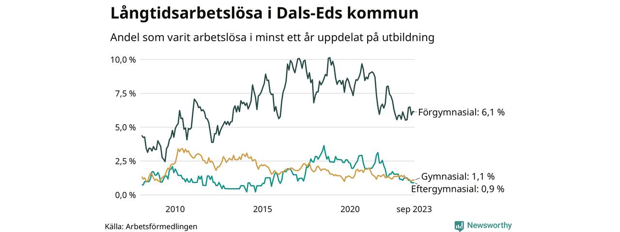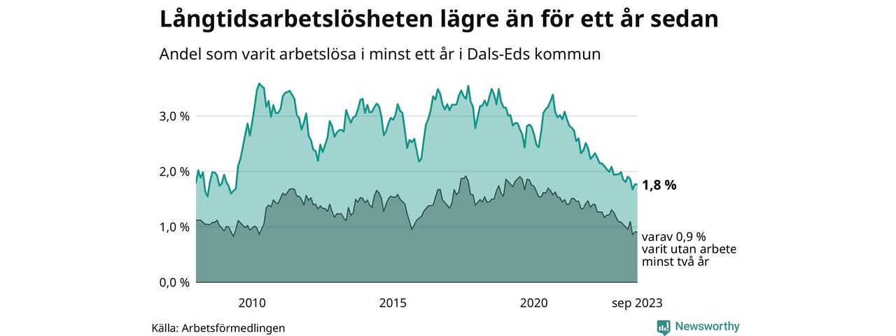 Andelen som varit utan arbete i minst ett år i Dals-Ed var lägre i september jämfört med samma månad för ett år sedan. Det visar Arbetsfömedlingens senaste månadsstatistik.