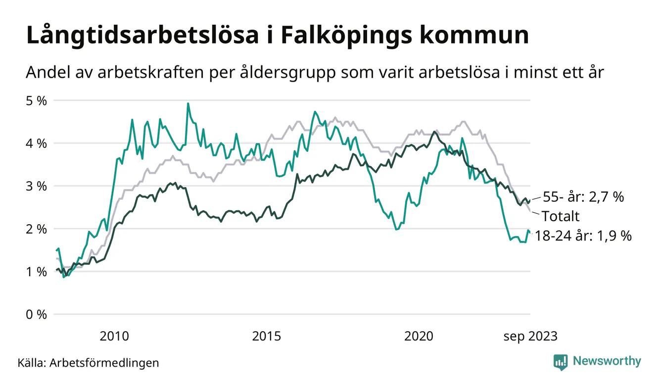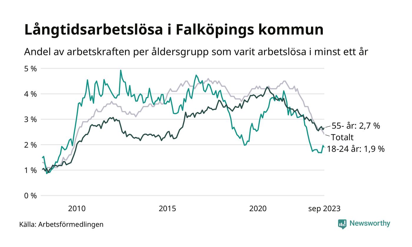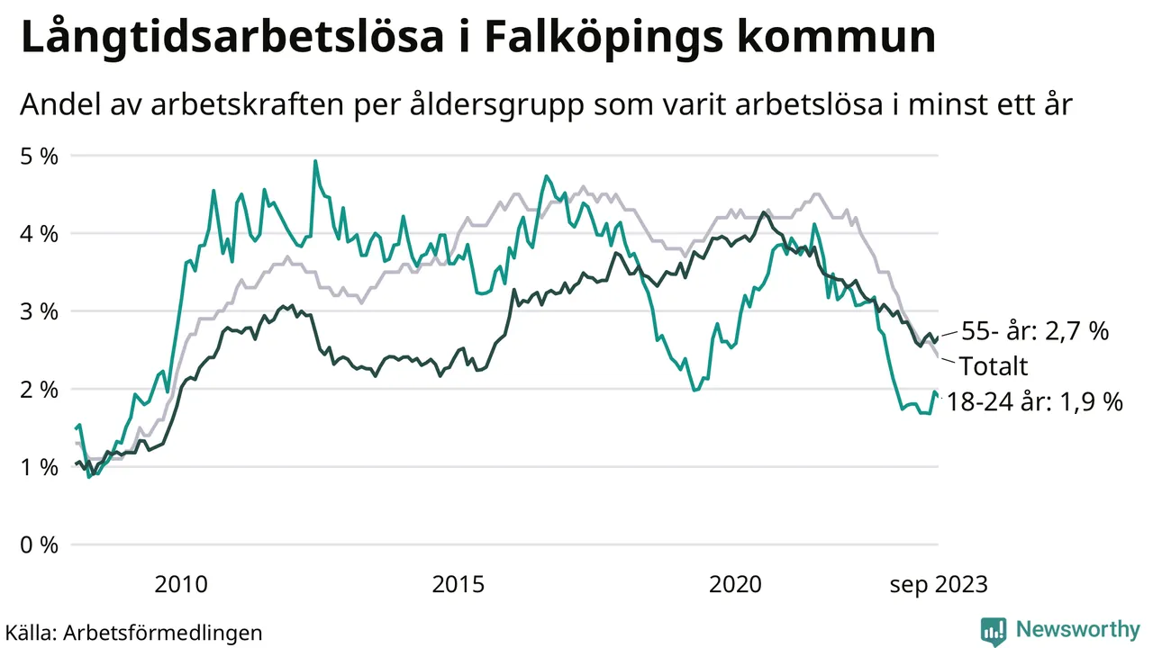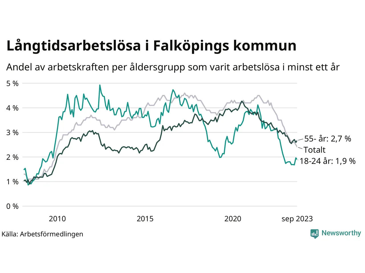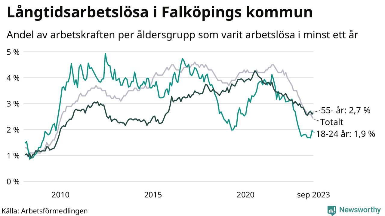 Av de 386 personerna som varit arbetslösa i mer än ett år i Falköpings kommun är 98 personer mellan 55 och 651 år och 32 är mellan 18 och 24 år. För den äldre gruppen är andelen arbetslösa 2,7 procent medan den i den yngre gruppen är 1,9 procent. Även i riket som helhet är långtidsarbetslösheten högre i gruppen äldre.