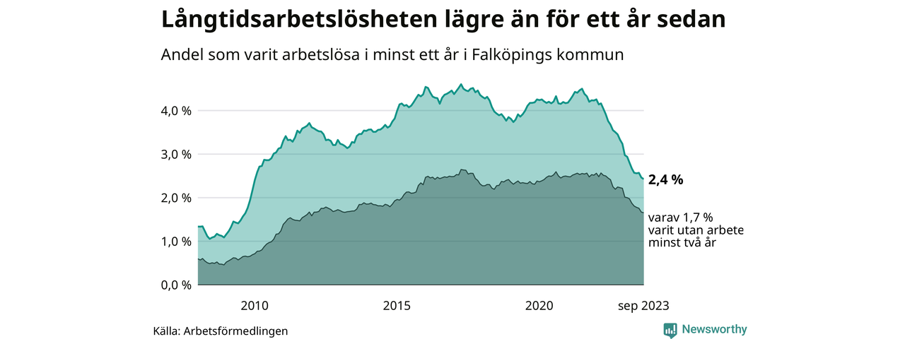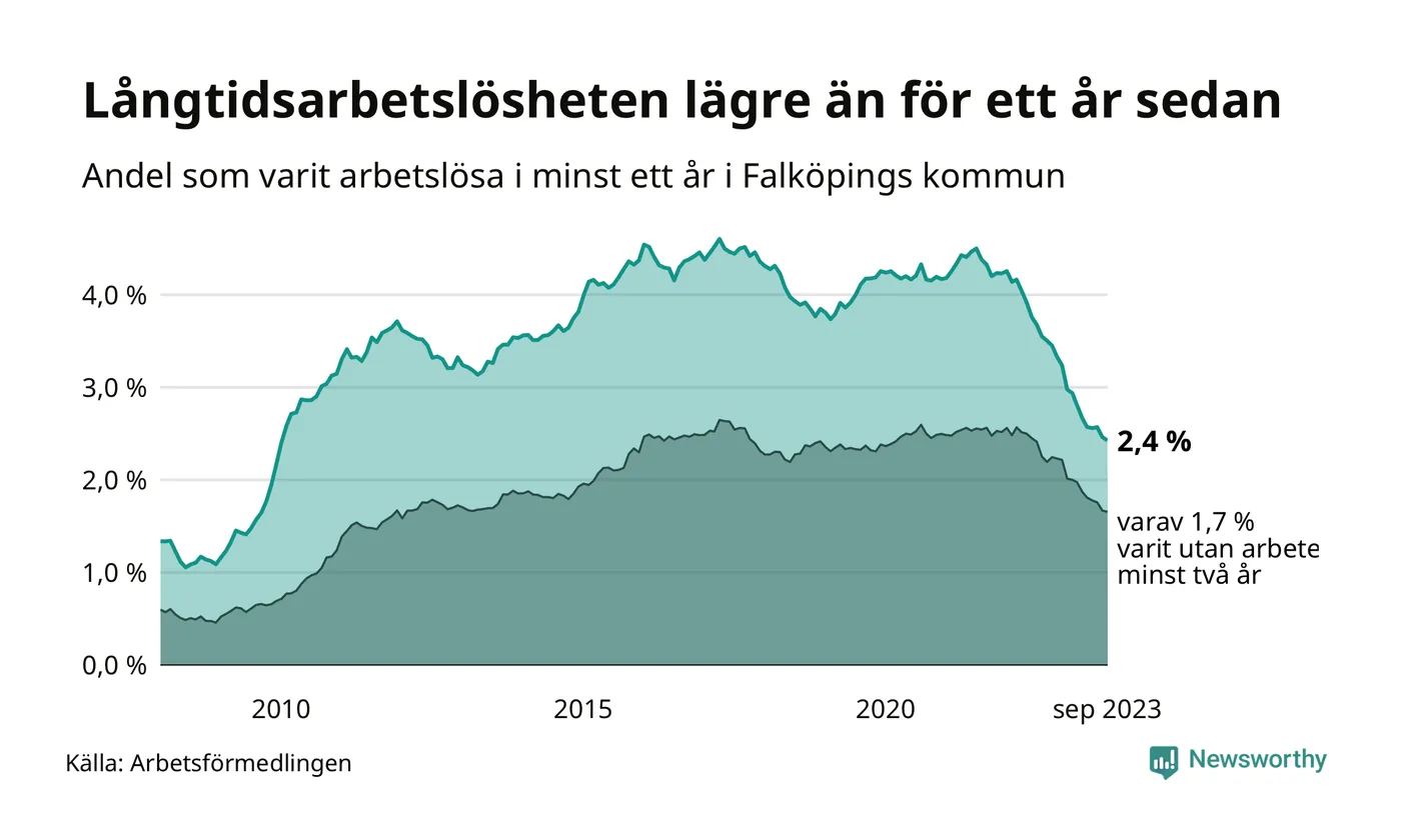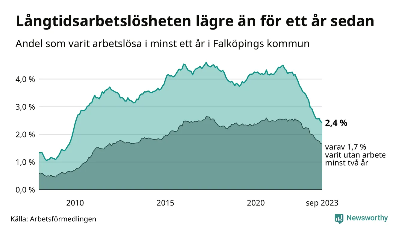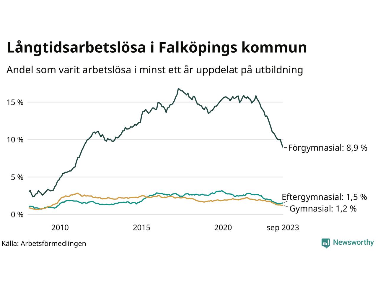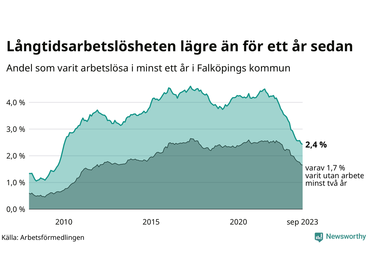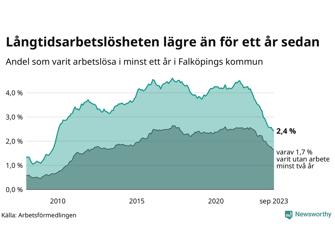 I september hade 386 Falköpingsbor varit arbetslösa i minst ett år, vilket är fem färre än månaden innan. 386 personer motsvarar 2,4 procent av arbetskraften i kommunen – andelen långtidsarbetslösa är 1,1 procentenheter lägre än samma månad för ett år sedan.
