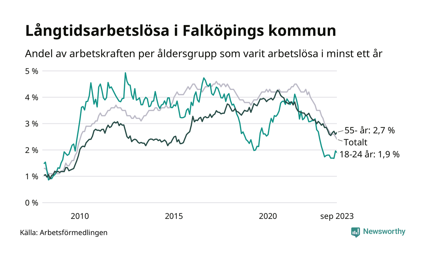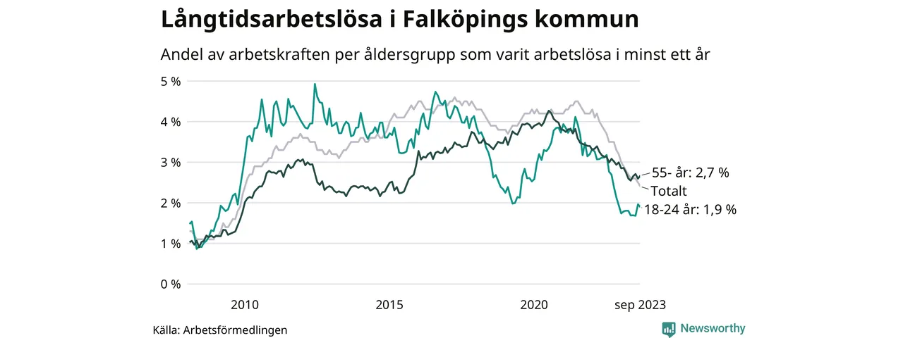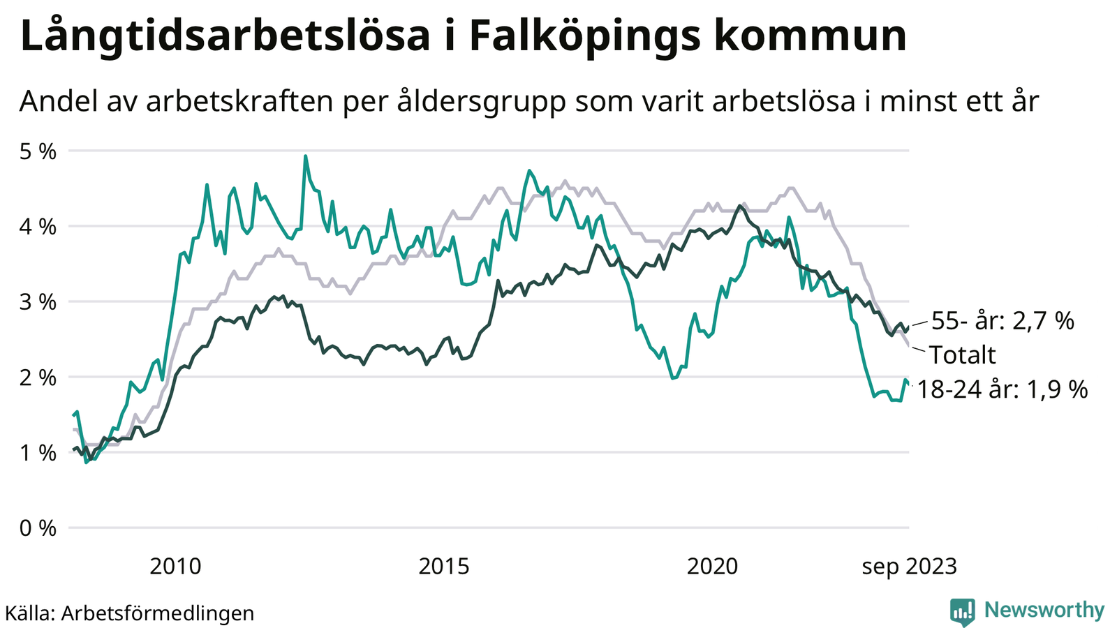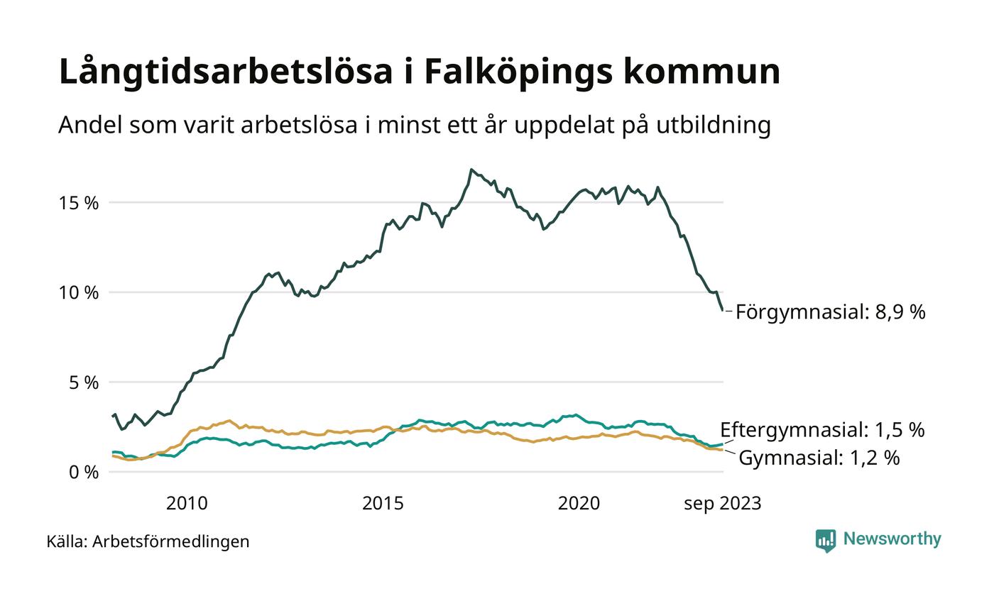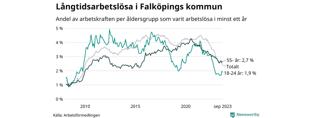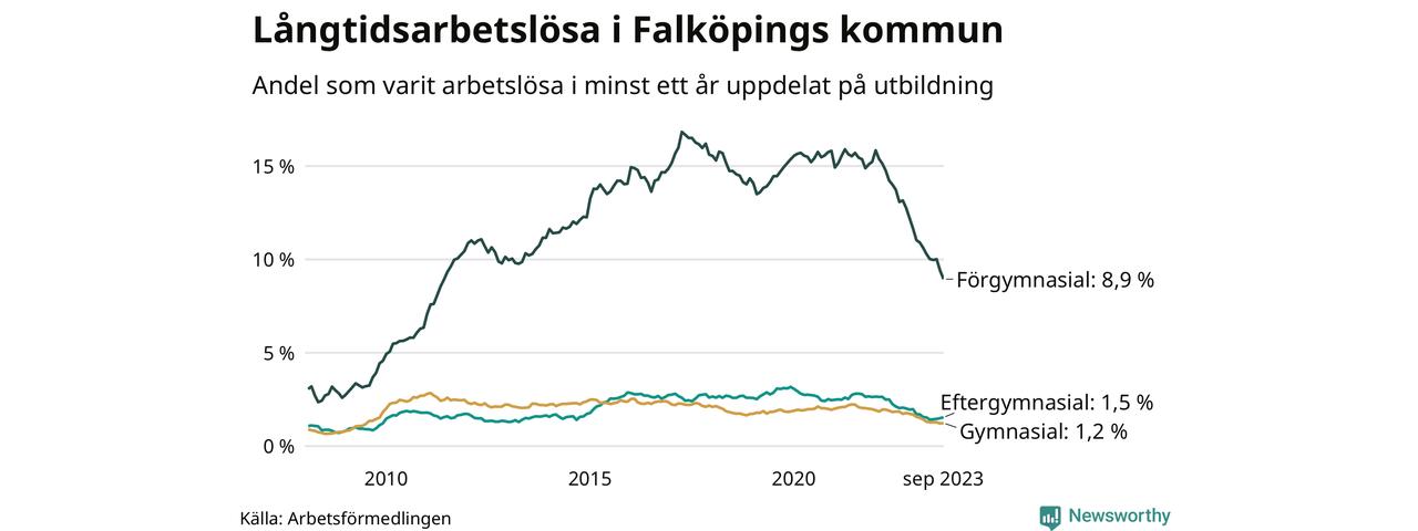 I september hade 386 Falköpingsbor varit arbetslösa i minst ett år, vilket är fem färre än månaden innan. 386 personer motsvarar 2,4 procent av arbetskraften i kommunen – andelen långtidsarbetslösa är 1,1 procentenheter lägre än samma månad för ett år sedan.