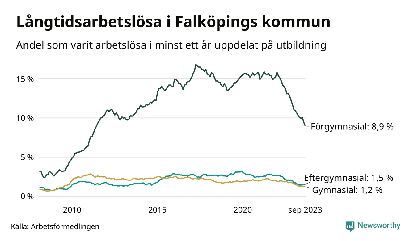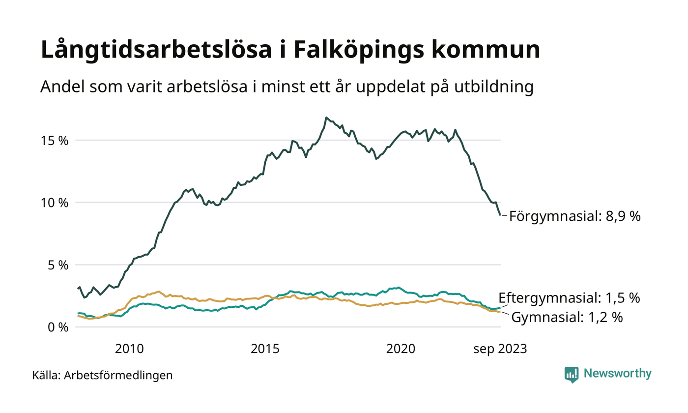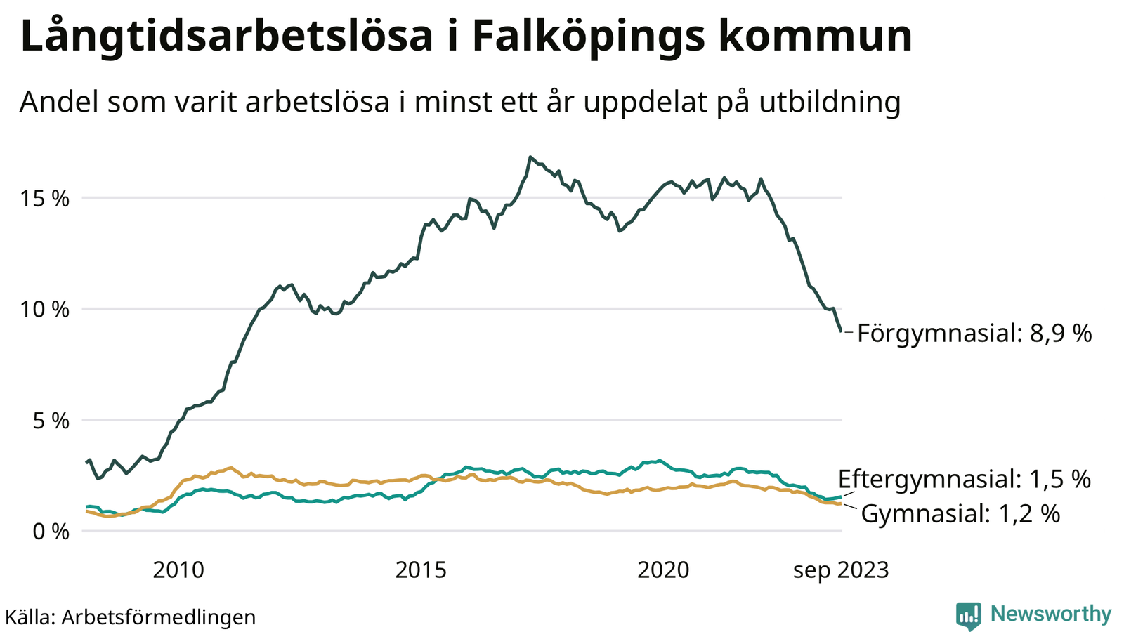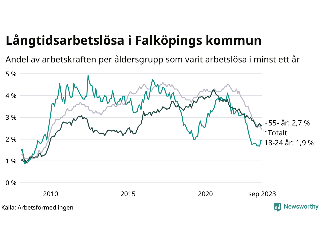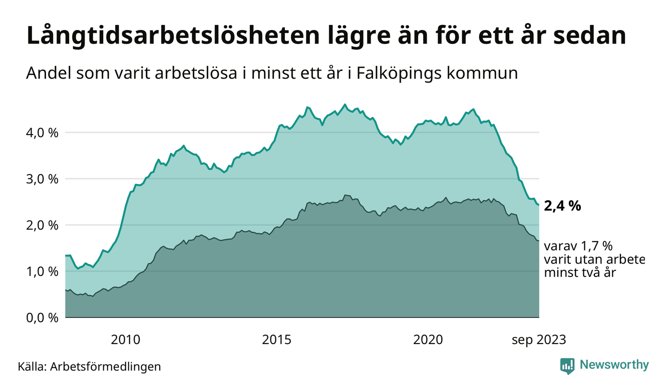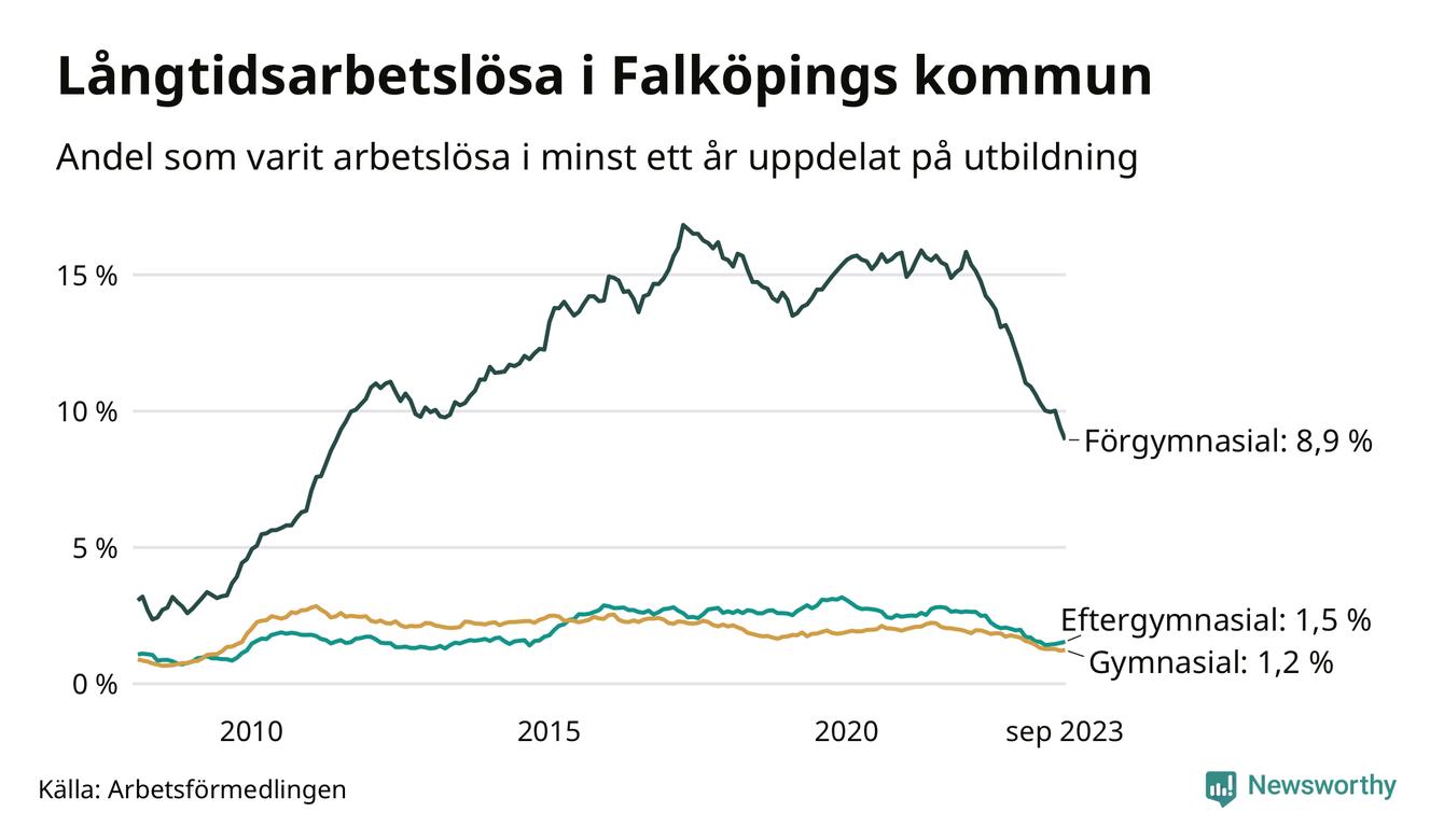 I september hade 386 Falköpingsbor varit arbetslösa i minst ett år, vilket är fem färre än månaden innan. 386 personer motsvarar 2,4 procent av arbetskraften i kommunen – andelen långtidsarbetslösa är 1,1 procentenheter lägre än samma månad för ett år sedan.