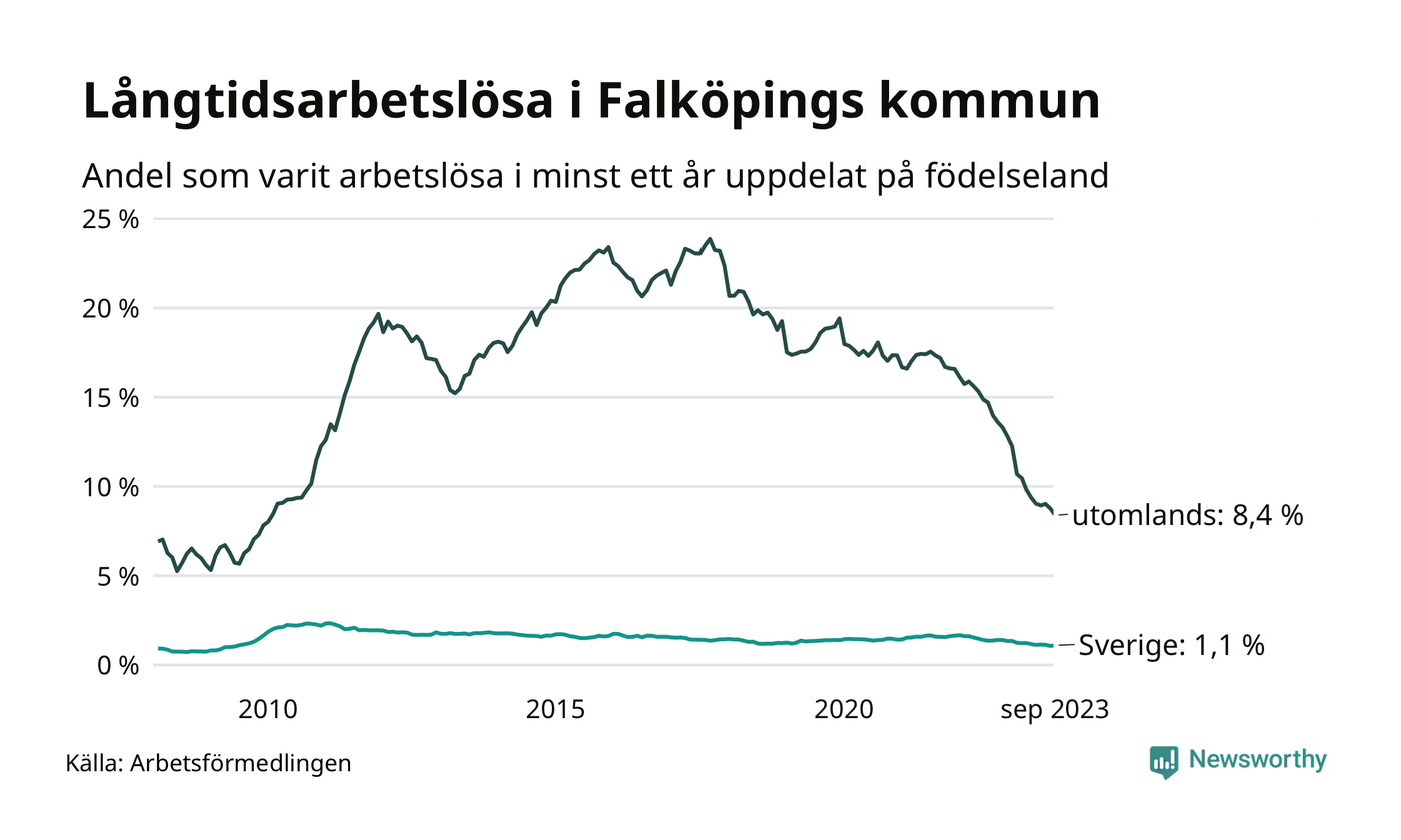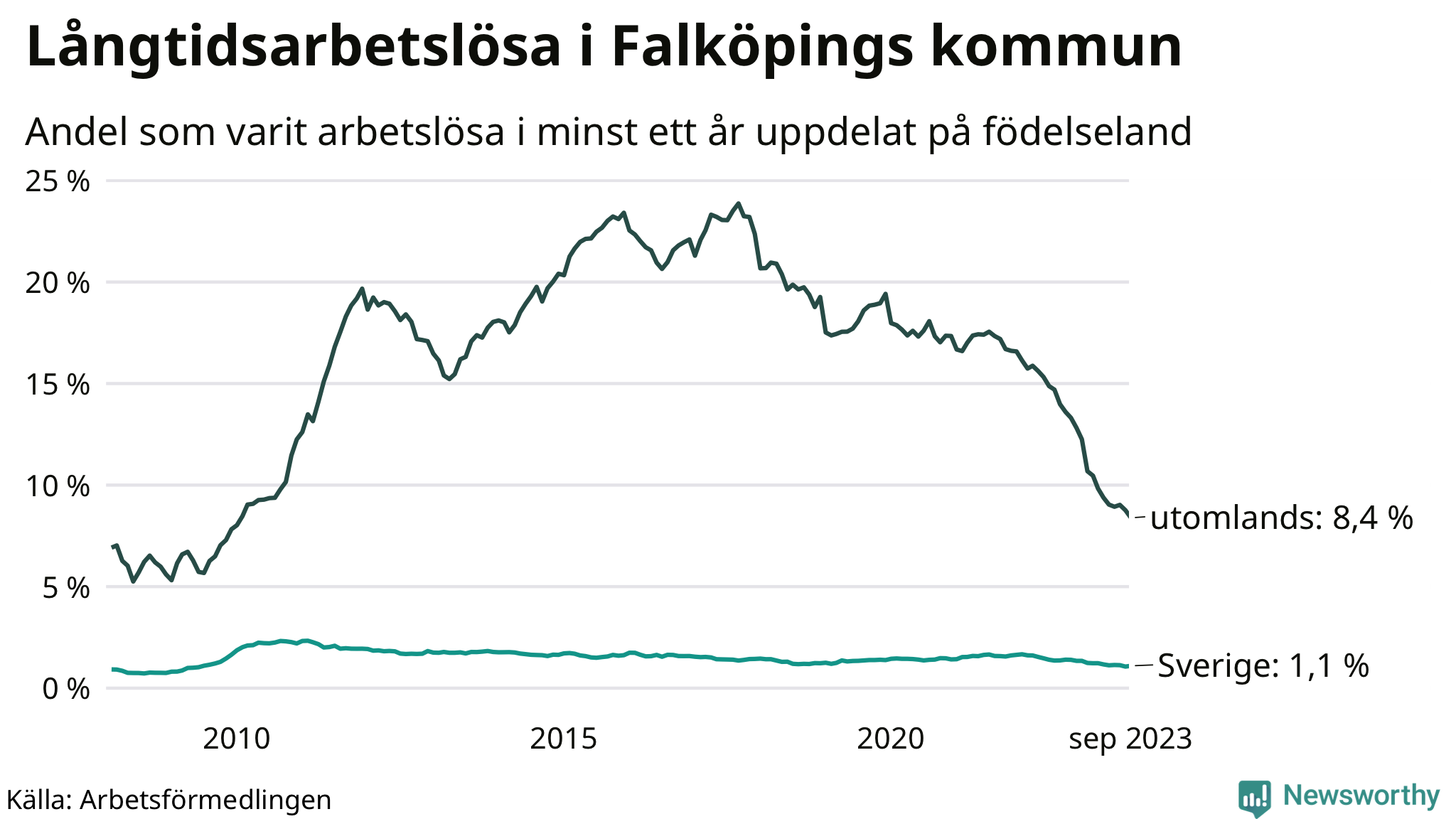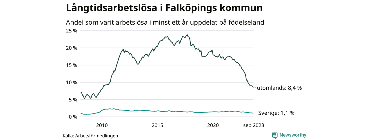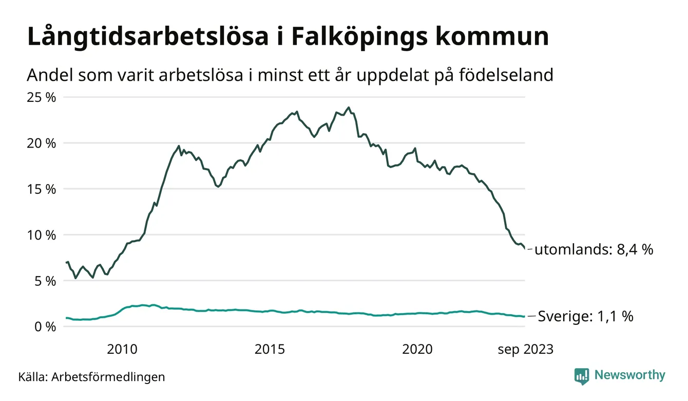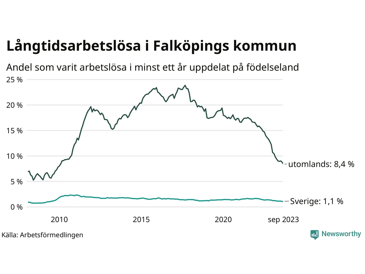 143 av de långtidsarbetslösa i Falköping är födda i Sverige, medan 243 är födda utomlands. Det innebär att långtidsarbetslösheten bland Sverigefödda är 1,1 procent, medan den är åtta gånger så hög – 8,4 procent – bland födda utomlands. Även i riket som helhet är arbetslösheten högre bland utrikesfödda.