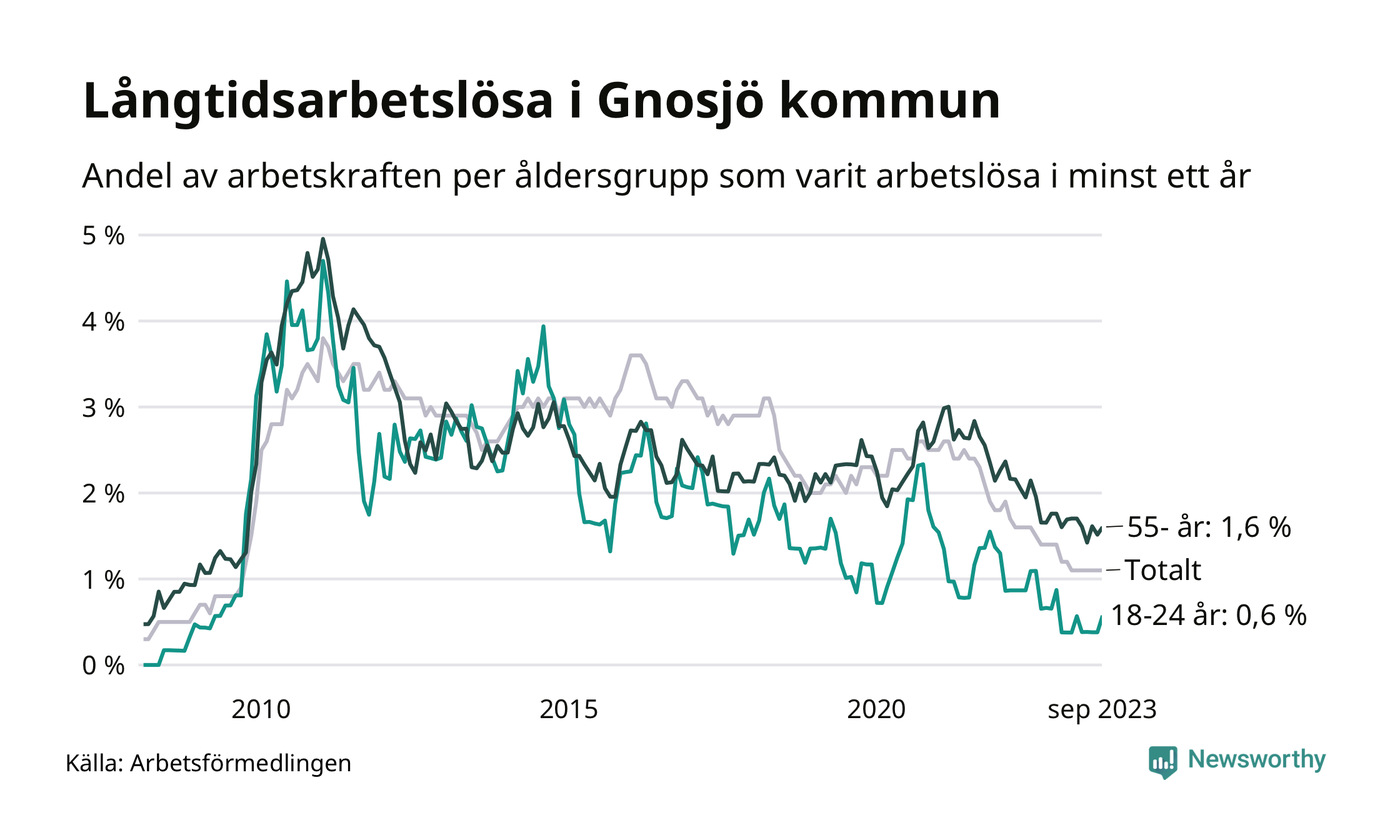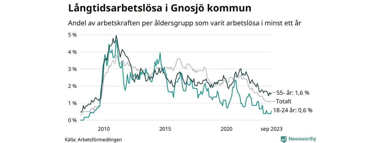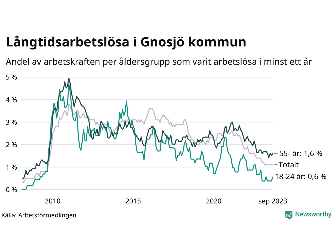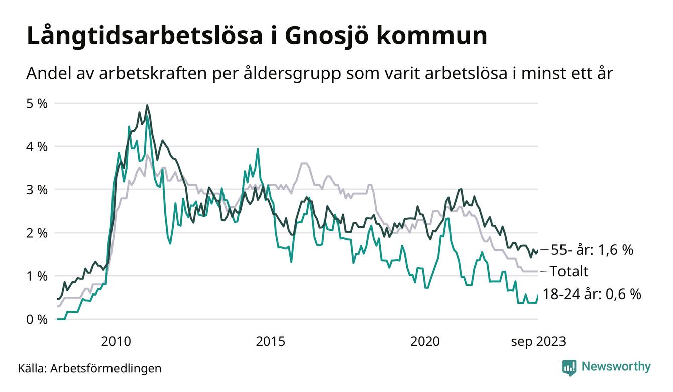 Av de 55 personerna som varit arbetslösa i mer än ett år i Gnosjö kommun är 17 personer mellan 55 och 651 år och tre är mellan 18 och 24 år. För den äldre gruppen är andelen arbetslösa 1,6 procent medan den i den yngre gruppen är 0,6 procent. Även i riket som helhet är långtidsarbetslösheten högre i gruppen äldre.