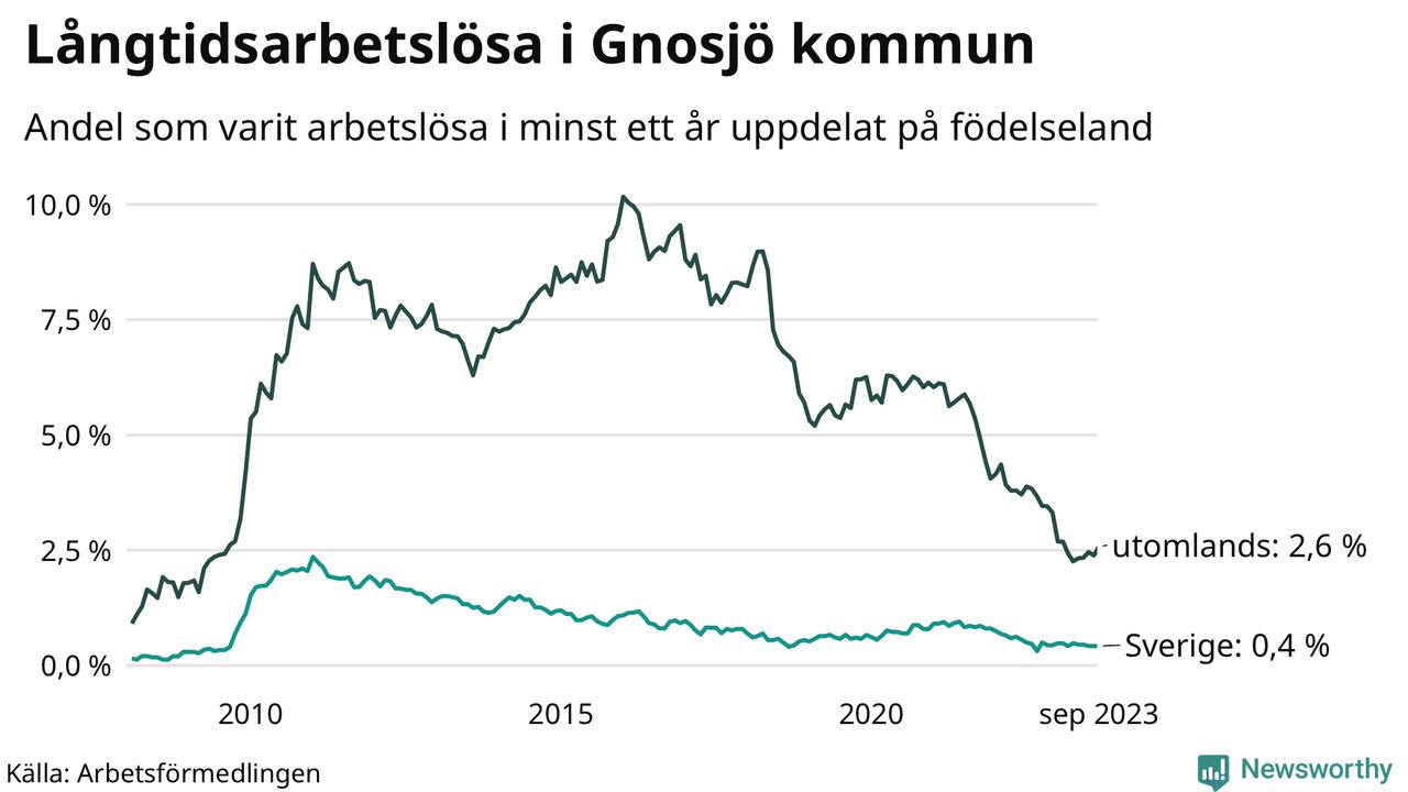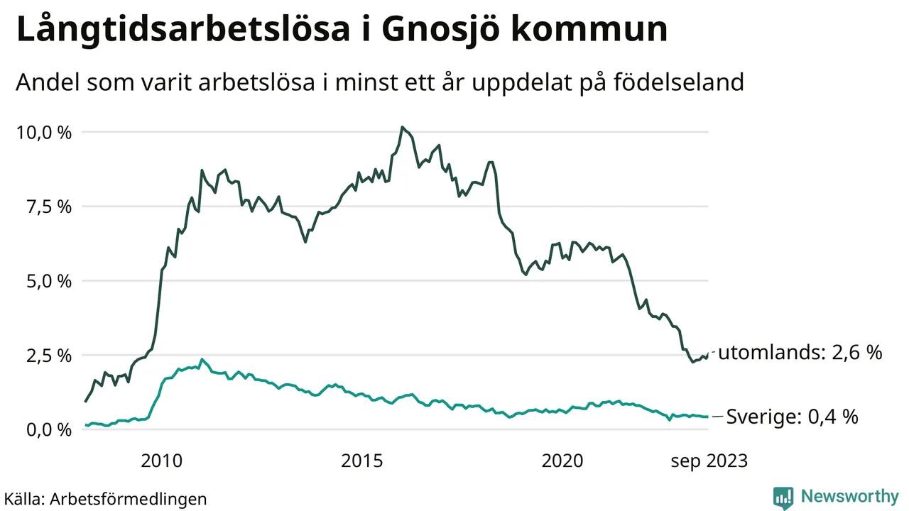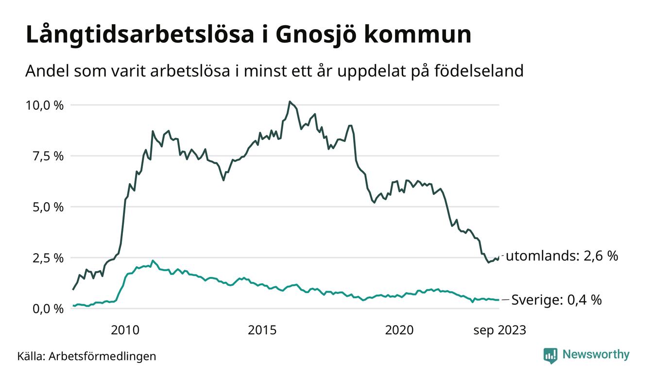 14 av de långtidsarbetslösa i Gnosjö är födda i Sverige, medan 41 är födda utomlands. Det innebär att långtidsarbetslösheten bland Sverigefödda är 0,4 procent, medan den är sju gånger så hög – 2,6 procent – bland födda utomlands. Även i riket som helhet är arbetslösheten högre bland utrikesfödda.