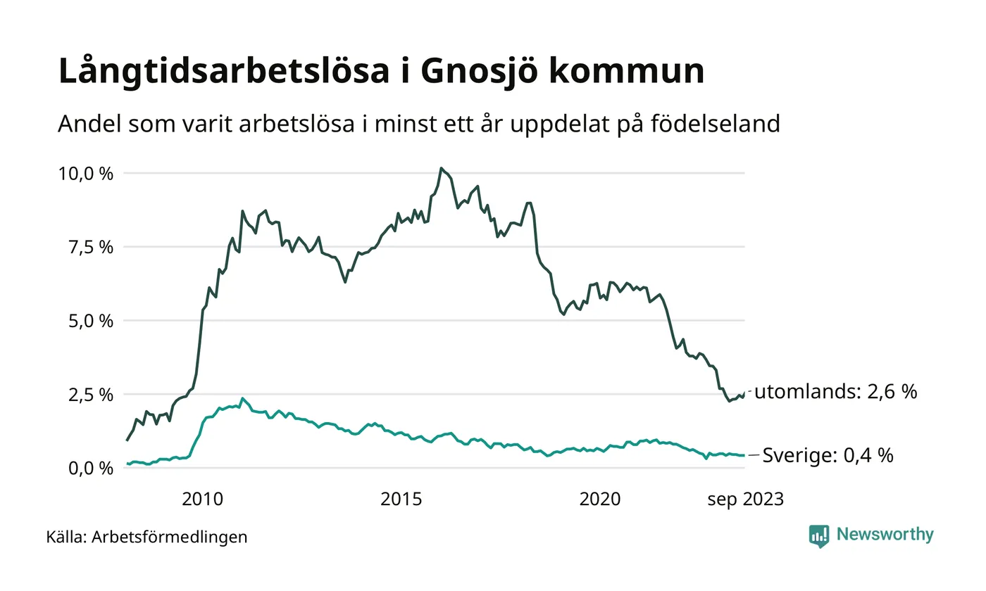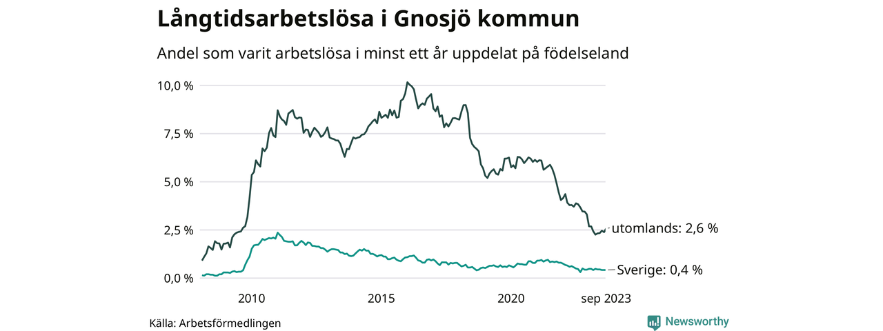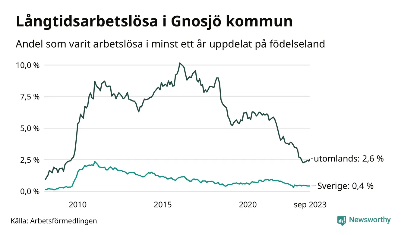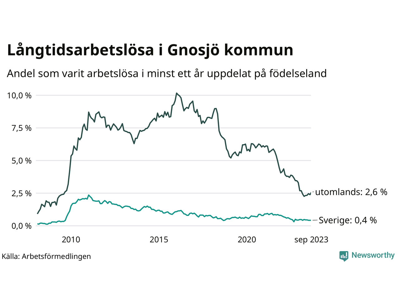 14 av de långtidsarbetslösa i Gnosjö är födda i Sverige, medan 41 är födda utomlands. Det innebär att långtidsarbetslösheten bland Sverigefödda är 0,4 procent, medan den är sju gånger så hög – 2,6 procent – bland födda utomlands. Även i riket som helhet är arbetslösheten högre bland utrikesfödda.