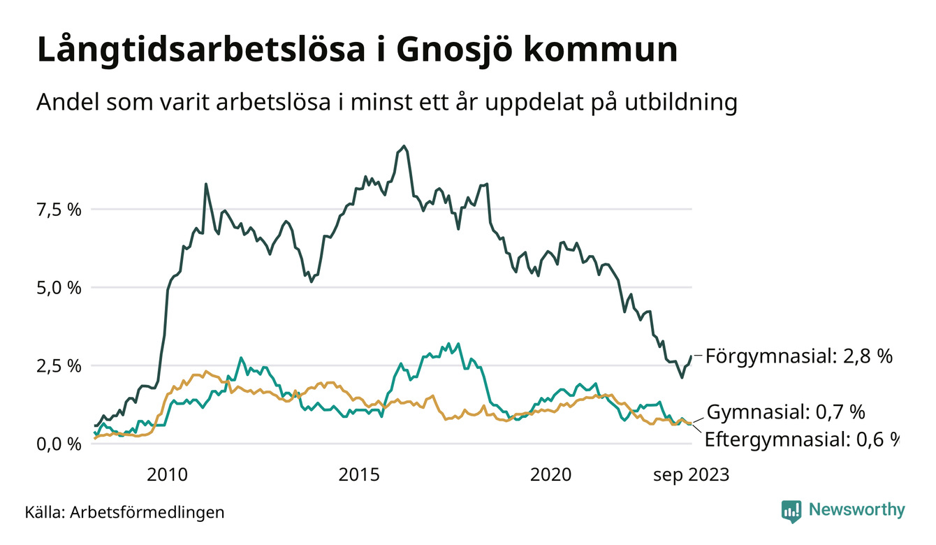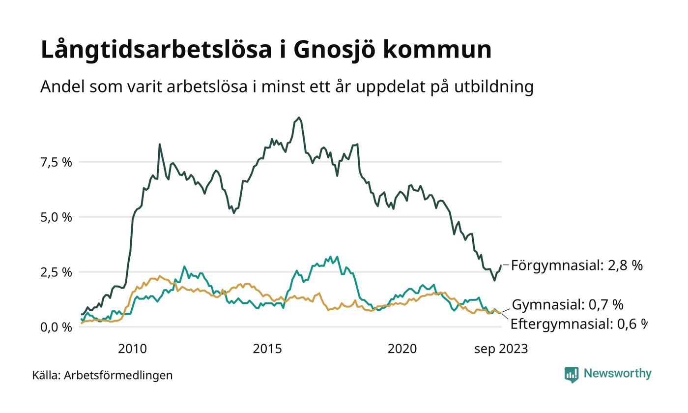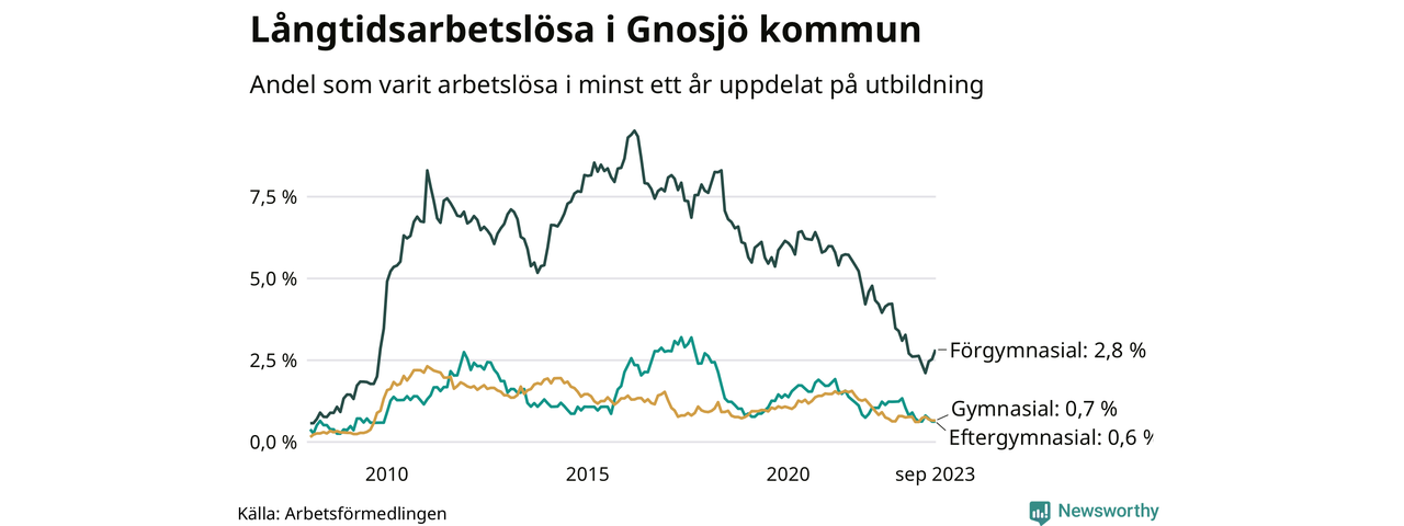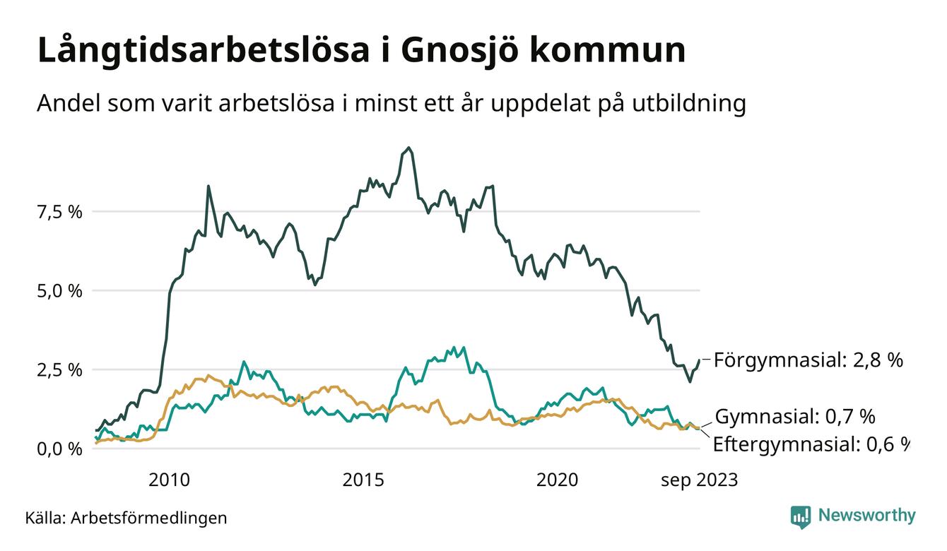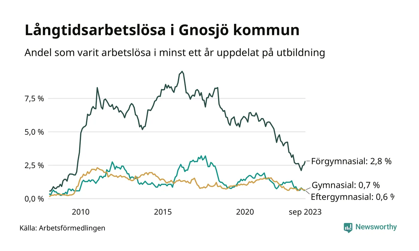 Andelen som varit utan arbete i minst ett år i Gnosjö i september var lägre än för ett år sedan. Men jämfört med i augusti har antalet långtidsarbetslösa ökat.