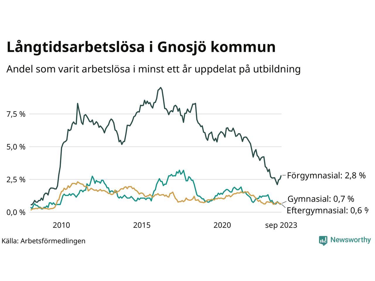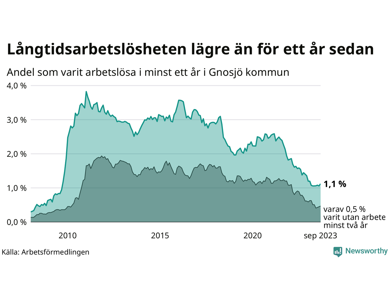 I september hade 55 Gnosjöbor varit arbetslösa i minst ett år, vilket är tre fler än månaden innan. 55 personer motsvarar 1,1 procent av arbetskraften i kommunen – andelen långtidsarbetslösa är 0,3 procentenheter lägre än samma månad för ett år sedan. Gnosjö tillhör de kommuner med lägst andel långtidsarbetslösa i hela landet just nu.