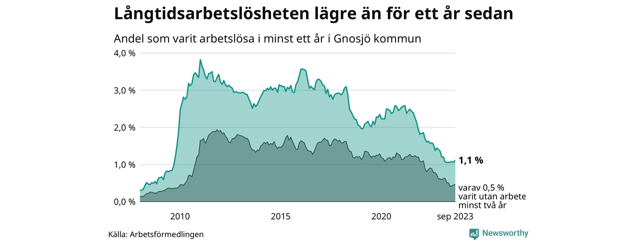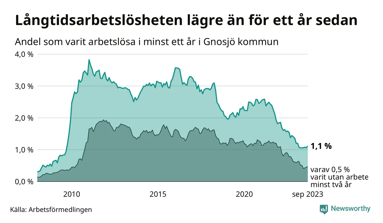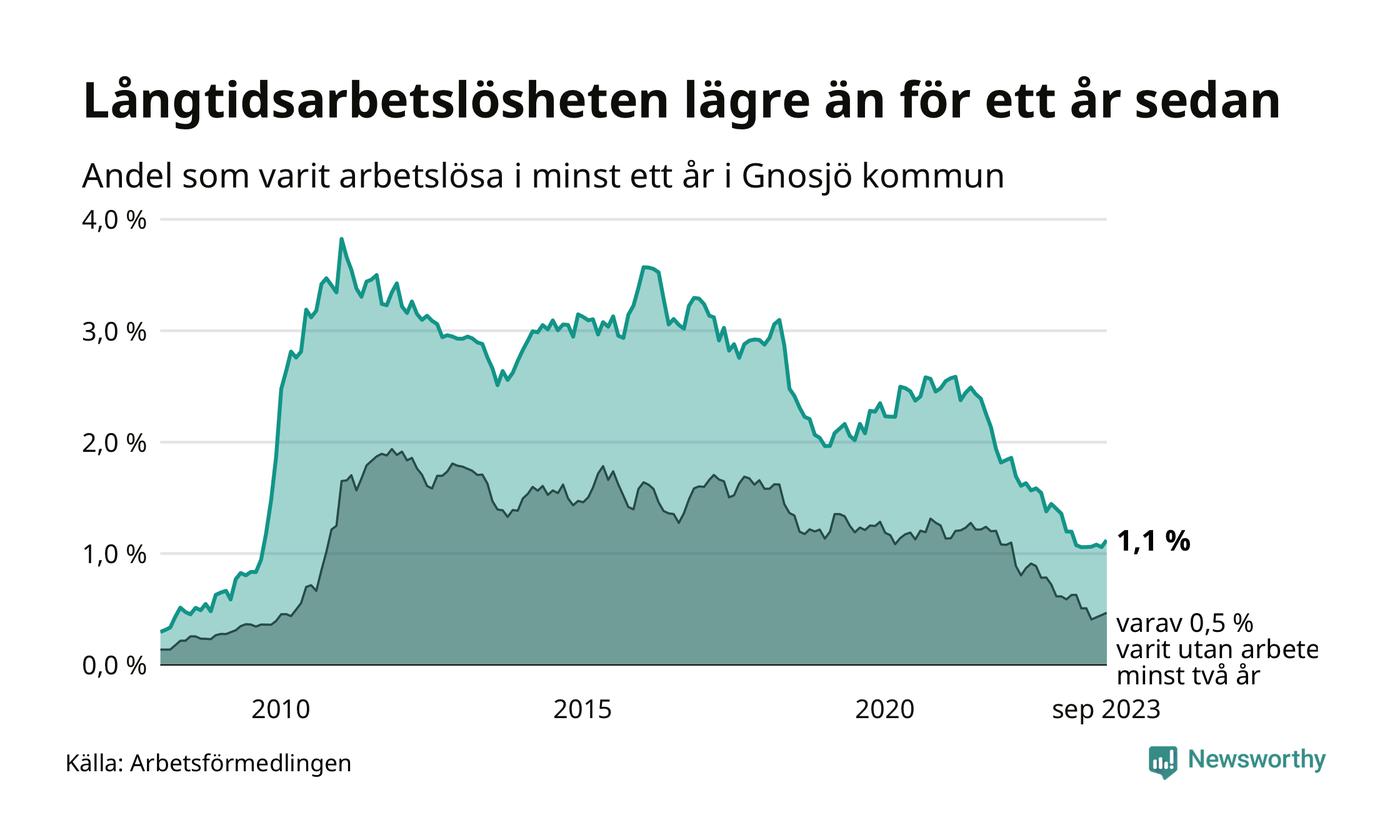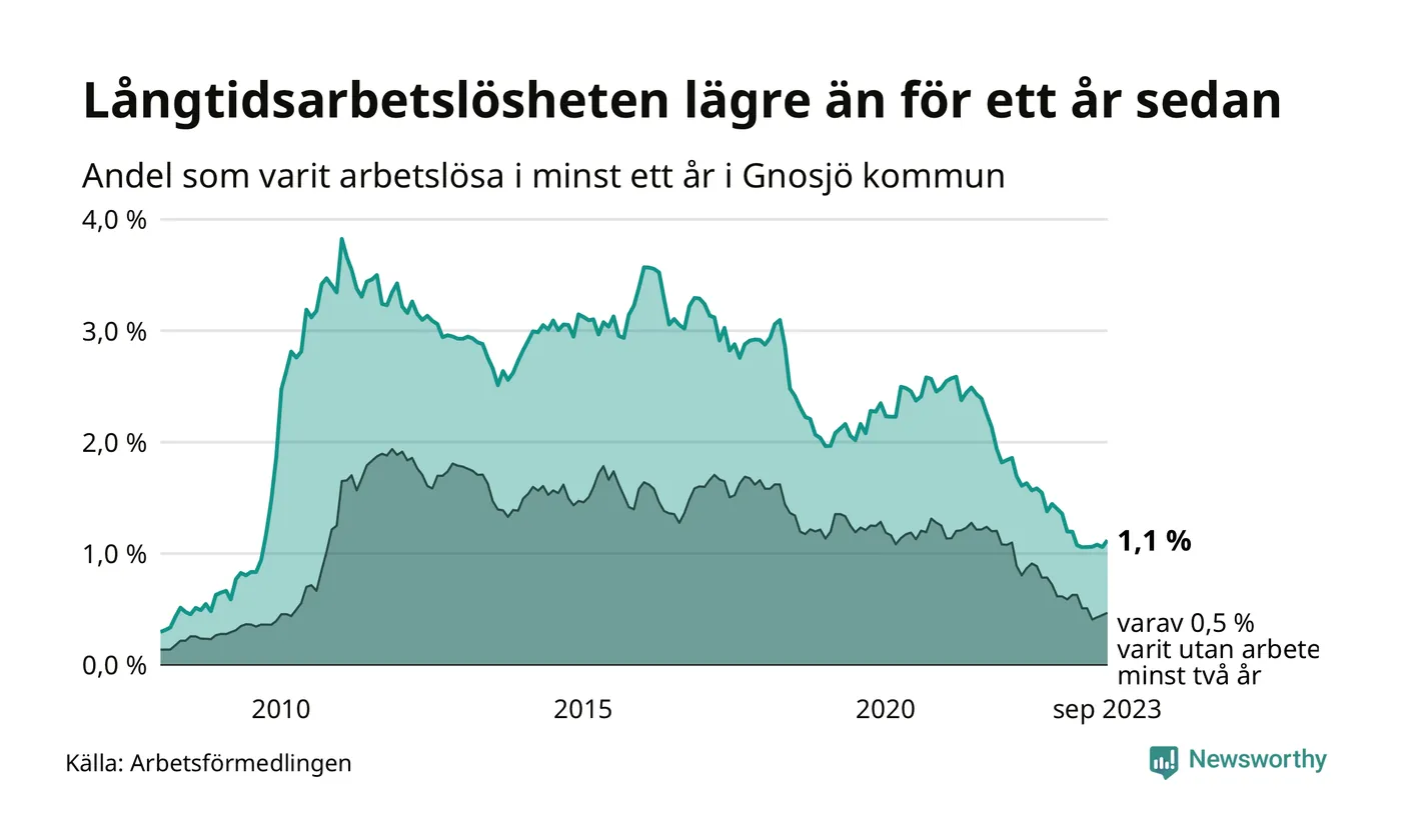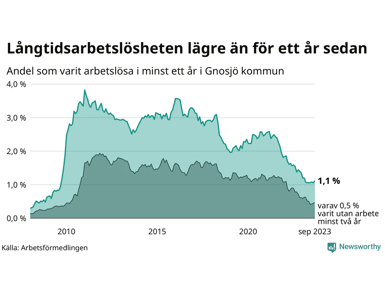Andelen långtidsarbetslösa i Gnosjö är den lägsta i Jönköpings län. I Nässjö finns länets högsta långtidsarbetslöshet, 3,1 procent. I Jönköpings län som helhet hade 3 581 personer (1,9 procent) varit arbetslösa i minst ett år i september. Det är 94 personer fler än månaden innan.